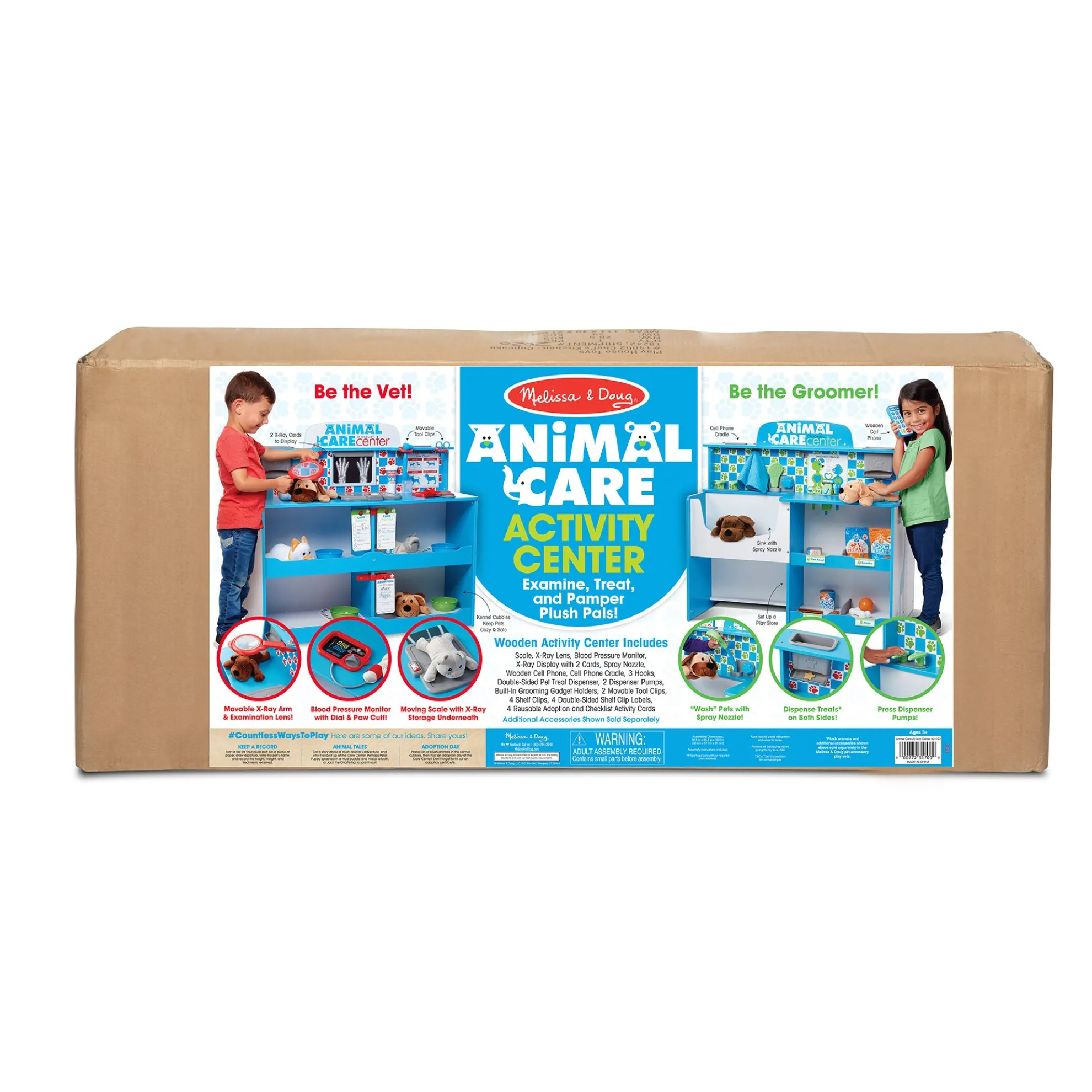 This is the perfect space for caring for furry friends! With a veterinarian side and a groomer side, plush pets (not included) can be examined, treated, and pampered for endless hours of imaginative fun. The sturdy wooden play center features an “x-ray” lens with two removable x-rays, pet scale, blood pressure monitor, sink, treat chute, pump bottle dispenser, and lots of storage. There are hooks and holders for lots of accessories. Detailed assembly instructions are included (assembles with just a Phillips head screwdriver, not included). Kids three and older will love having their very own space to nurture and care for their plush pals!
