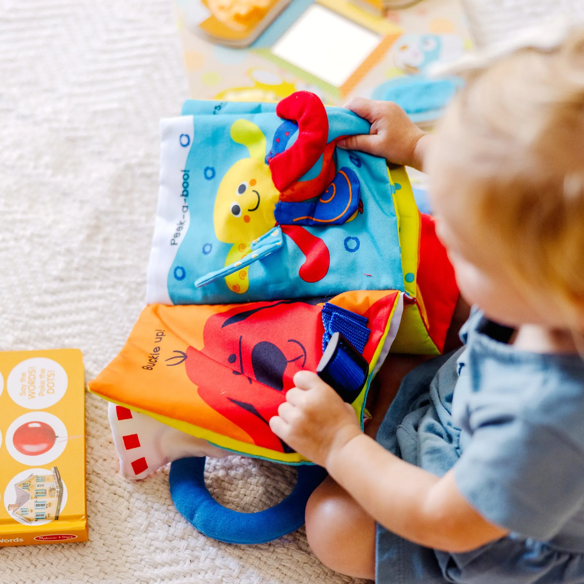 Melissa & Doug themed sets offer a great value and make a thoughtful gift to spark childrens imagination and wonder! Give the gift of firsts with this collection of three early-learning activities for babies and toddlers. The 10-page Poke-A-Dot First Words book invites kids to pop along as they explore full-color photographs of familiar objects and their names, such as red shoes, a yellow banana, and toy blocks. The Peek-A-Boo Pets Wooden Touch & Feel Puzzle stimulate the senses with four furry, textured animal friends (a kitten, puppy, bunny, and bird) that stand up for pretend play or fit into the sturdy wooden puzzle board, surrounding a child-safe mirror. Turn the soft pages of My First Activity Book to discover fun first activities like buttoning, buckling, peek-a-boo, counting, matching, and telling time. The collection of fun, interactive, multi-textured toys helps promote sensory development, fine motor skills, color recognition, and other early learning skills.