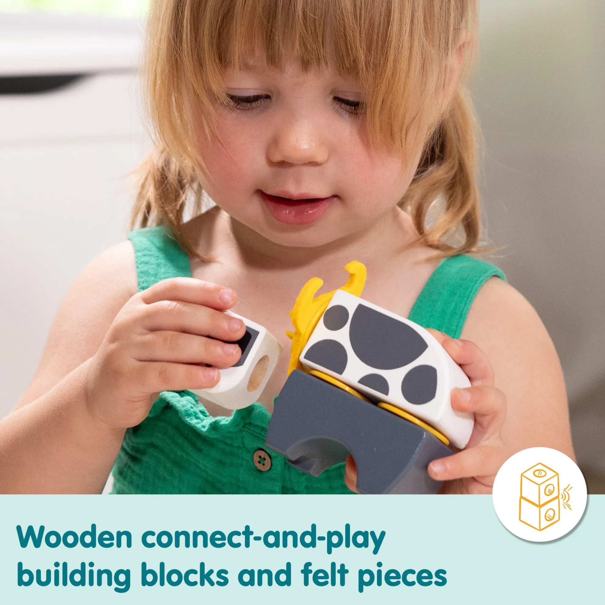- Farm Play Set includes 21 wooden blocks, 2 play figures, 22 connectors, felt horns and chicken wings with built-in connectors, trailer hitch, windshield, 6 wheels, large tractor wheels, and illustrated play guide for putting together a tractor and trailer, cow, sheep, pig, horse, chicken, food, and hay bale