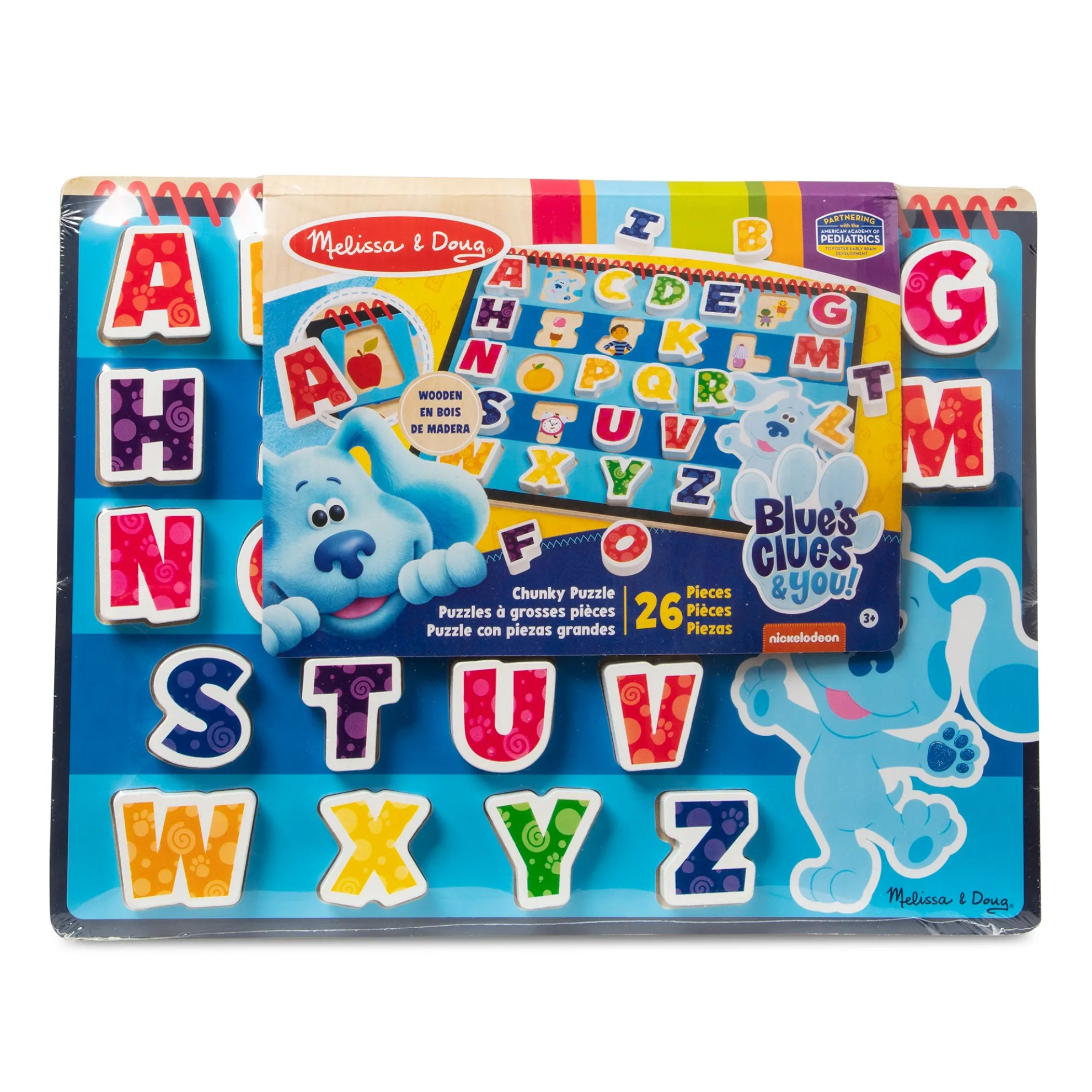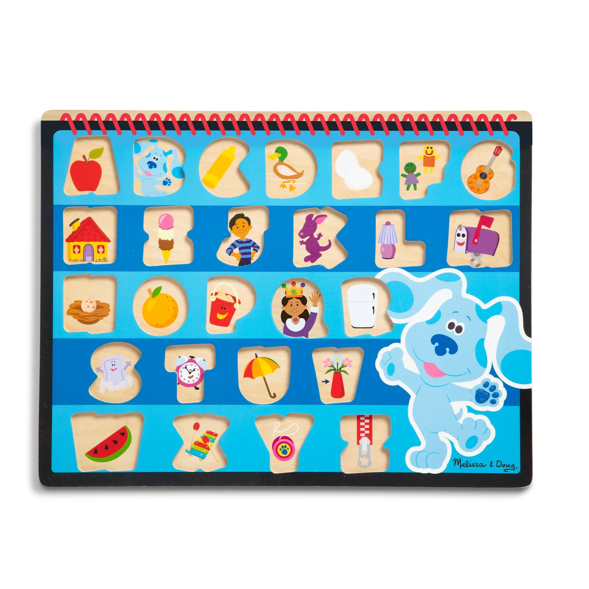 - 26-piece wooden chunky puzzle with letters A-Z and a sturdy wooden puzzle board with Blue’s Clues & You! friends and elements