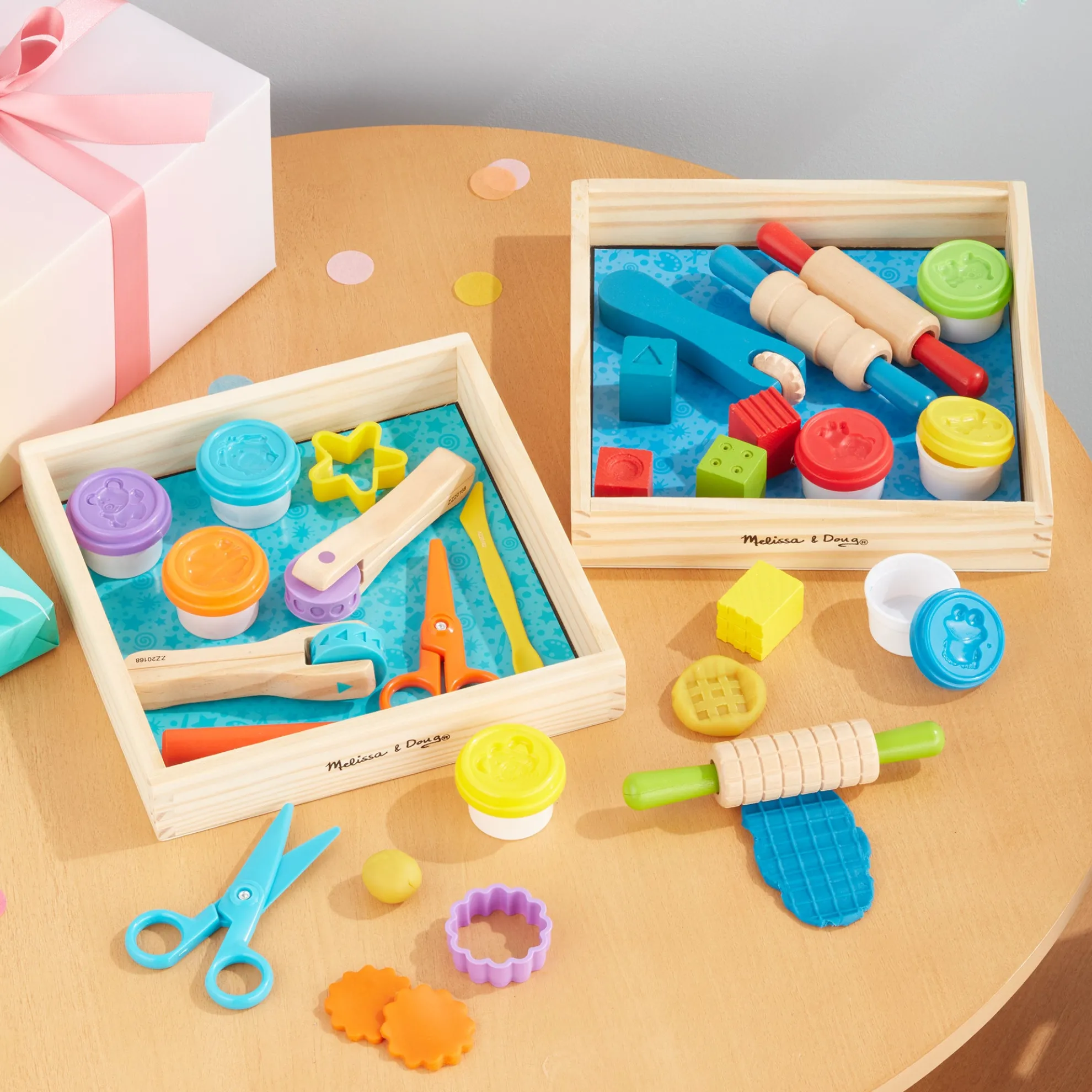 Let the good times roll! Featuring exciting tools and vibrantly colored modeling dough, these two sets invite children to cut different shapes with zigzag and straight scissors, sculpt circles and triangles with pattern wheels and patterned rolling pins, and mold adorable figures by turning over the covered tubs and pressing. Each set comes with four tubs of dough (red, yellow, blue, and green in one and purple, orange, yellow, and blue in the other) with different patterns on all the lids. There are eight sculpting tools in one set and nine in the other for endless way to sculpt, shape, mold, and more!