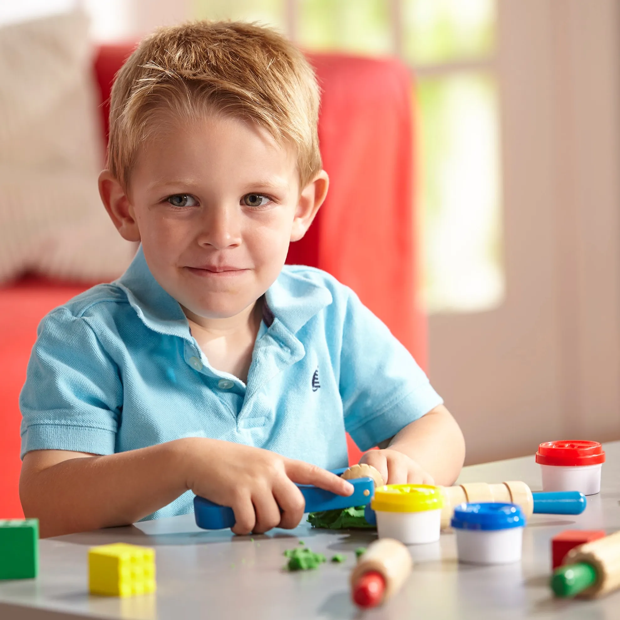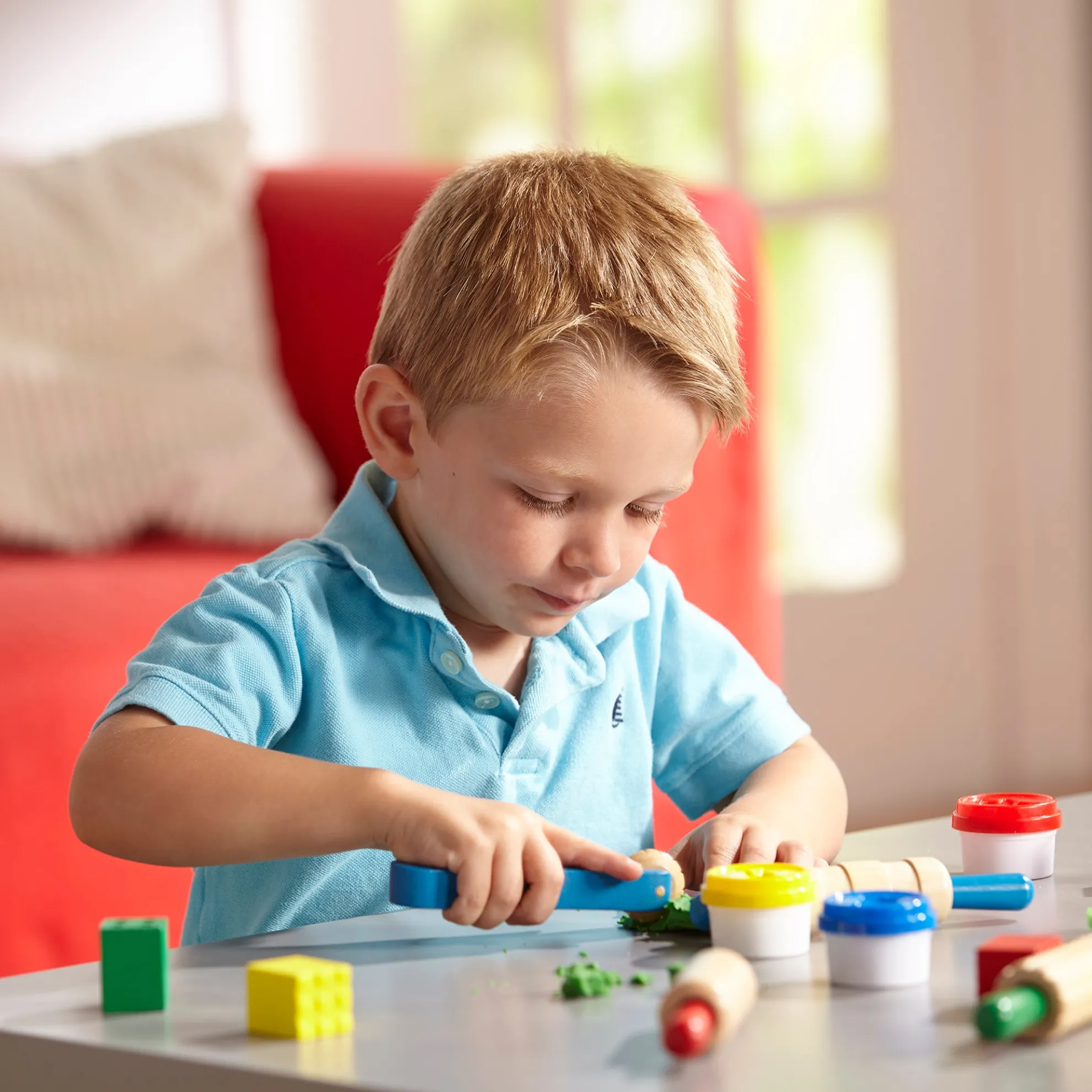 - Includes 5 wooden stamping cubes, 3 rolling pins, 4 tubs of modeling dough, 1 patterned wheel press
