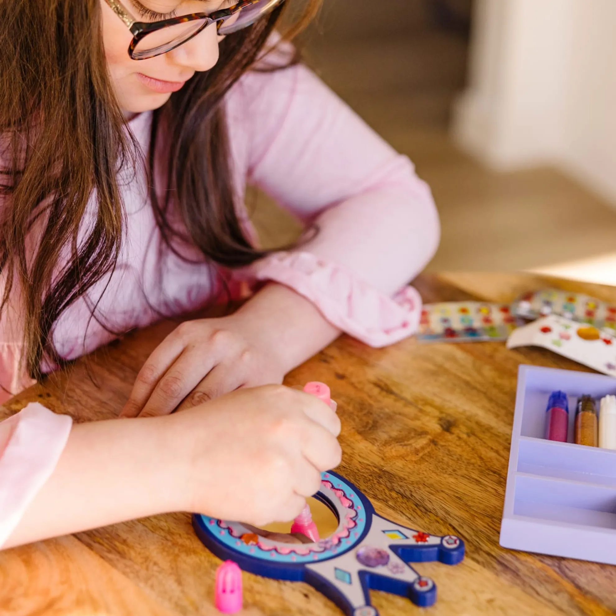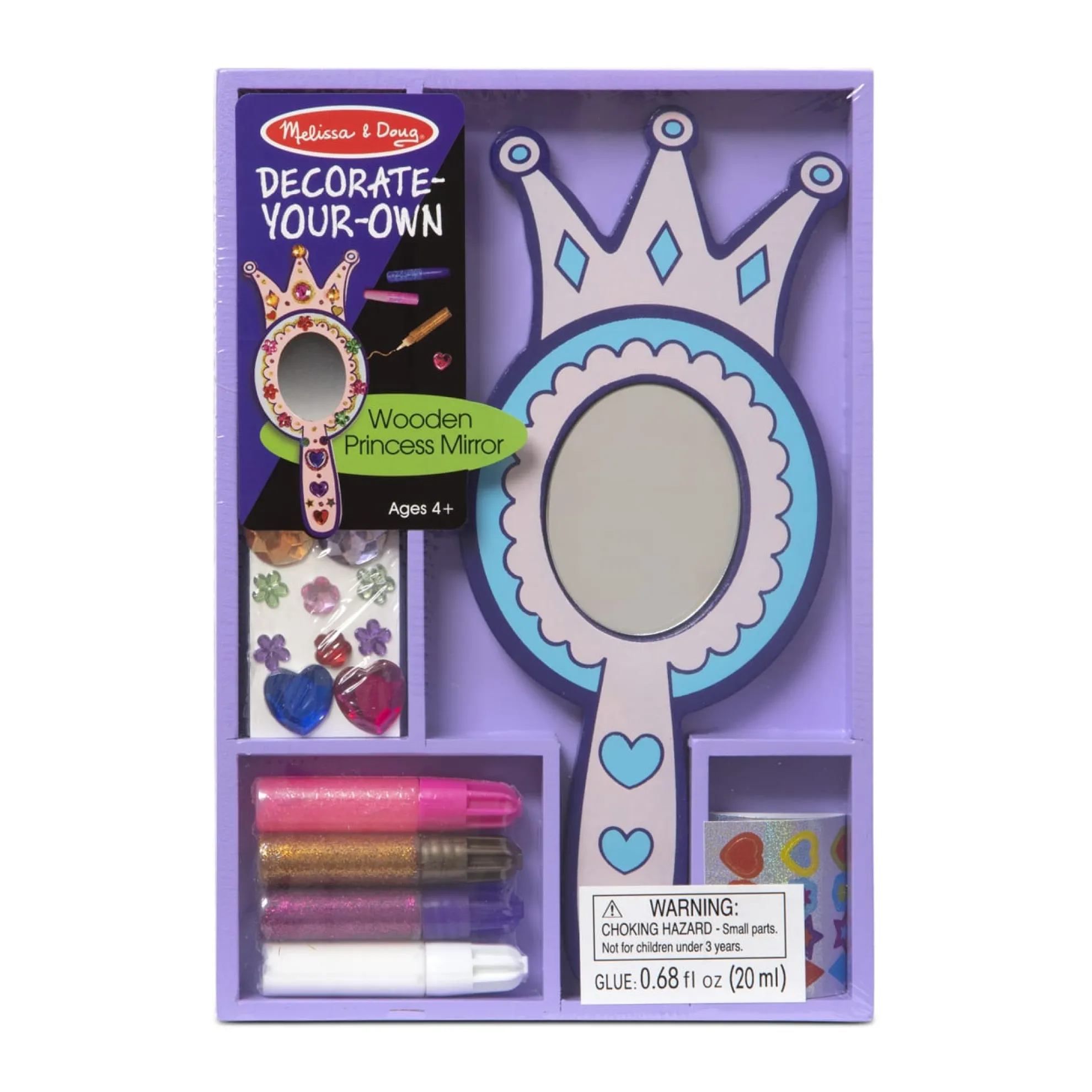 Your reflection will be regal in this glamorous wooden mirror set! This creative kit includes a wooden mirror, glitter and craft glue, sparkling gems and stickers to personalize your project. A perfect activity for parties or rainy days!