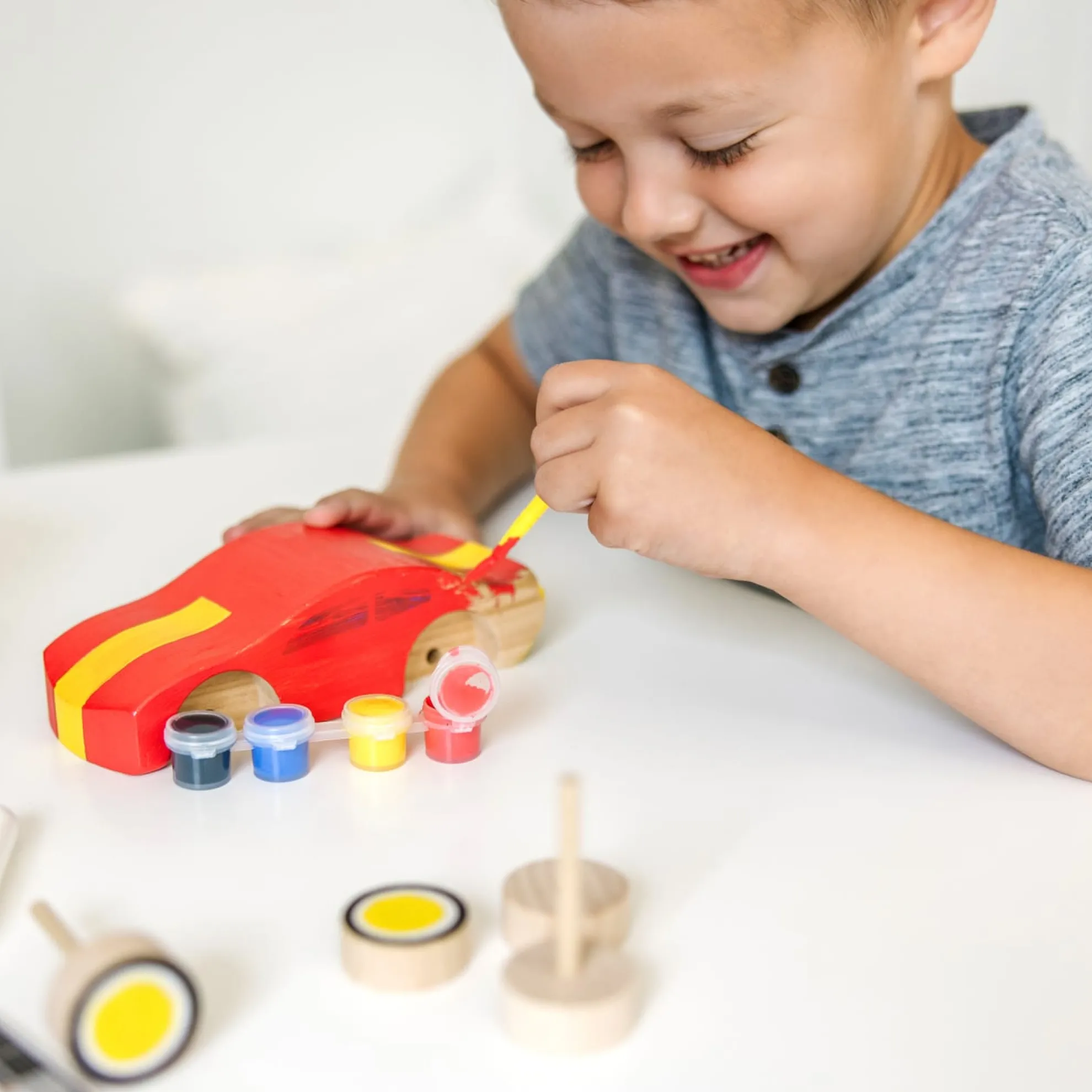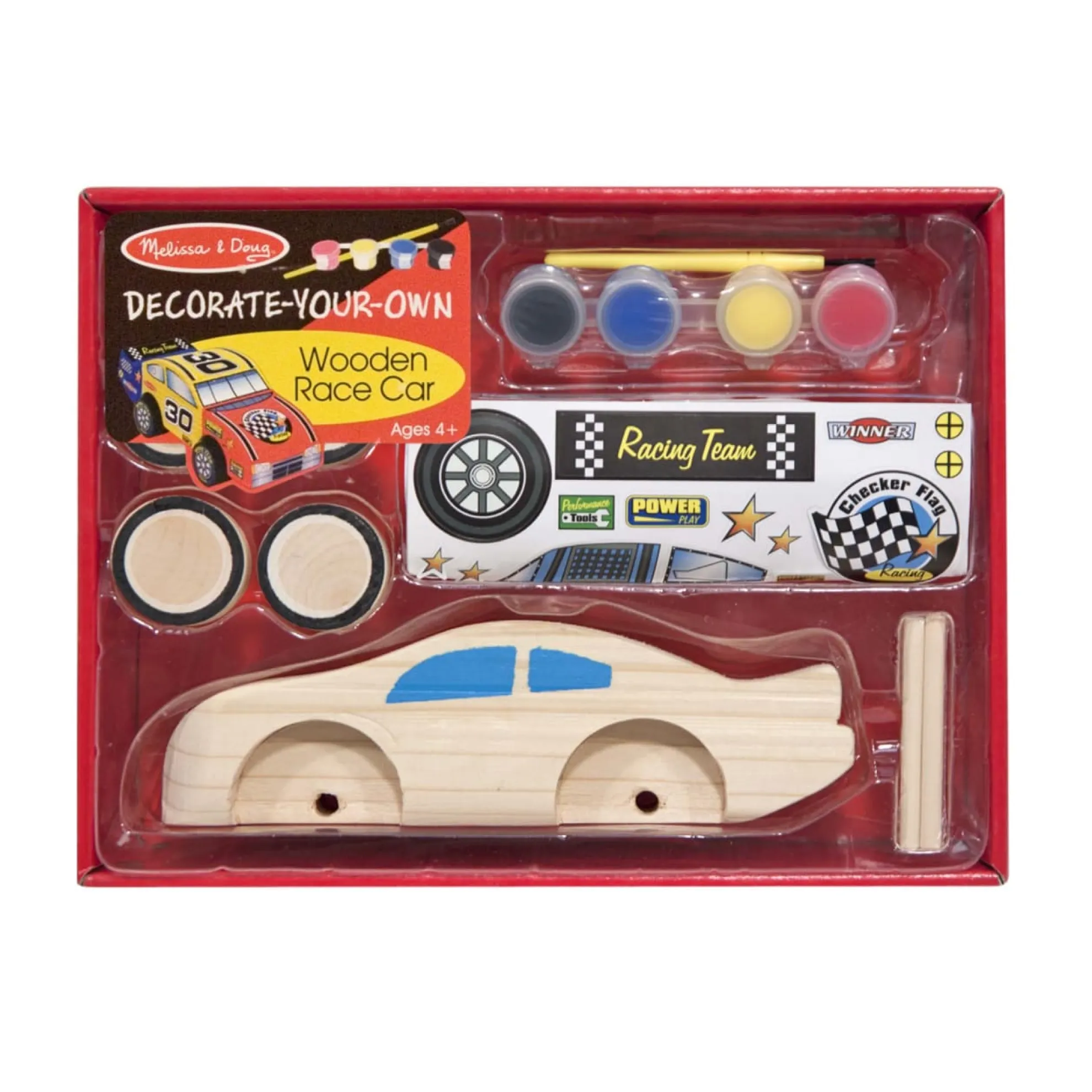 This wooden race car is ready to be customized. The convenient tray contains everything needed to get this car to the starting gate: wooden axles and wheels, paints and brush, stickers and craft glue. On your mark, get set . . . craft!
