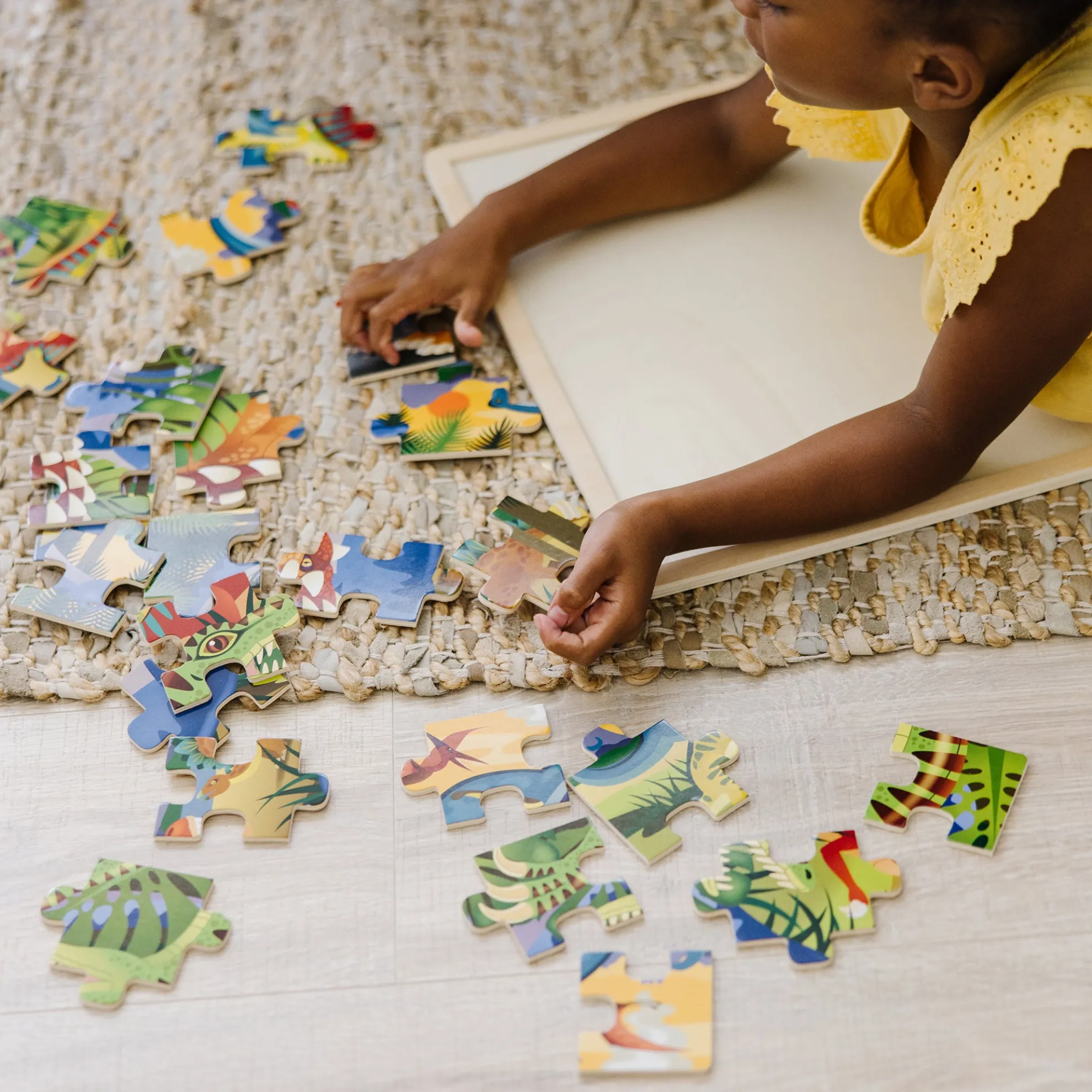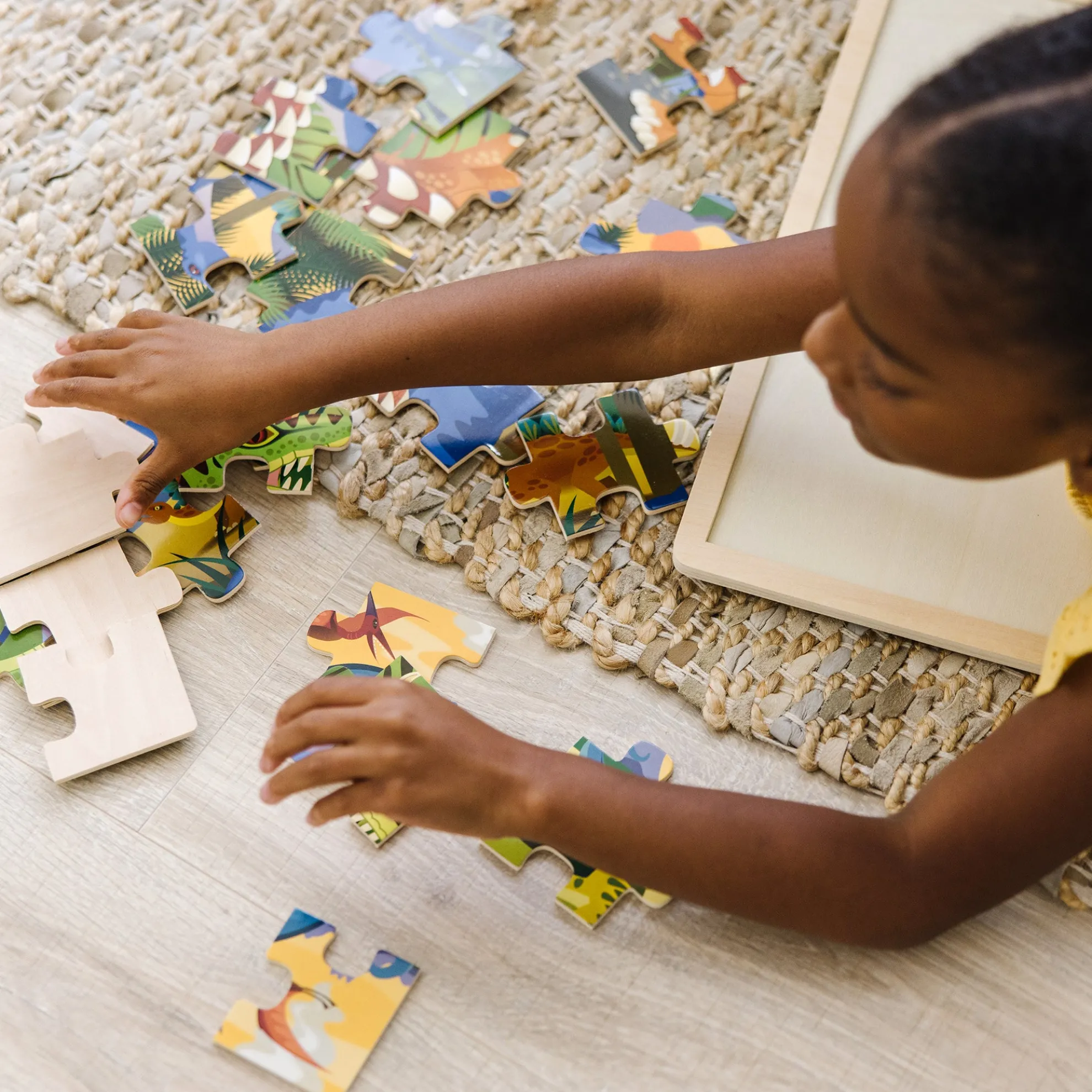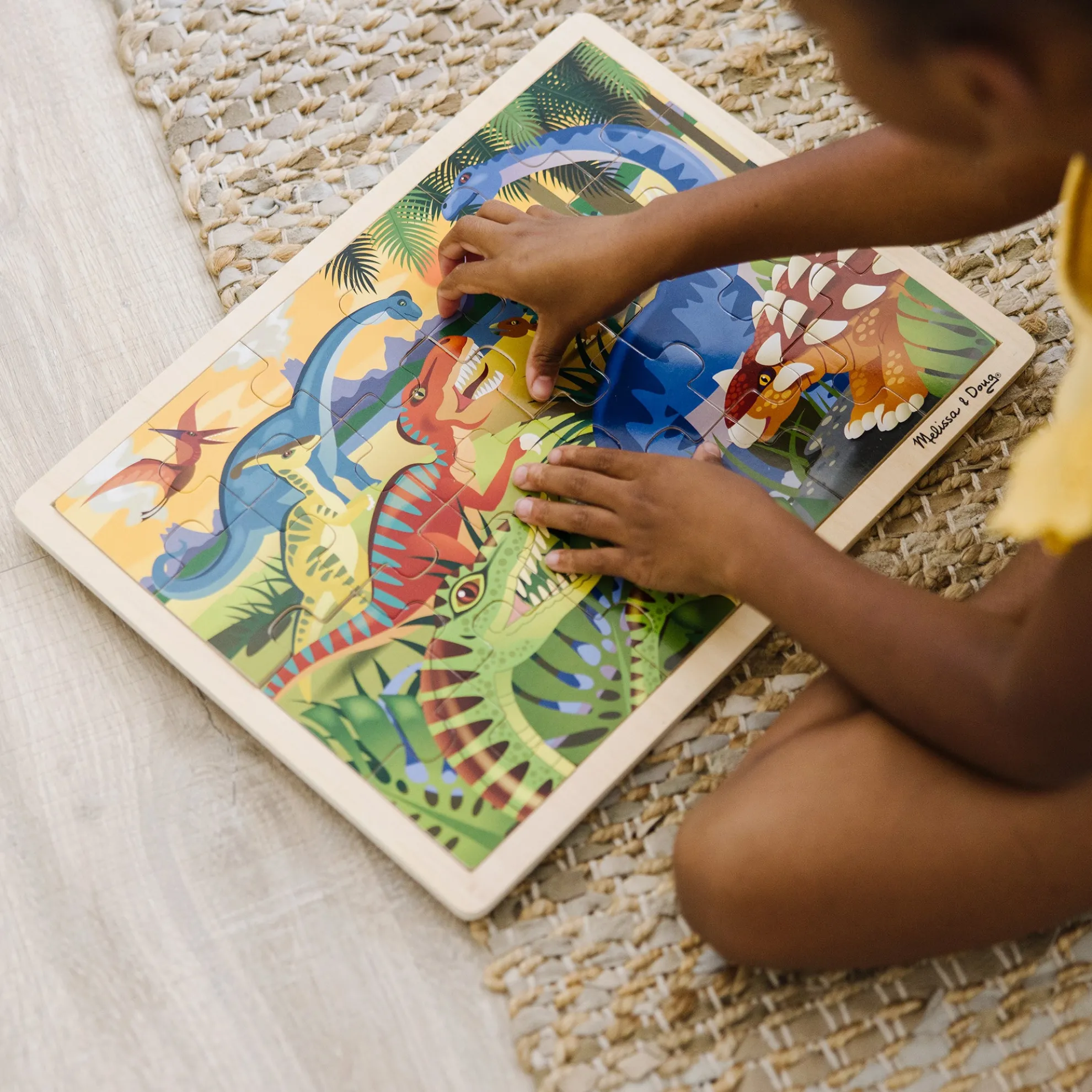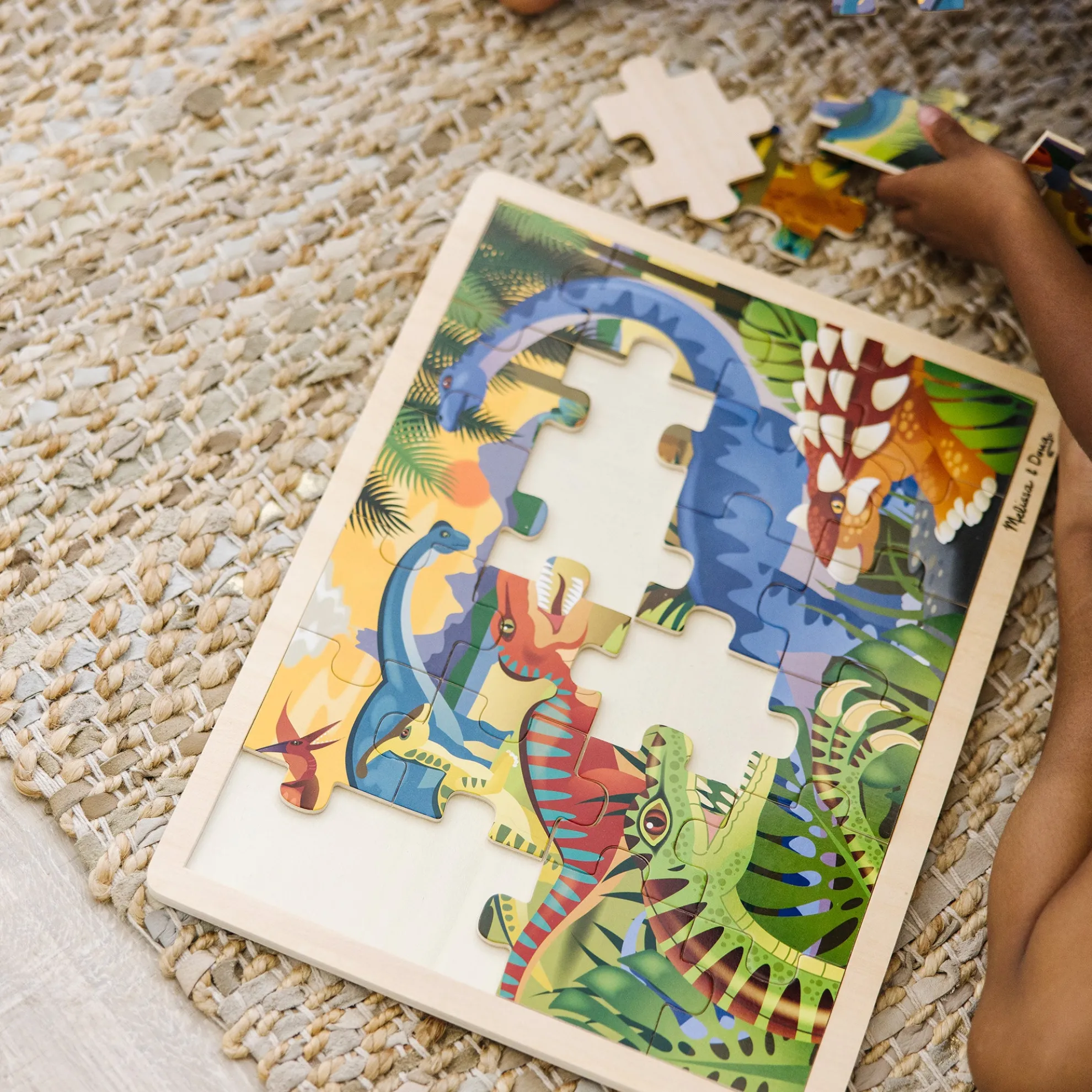 A dramatic prehistoric scene comes to life when the wooden jigsaw pieces are assembled! Brightly illustrated with dinosaur details, this 24-piece puzzle comes packaged in a sturdy wooden tray for puzzle-building and easy storage.