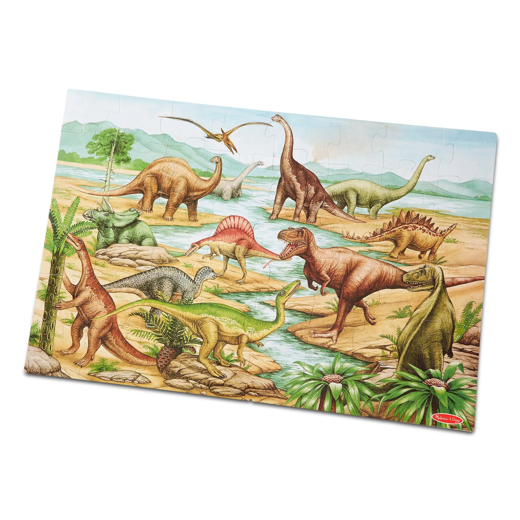 Kids’ excitement and interest in dinosaurs will never go extinct! This jumbo Dinosaurs Floor Puzzle features beautiful original artwork that depicts a scene from prehistoric times. It includes images of kids’ favorite dinosaurs including a spiny stegosaurus, a flying pterodactyl, and a mighty t-Rex. The floor puzzle measures an impressive three feet x two feet when it’s assembled, and the 48 extra-thick cardboard pieces feature an easy-to-clean surface to keep this exciting floor puzzle looking like new. Playing with puzzles is a great way for kids to explore their creativity while developing their cognitive, physical, and emotional skills. When children work on puzzles, they are fine-tuning their gross motor skills, improving their hand-eye coordination, strengthening their problem-solving skills, and beginning to develop logic and critical thinking processes. This Melissa & Doug Dinosaurs Floor Puzzle makes an exceptional gift for preschoolers and kids ages three and older for hands-on, screen-free play. This product is certified by the Forest Stewardship Council. FSC certification ensures that products come from responsibly managed forests that provide environmental, social, and economic benefits, and that forests are protected for future generations. Please note that FSC certification applies to new inventory only (FSC C156584).