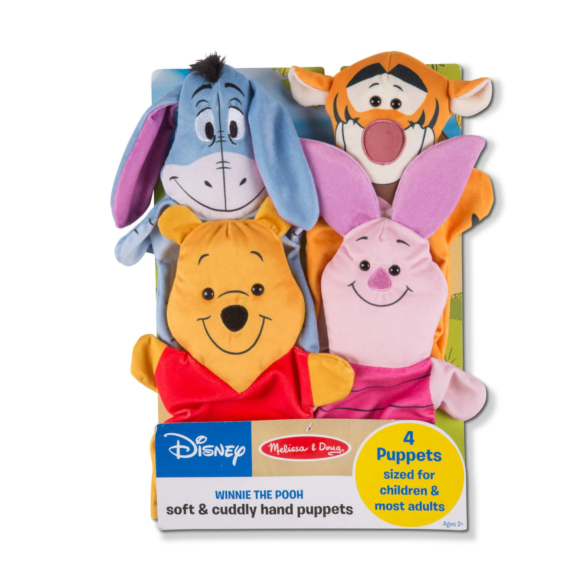 Four adorable hand puppets make up this family friendly collection which is an excellent play set to help kids and caregivers roleplay together! Four simple glove puppets with a Winnie the Pooh theme make it easy and so much fun to act out scenes, practice new vocabulary, and spend quality time playing together. Its great for building motor skills and self confidence, too! Made with brightly patterned, washable fabrics and built to last, these soft and sweet hand puppets are sure to be go-to toys for years to come.