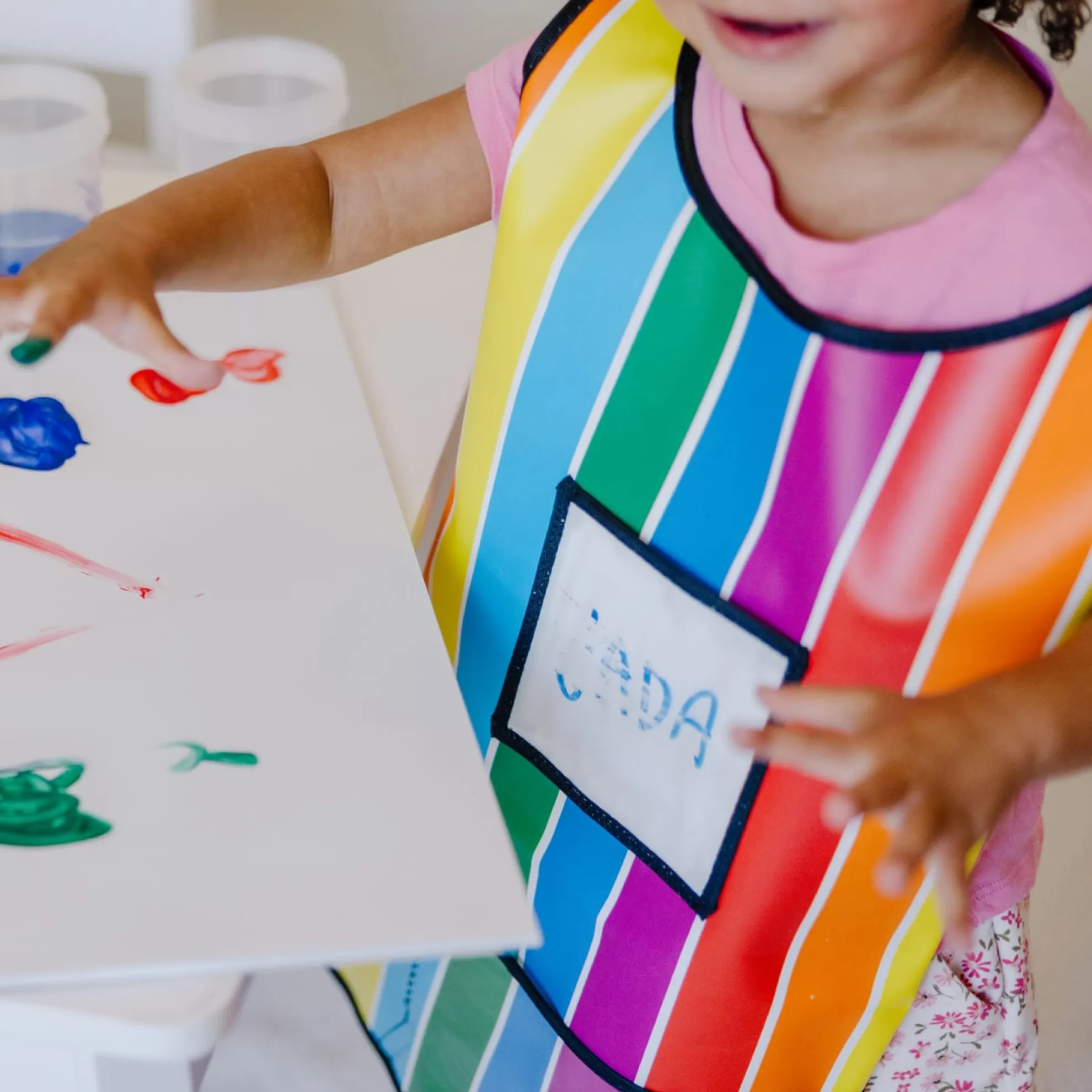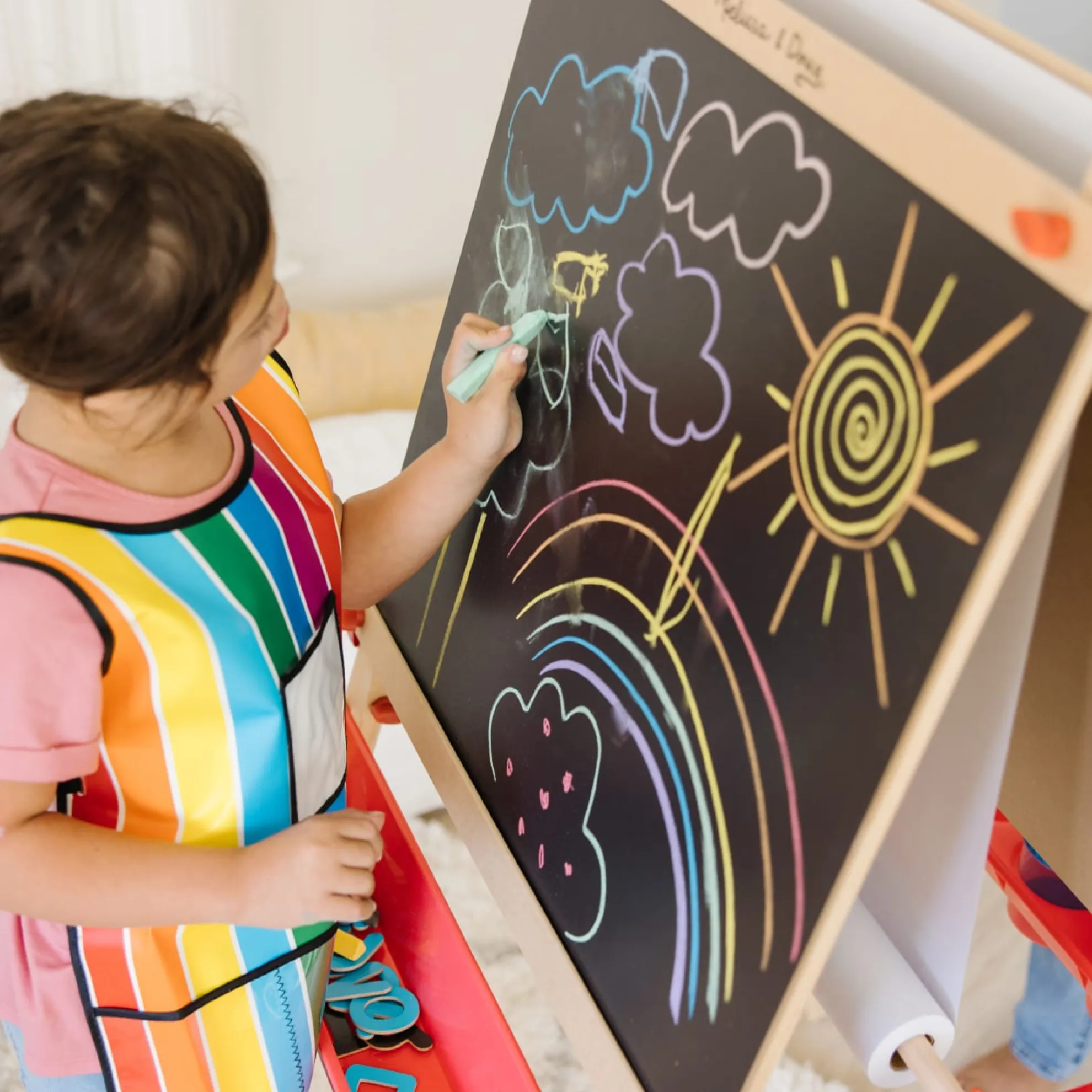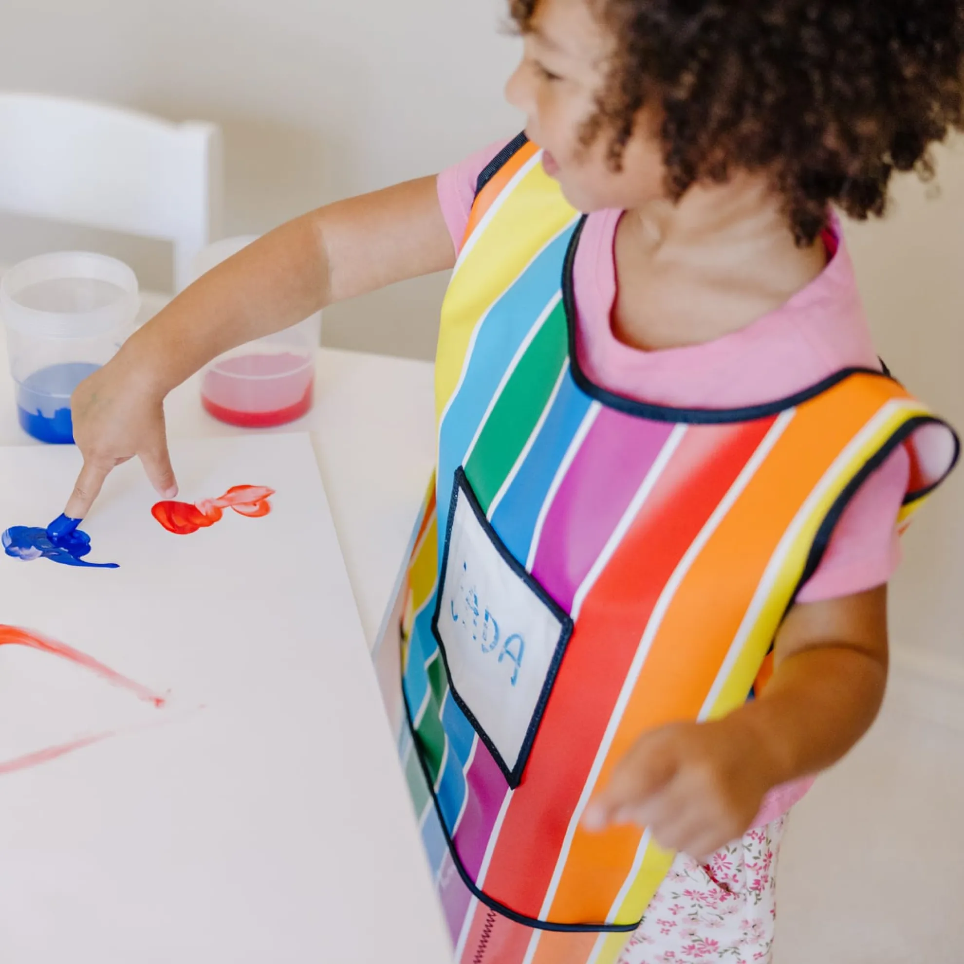 Creative kids can stay neat and clean in this durable art smock! Features a write-on chest pocket to personalize with dry-erase marker, an easy-clean apron surface and roomy storage pockets. Adjustable straps mean one size fits all!
