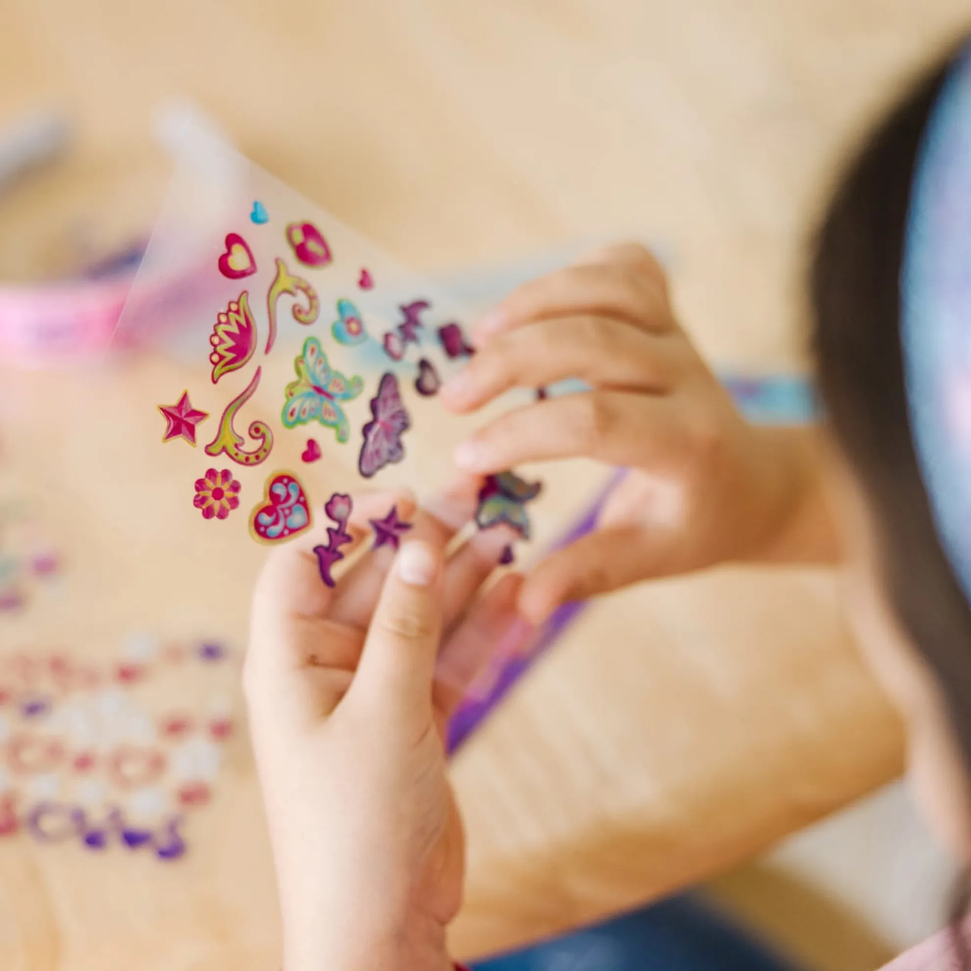 - Each kit contains sparkle-gem, glitter, and jewel peel-and-stick stickers to decorate the fashion accessories