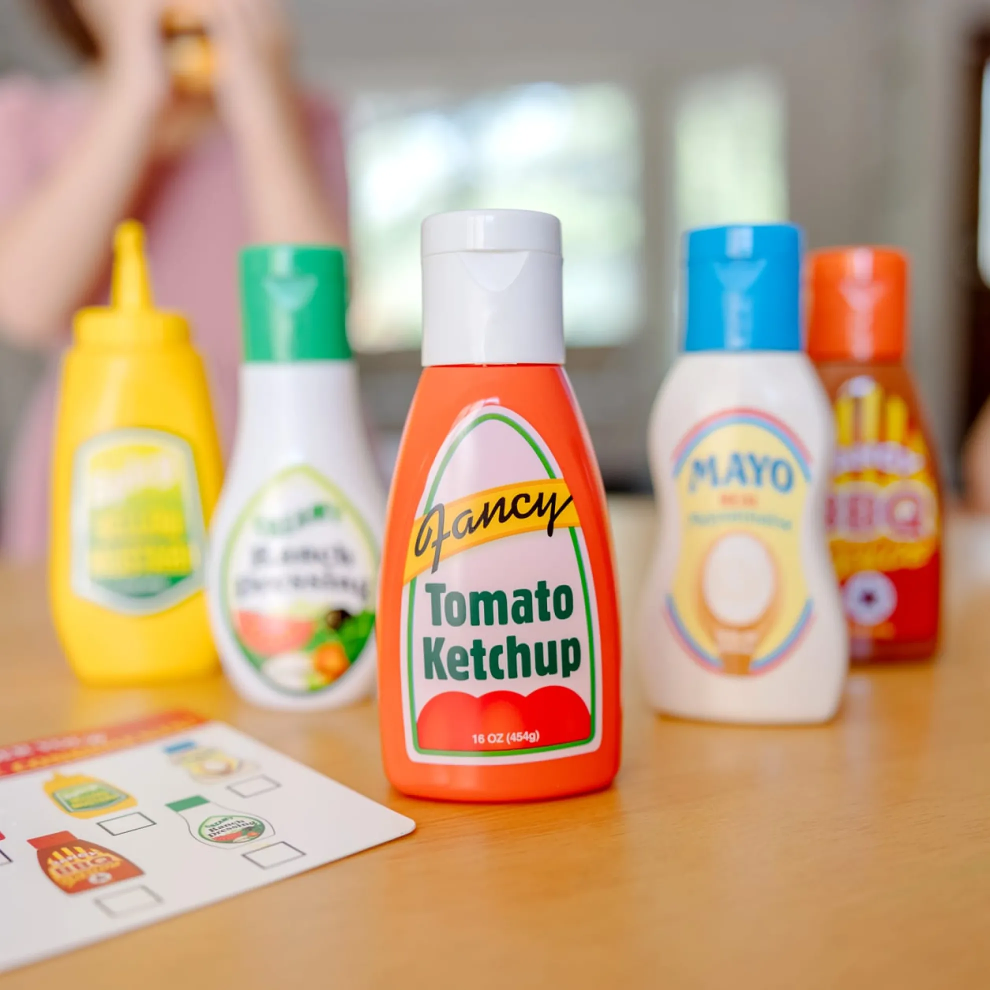 Be the hit of pretend picnics, barbecues, and other playtime meals with these favorite food toppers! Twist or flip the caps and tip the condiments to “squirt” ranch dressing, barbecue sauce, mustard, mayonnaise, or ketchup string to imaginatively add a creative twist to pretend meats, salads, sandwiches, and more! This set of five durable containers designed to look like the real thing, and a reusable menu card with creative combination ideas are sure to satisfy hungry imaginations at playtime.
