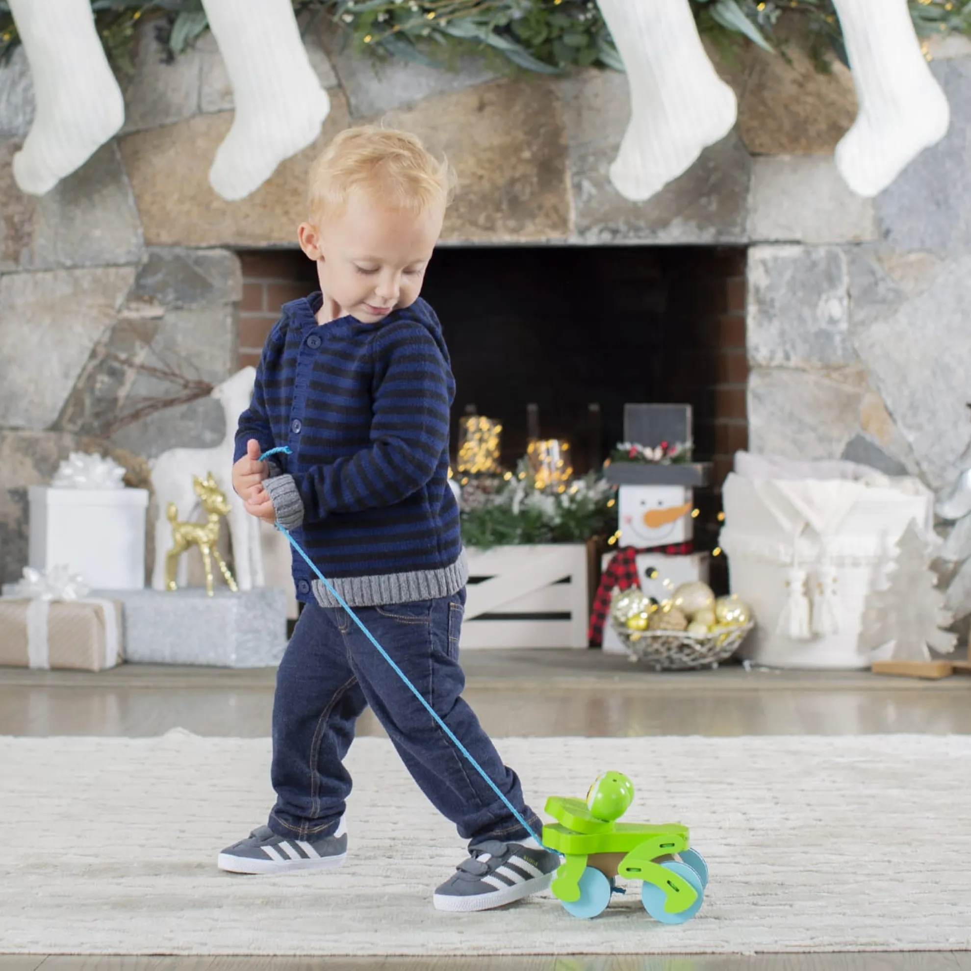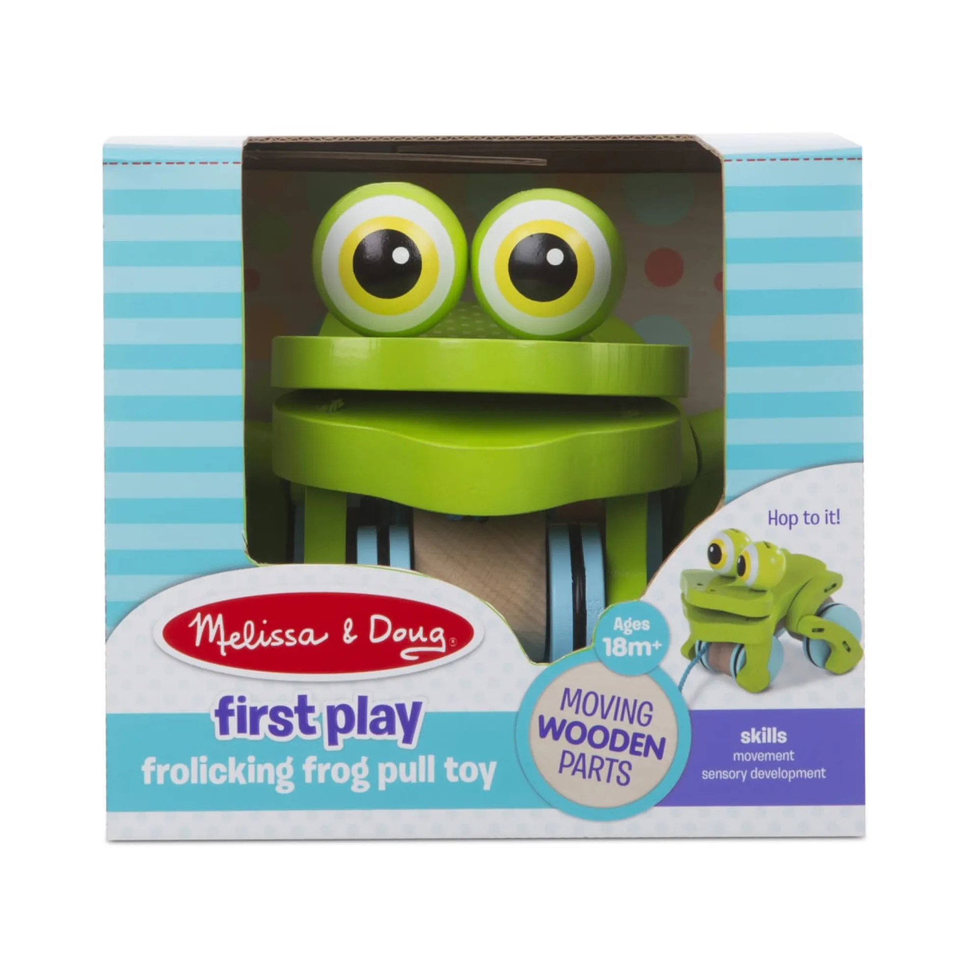 Kids will get lots of giggles from this frog that bounces, bobs, and jiggles! The bright green and polka-dot frog with big eyes and moving wooden parts will follow kids 18 months and older anywhere as they maneuver the ‘hopping” pull toy, encouraging movement and sensory development. Non-skid wheels move forward and backward, and the mouth opens and closes. First Play toys feature bright colors, bold patterns, and whimsical designs that boost skills while sparking imagination and wonder – right from the start!