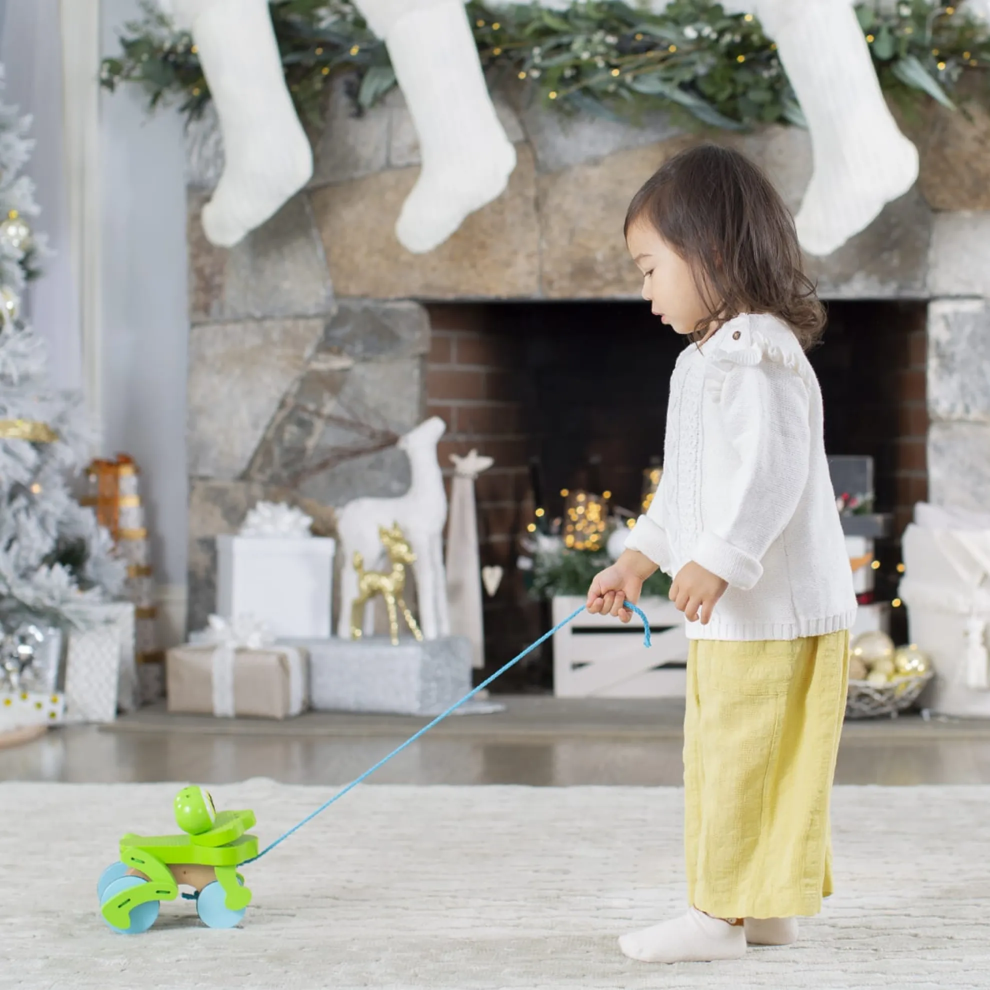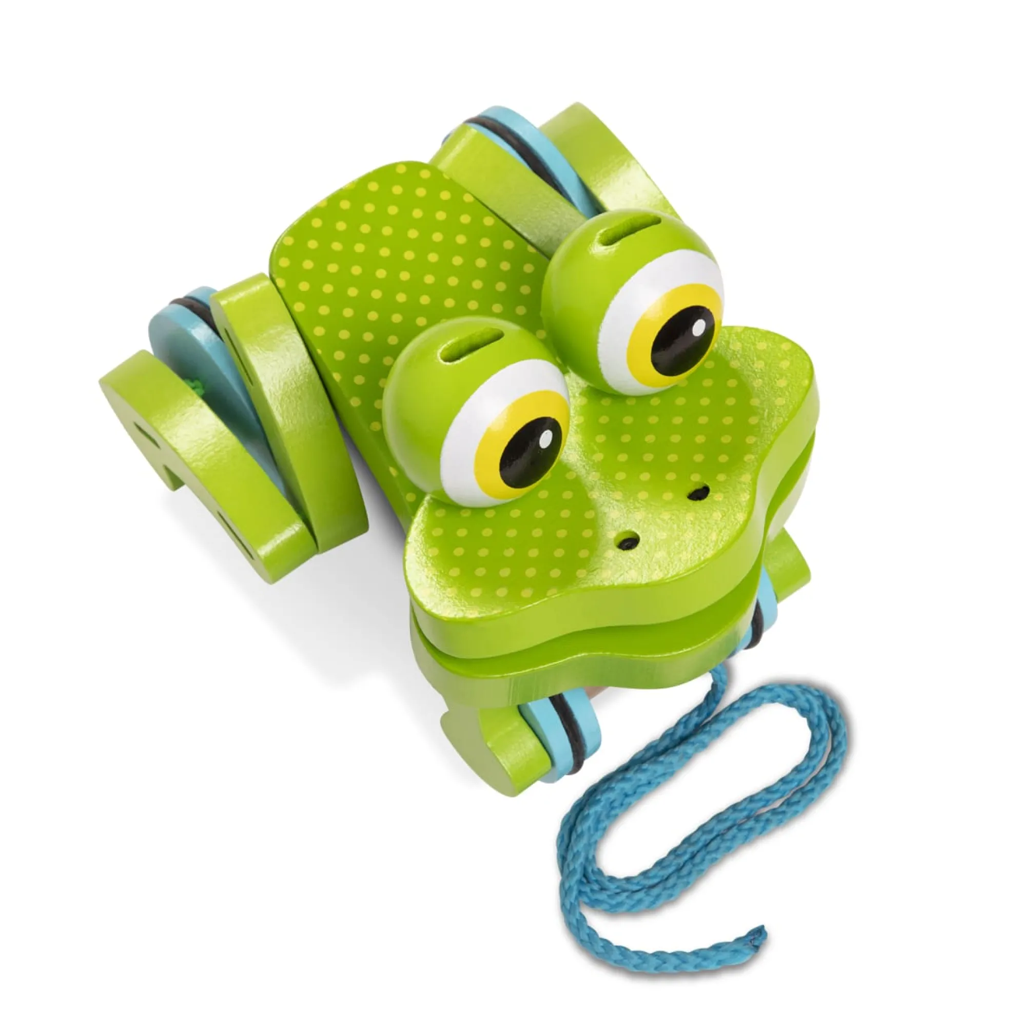 - Frolicking frog bounces and bobs as kids pull wheeled toy with string