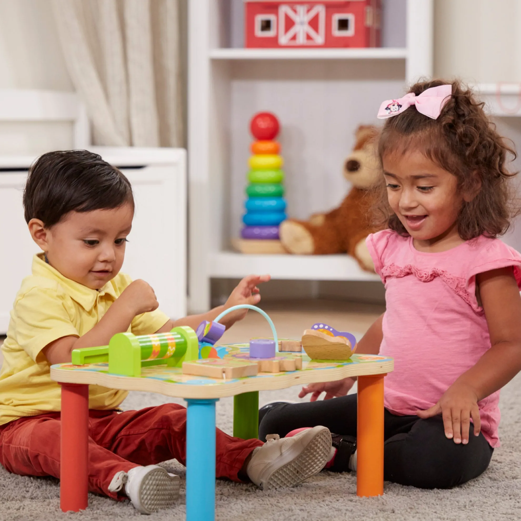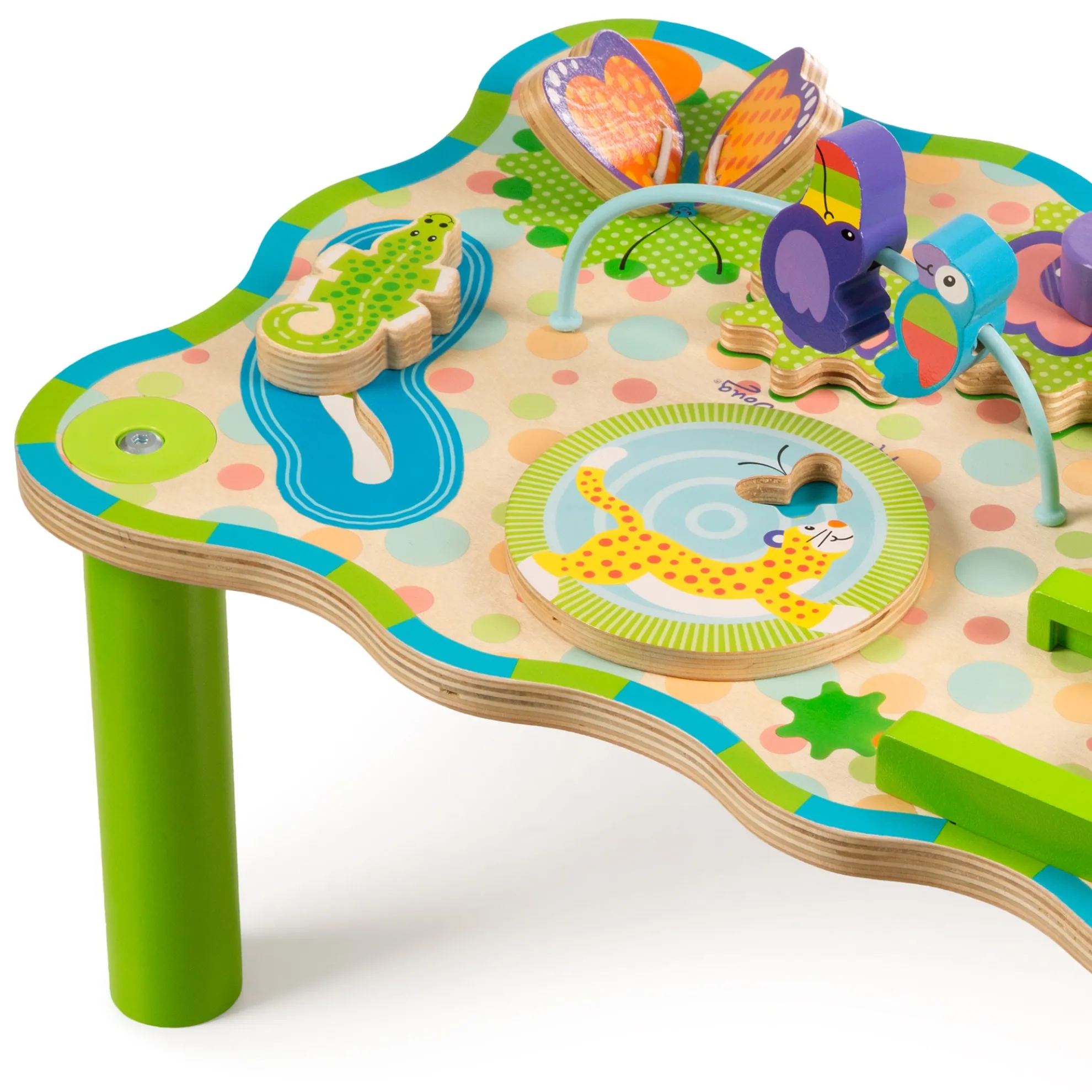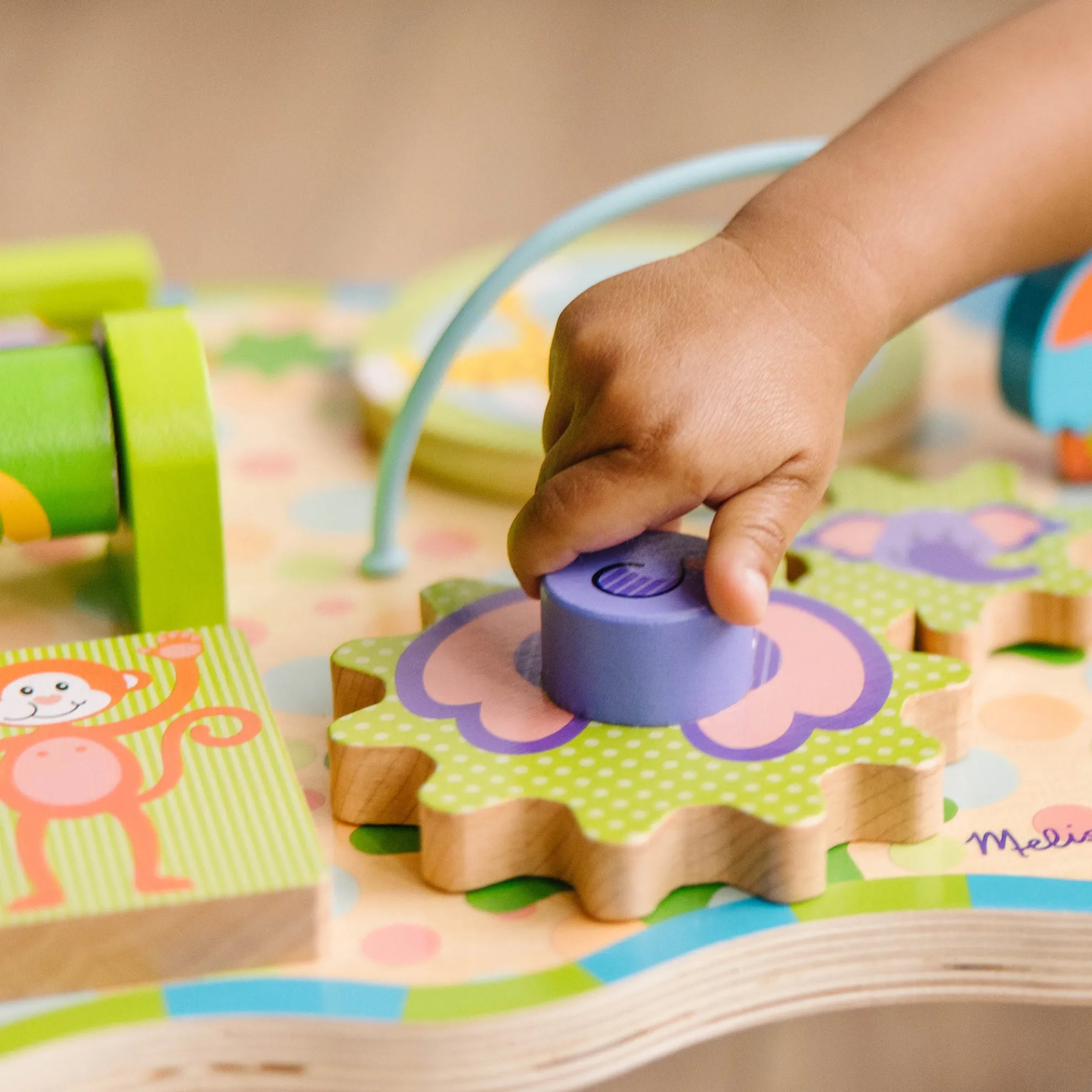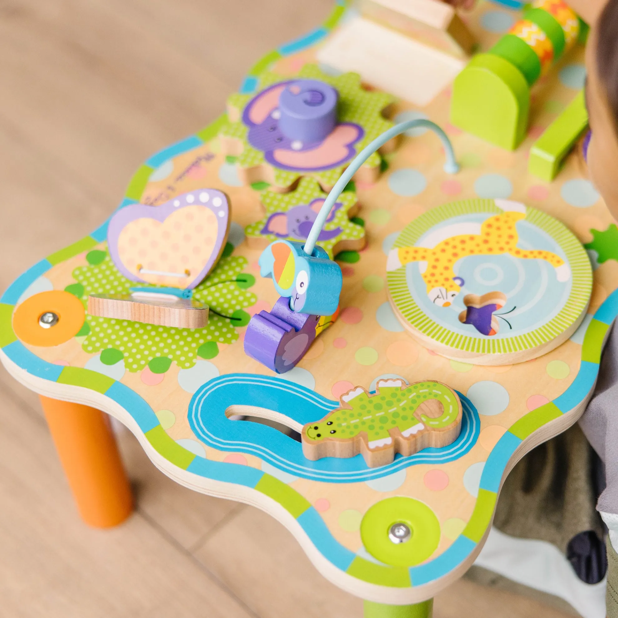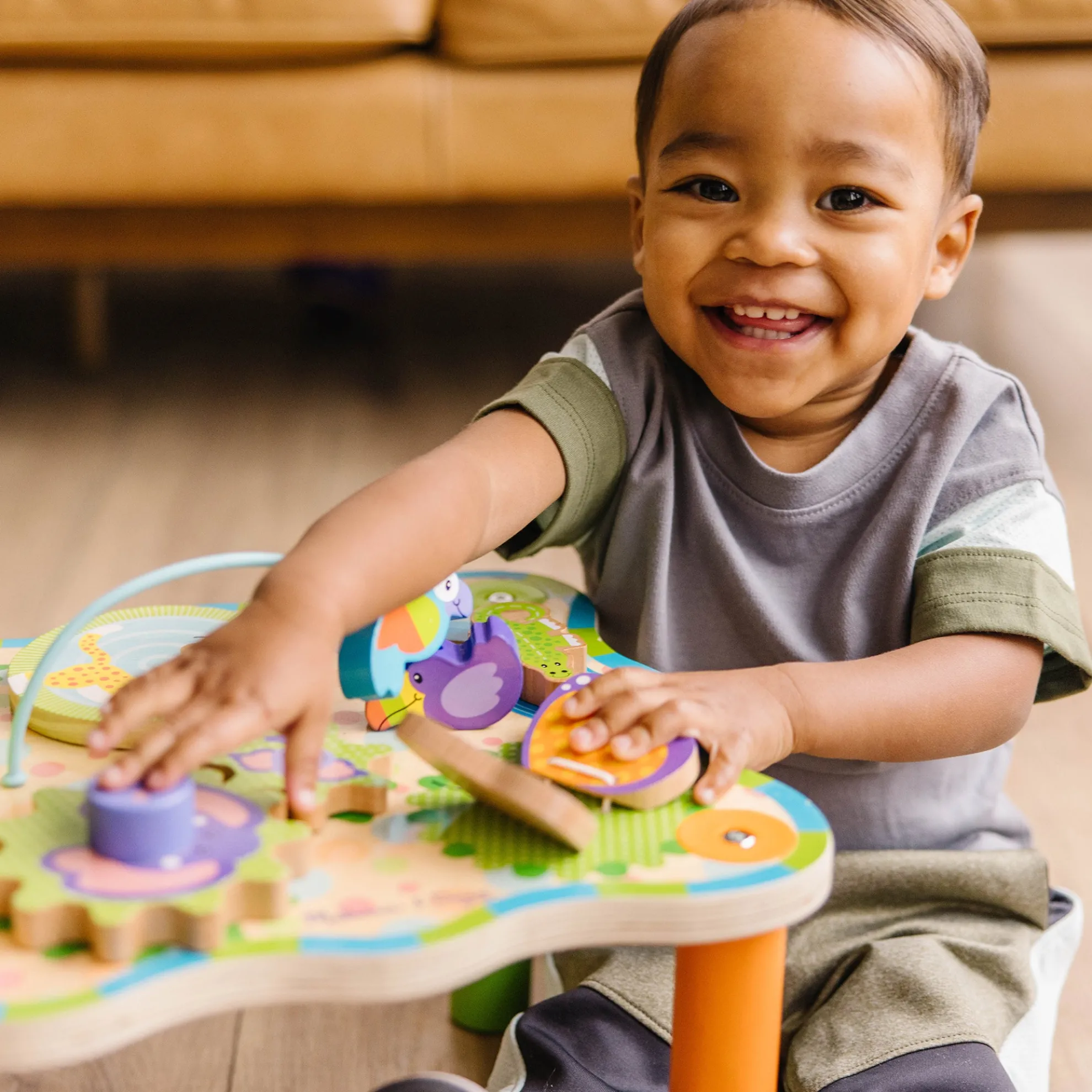 This hands-on multi-activity table keeps kids 12 months and older engaged and entertained, while encouraging important developmental skills. Features include gears to turn, a tube to roll, beads to slide, flaps to open, a wheel to spin, and easy-to-grasp pieces to flip, push, and pull! Sturdy wooden construction, paired with whimsical jungle-themed designs, make this a long-lasting and welcome addition to any playroom. First Play toys feature bright colors, bold patterns, and whimsical designs that boost skills while sparking imagination and wonder—right from the start!