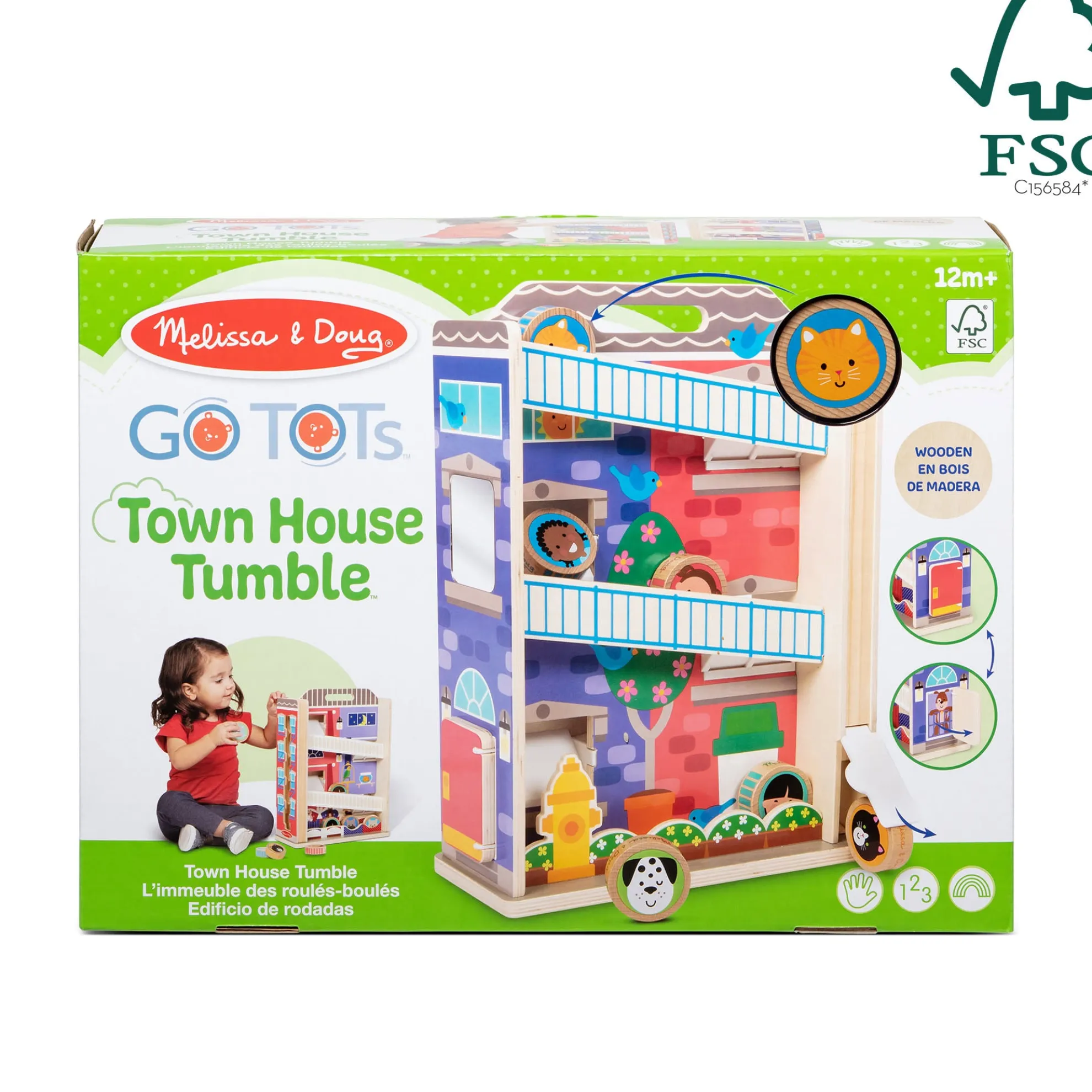 - Roll, stack, and grasp 6 double-sided wooden GO Tots friends and make them tumble, twirl, and zigzag down the wooden town house tower