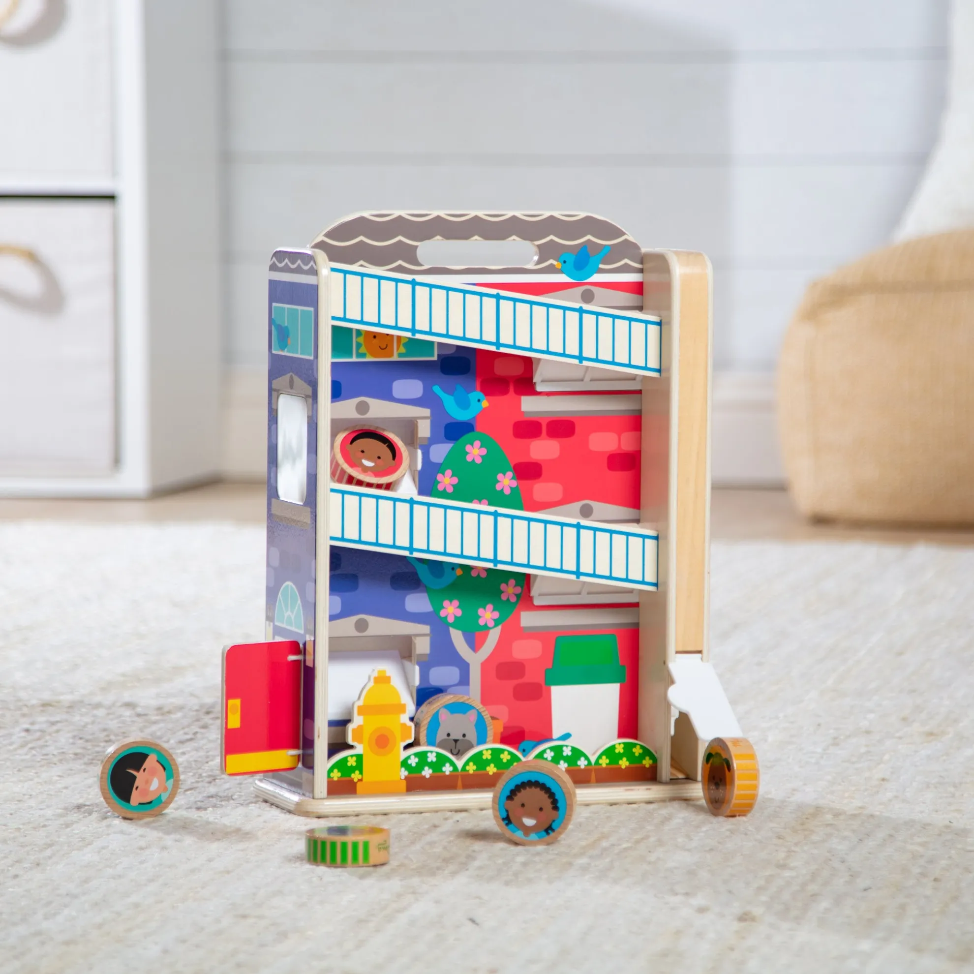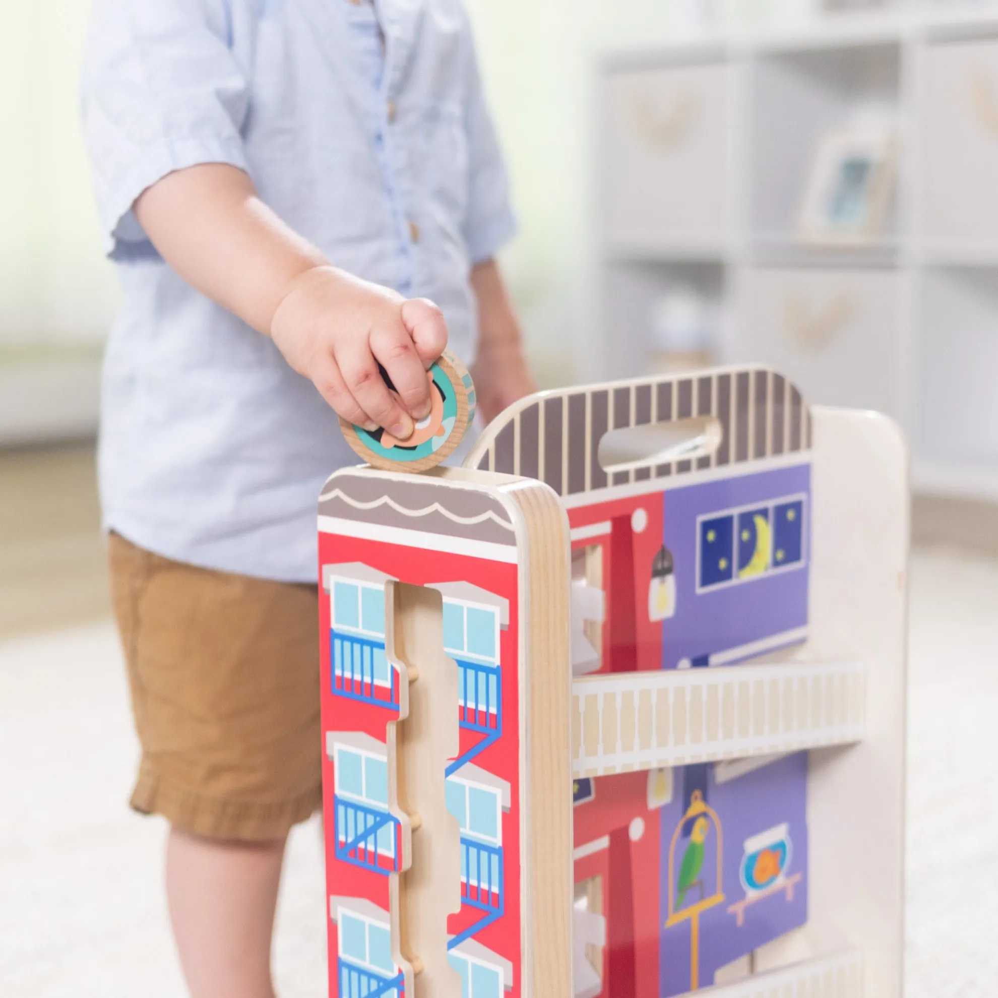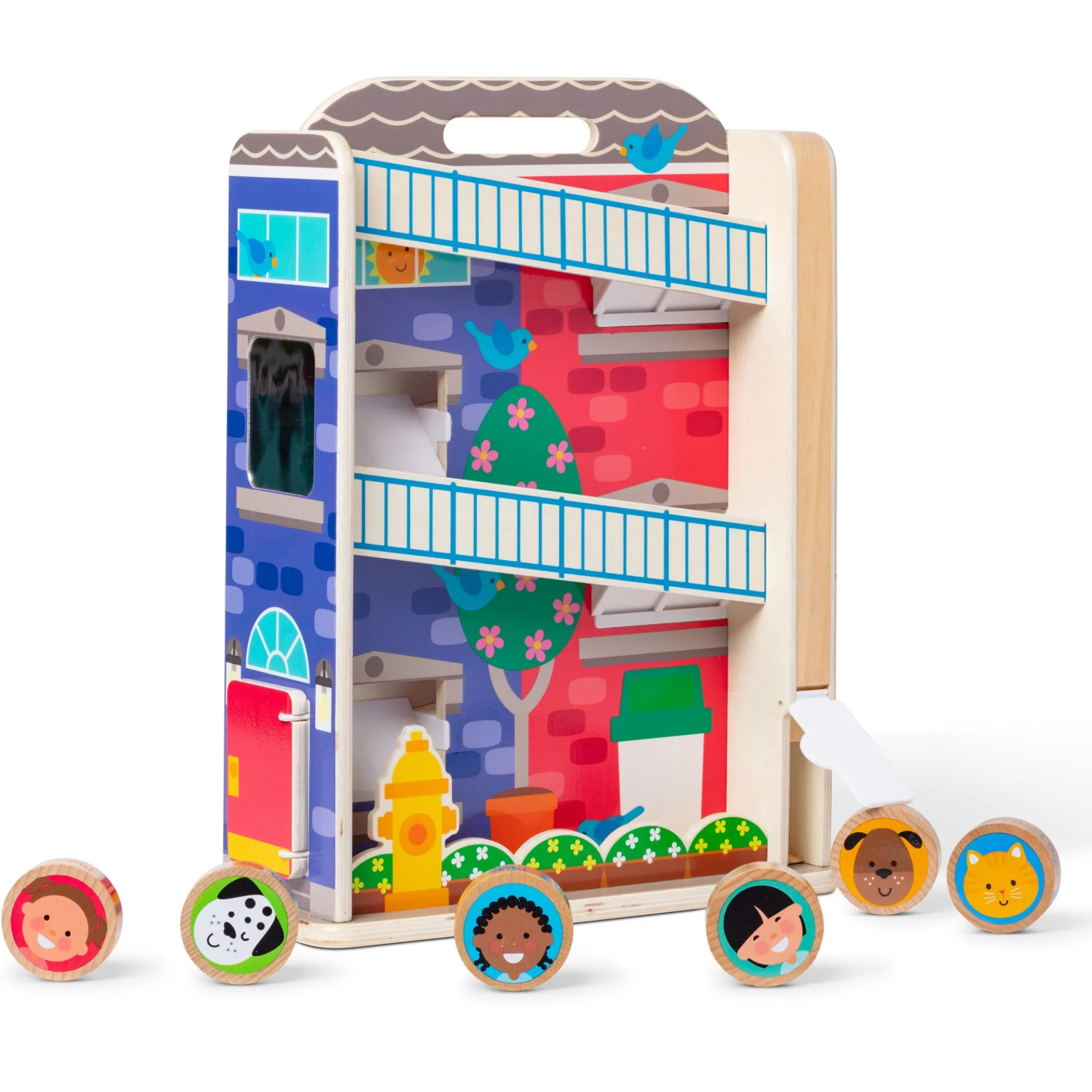 Let’s go play with friends that are fun to roll, stack, and grasp! Six double-sided chunky wooden GO Tots disks (12 collectible characters—6 people and 6 pets) tumble and twirl down ramps on the sturdy wooden town house with built-in carrying handle, transitioning from front to back of the building, and coming to rest in their beds. Drop in the top and they zigzag down the side fire escape and pop out the hatch at the bottom! Includes a peek-a-boo door and built-in mirror. Compatible with other GO Tots play sets. With Melissa & Doug GO Tots, toddlers 12 months and older will discover a new kind of kinetic play that offers opportunities to explore cause-and-effect through delightful motion-driven moments. Relatable, diverse characters and appealing shapes and textures encourage connections and exploratory, skill-building play. This product is certified by the Forest Stewardship Council. FSC certification ensures that products come from responsibly managed forests that provide environmental, social, and economic benefits, and that forests are protected for future generations. Please note that FSC certification applies to new inventory only (FSC C156584)