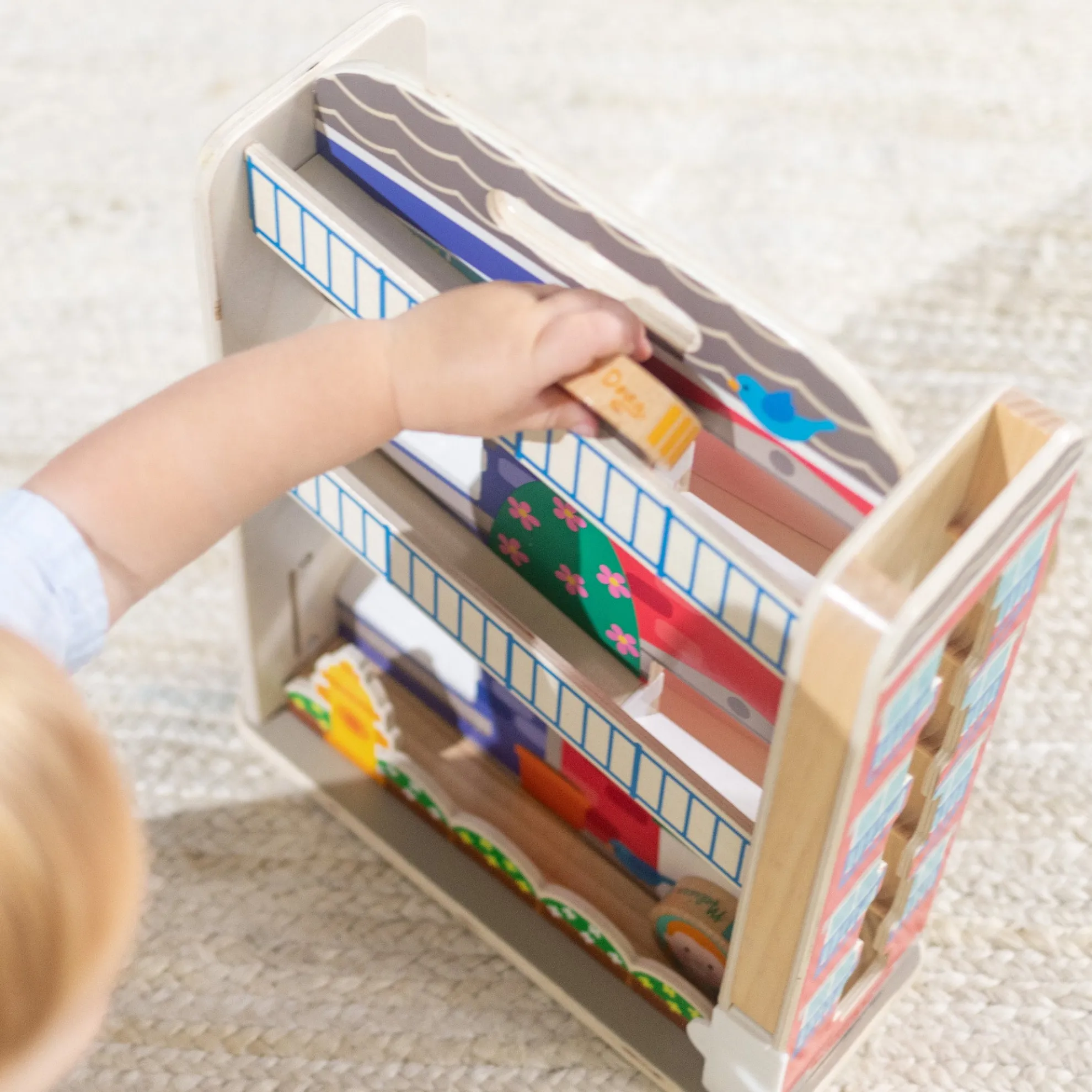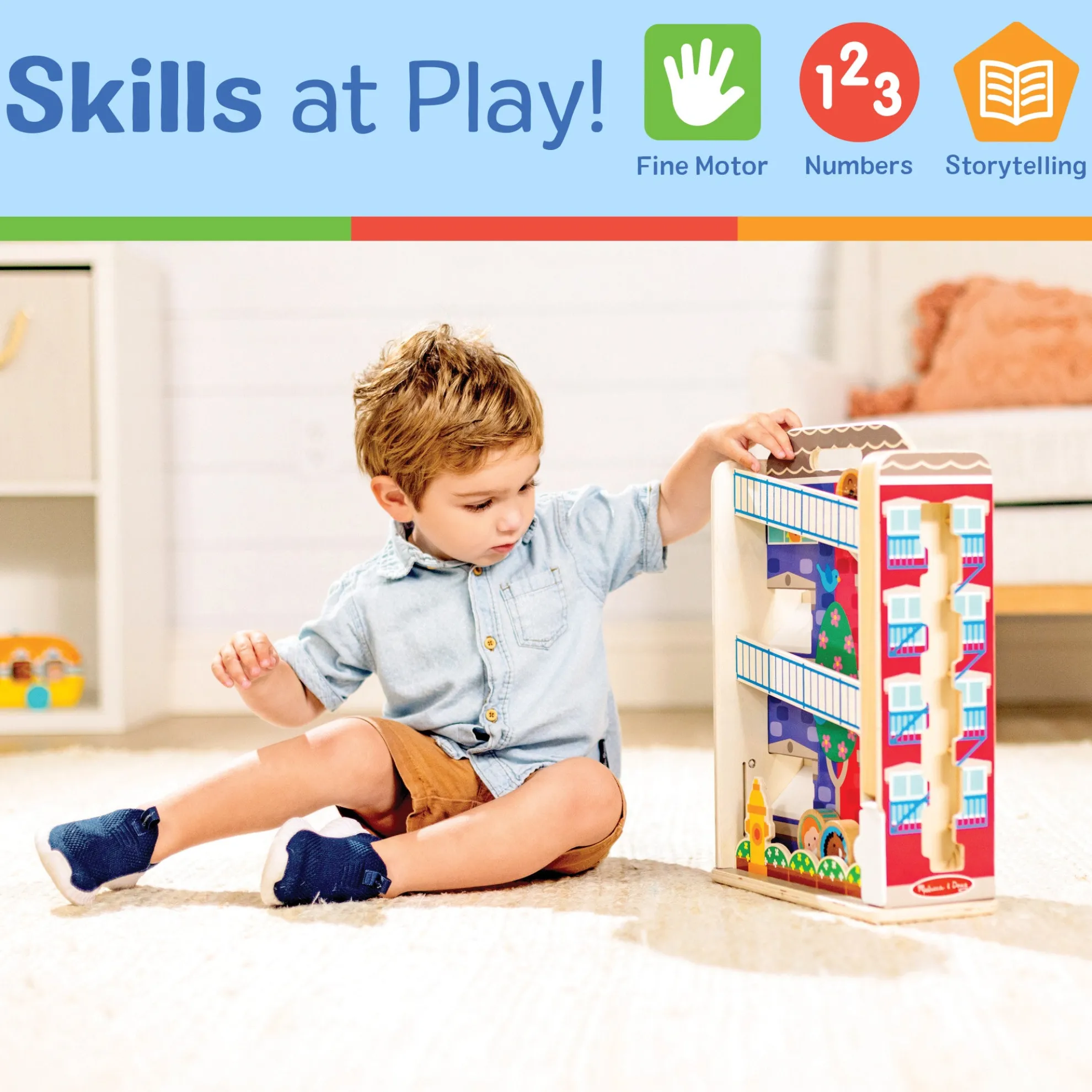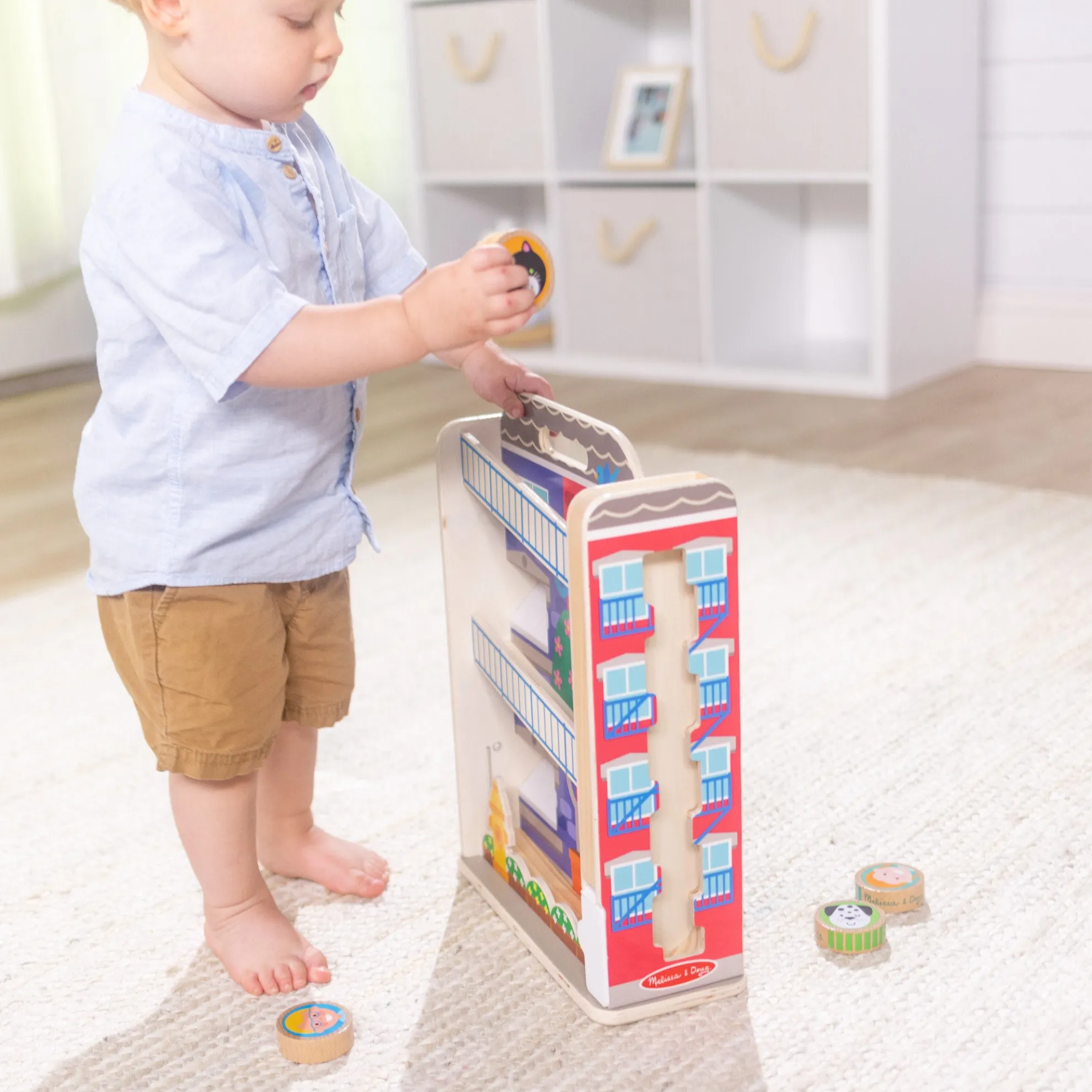 Let’s go play with friends that are fun to roll, stack, and grasp! Six double-sided chunky wooden GO Tots disks (12 collectible characters—6 people and 6 pets) tumble and twirl down ramps on the sturdy wooden town house with built-in carrying handle, transitioning from front to back of the building, and coming to rest in their beds. Drop in the top and they zigzag down the side fire escape and pop out the hatch at the bottom! Includes a peek-a-boo door and built-in mirror. Compatible with other GO Tots play sets. With Melissa & Doug GO Tots, toddlers 12 months and older will discover a new kind of kinetic play that offers opportunities to explore cause-and-effect through delightful motion-driven moments. Relatable, diverse characters and appealing shapes and textures encourage connections and exploratory, skill-building play. This product is certified by the Forest Stewardship Council. FSC certification ensures that products come from responsibly managed forests that provide environmental, social, and economic benefits, and that forests are protected for future generations. Please note that FSC certification applies to new inventory only (FSC C156584)
