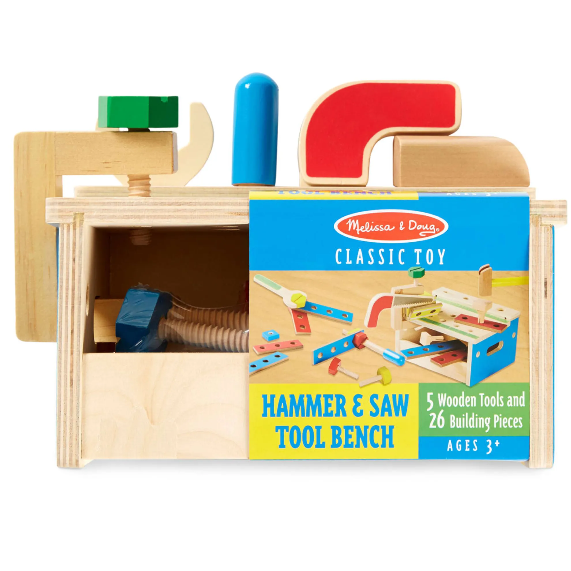 - Includes 26 building pieces and connectors, 5 wooden tools (hammer, saw, screwdriver, wrench, c-clamp)