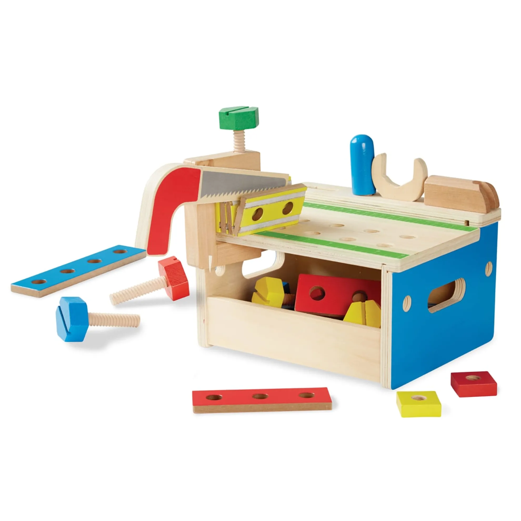 The 32 pieces in this wooden building set include nails to pound with the hammer, screws to turn with the screwdriver, and panels to connect and saw apart. Best of all, the tools and building supplies store neatly in a compact wooden workbench with measuring surface and C-clamp! Little builders can follow the included “blueprints” to create an animal, house, robot, or boat, or create their own amazing structures!