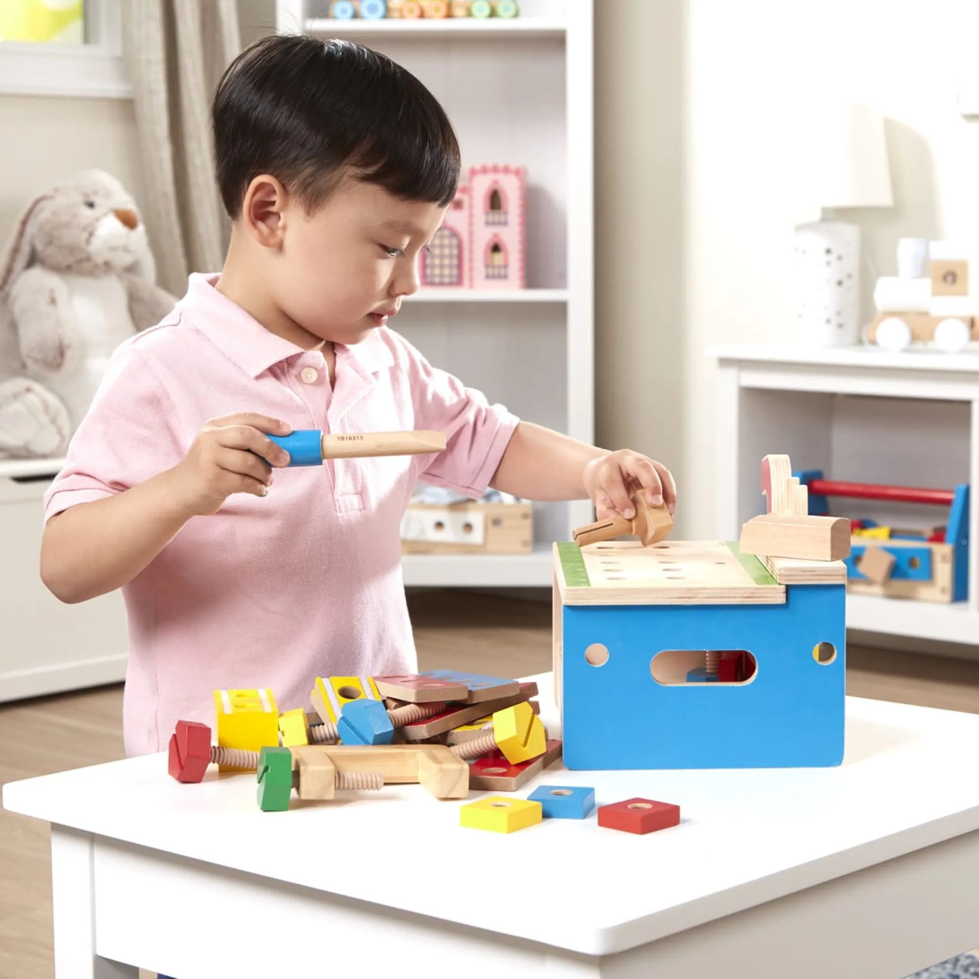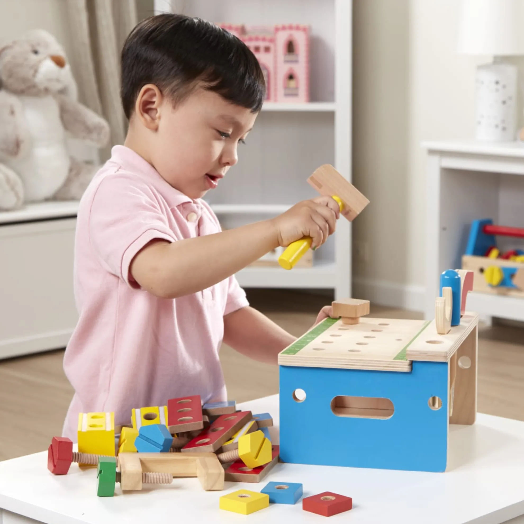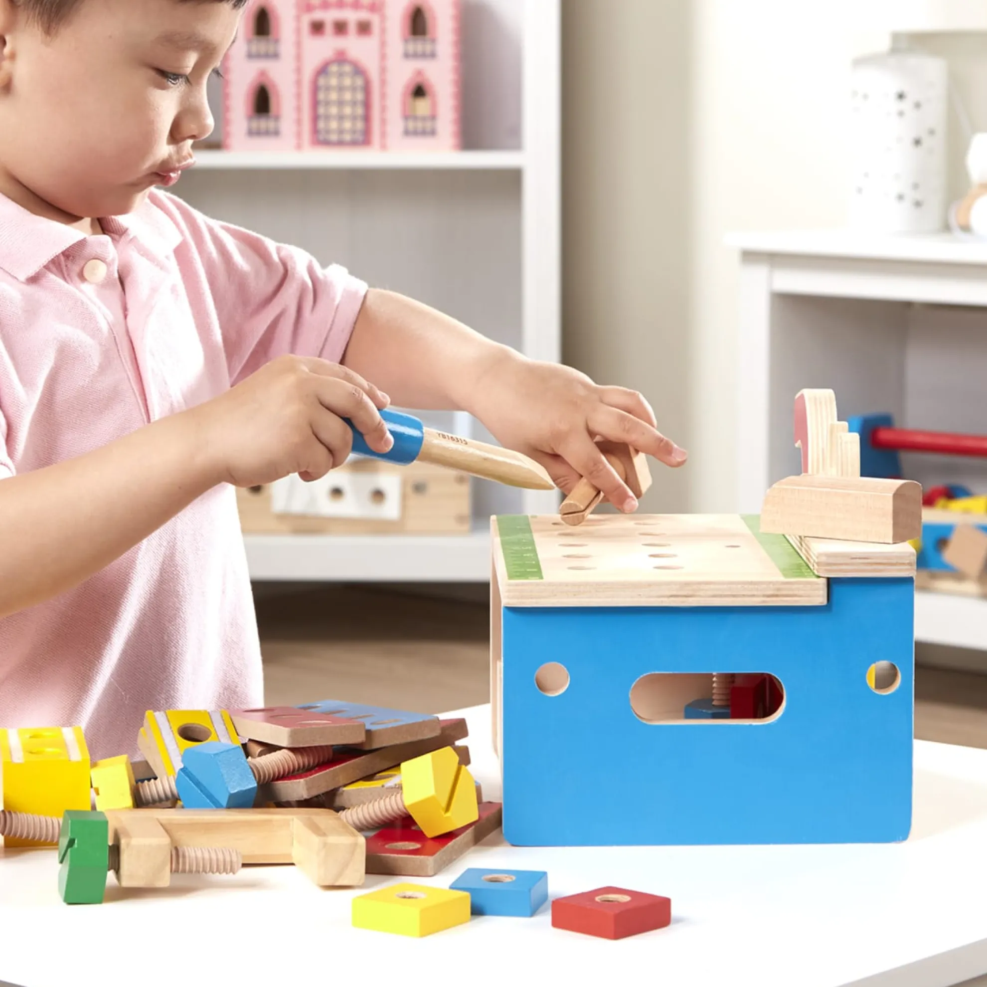 - Wooden tool bench with kid-sized wooden tools and building pieces to “saw” and connect