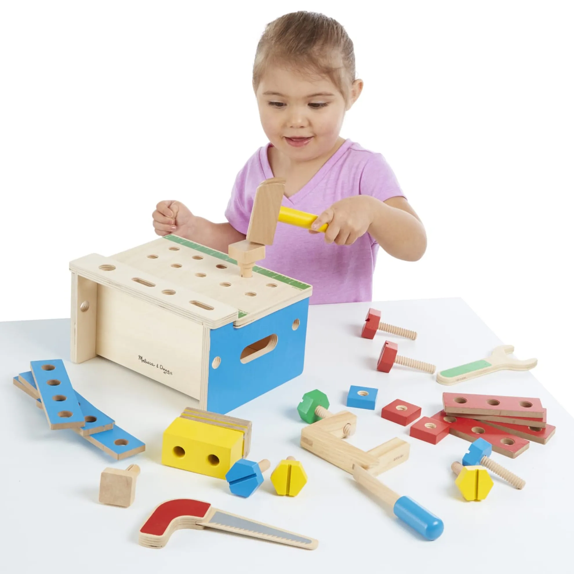 - Saw through the self-stick tabs to “cut” the wood; pieces store inside mini tool bench with handles