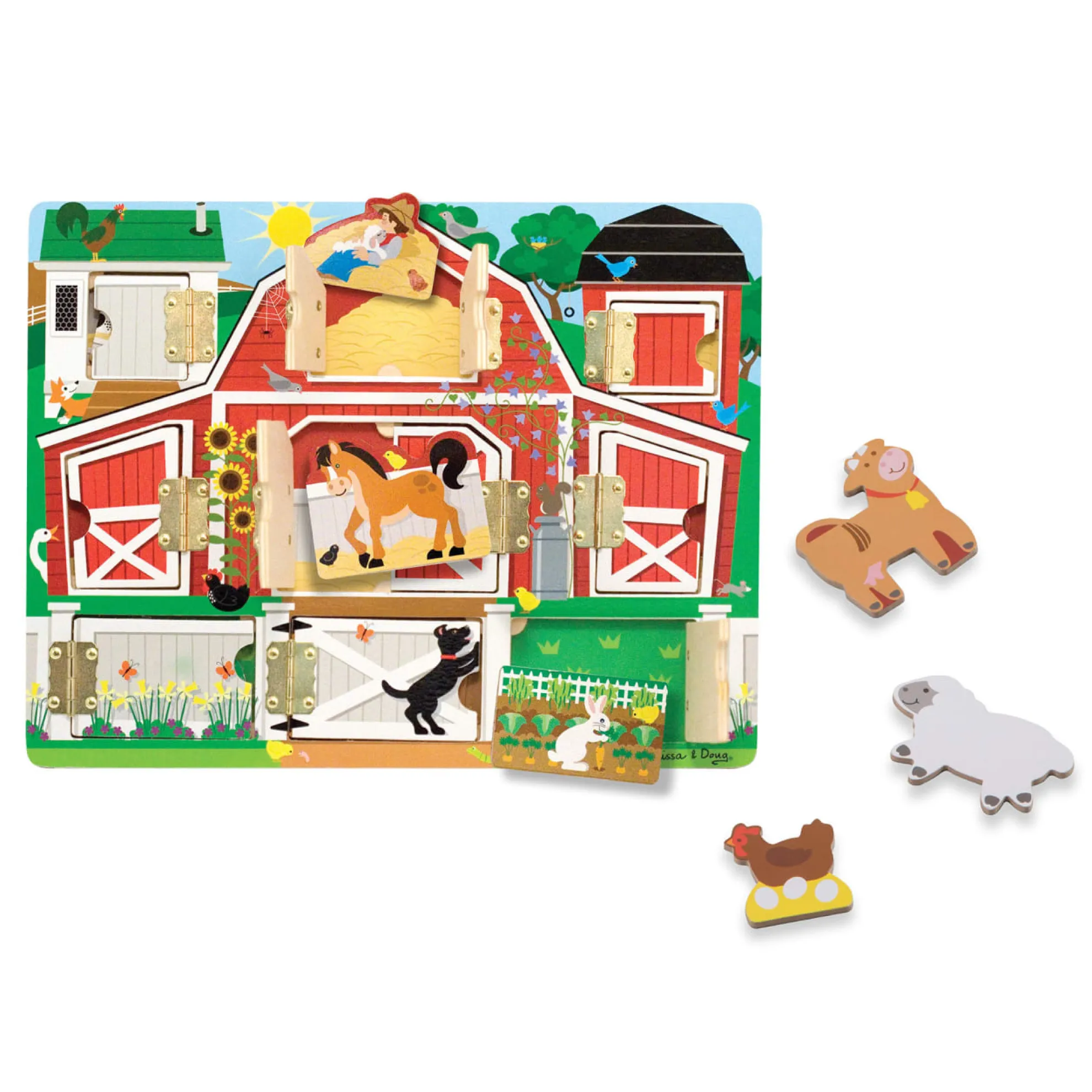 Here a chick, there a chick…behind each of the 9 hinged doors on this charming barnyard scene is a delightful, magnetic animal. Learning about animals while improving memory and fine motor skills will keep children busy and having fun on the farm for hours!