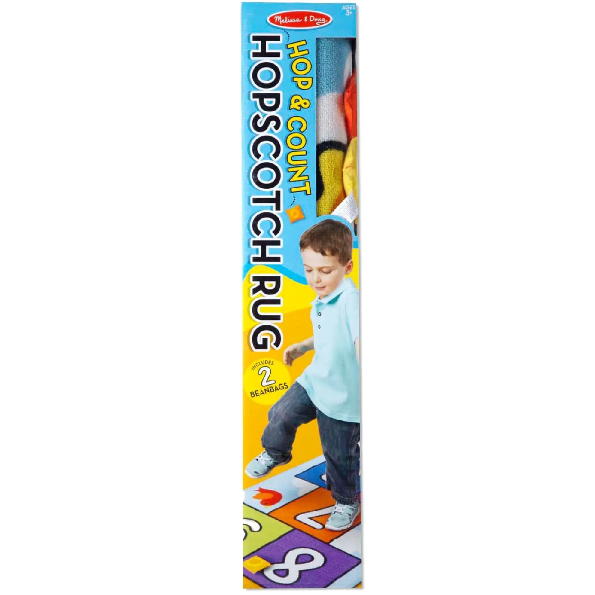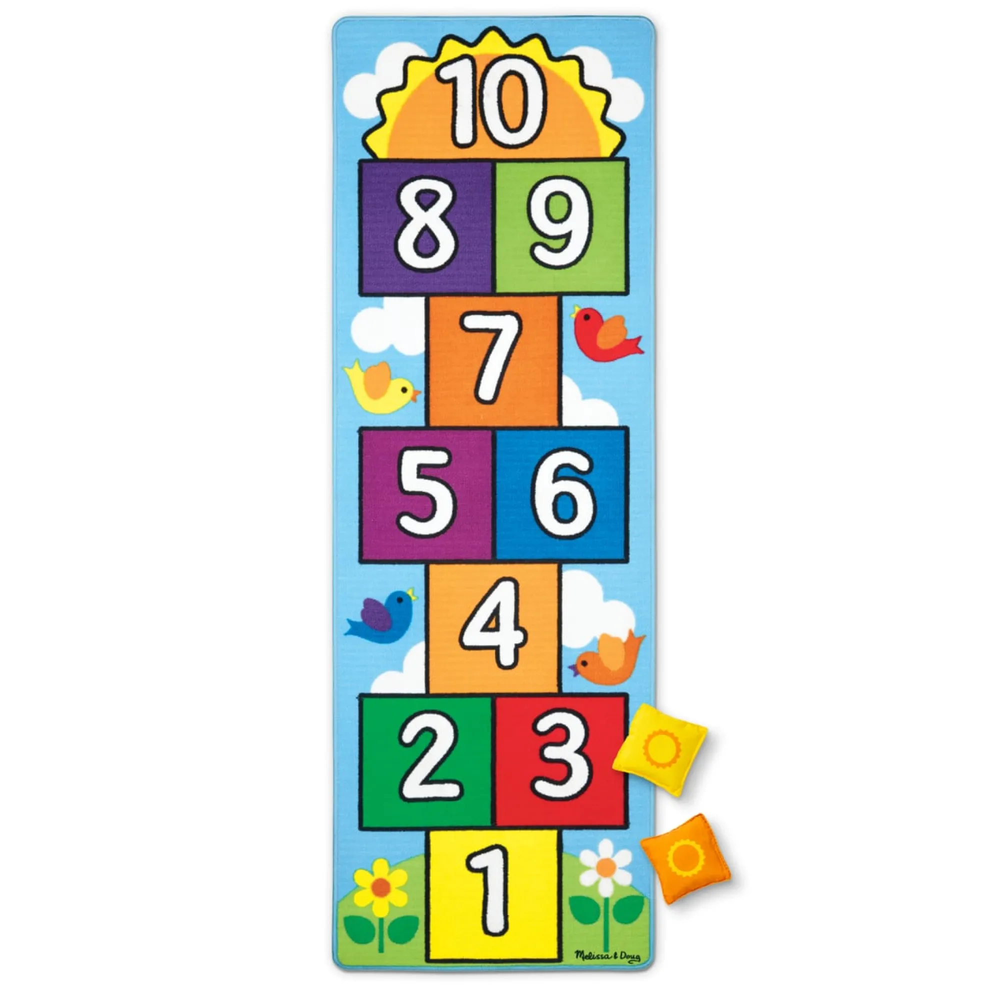 - Sturdy woven floor rug features hopscotch design for hours of jumping and counting