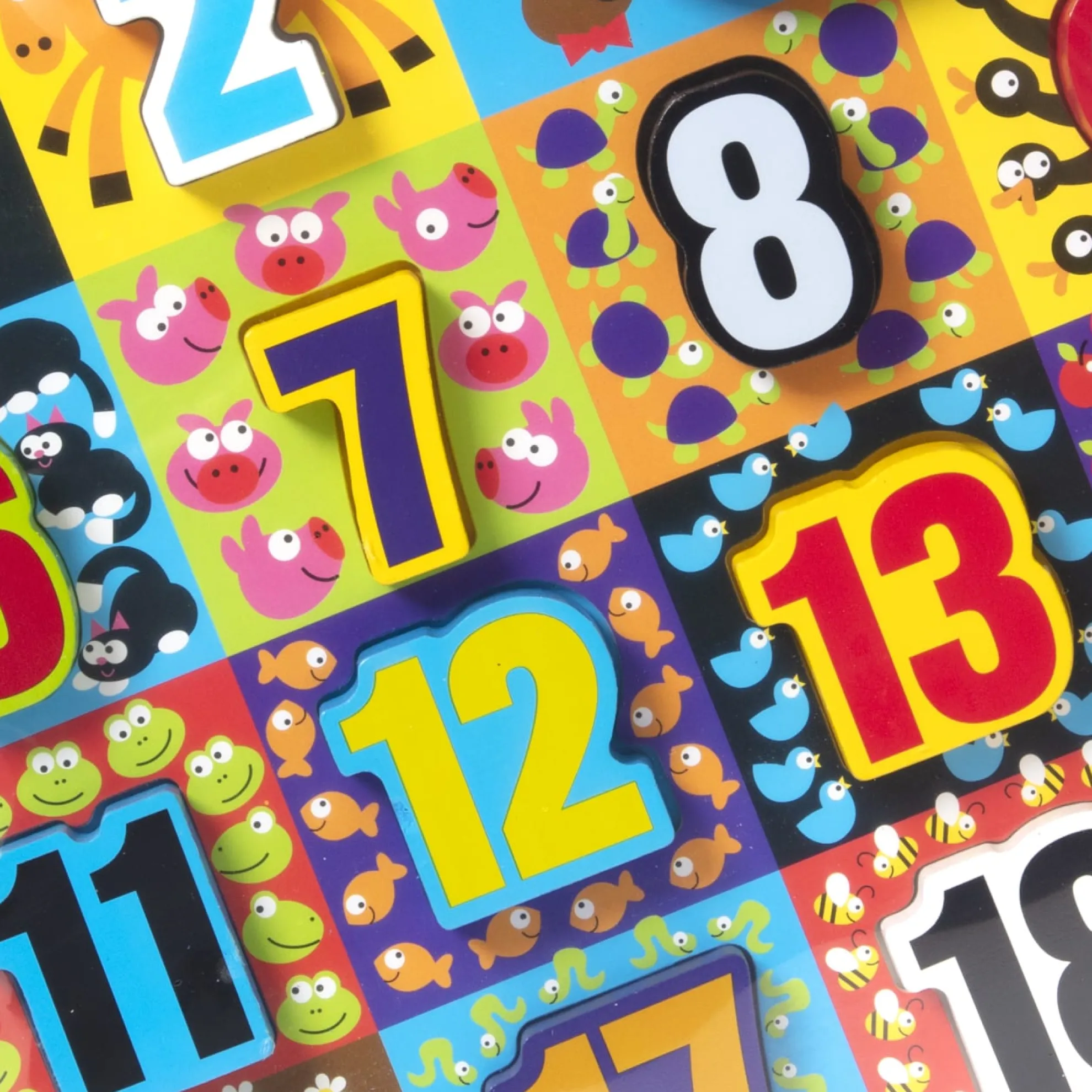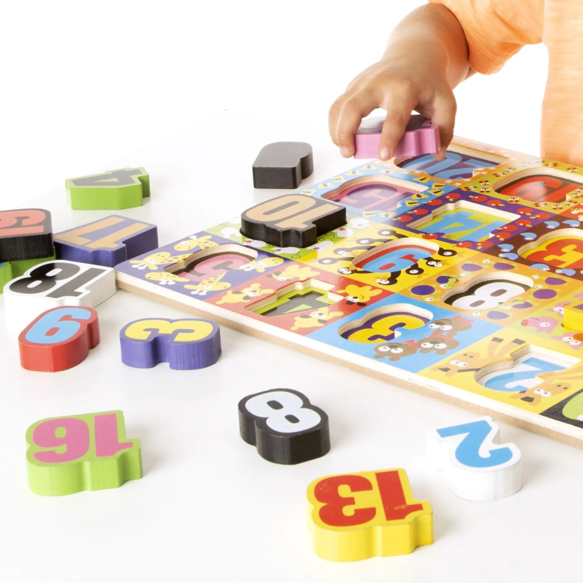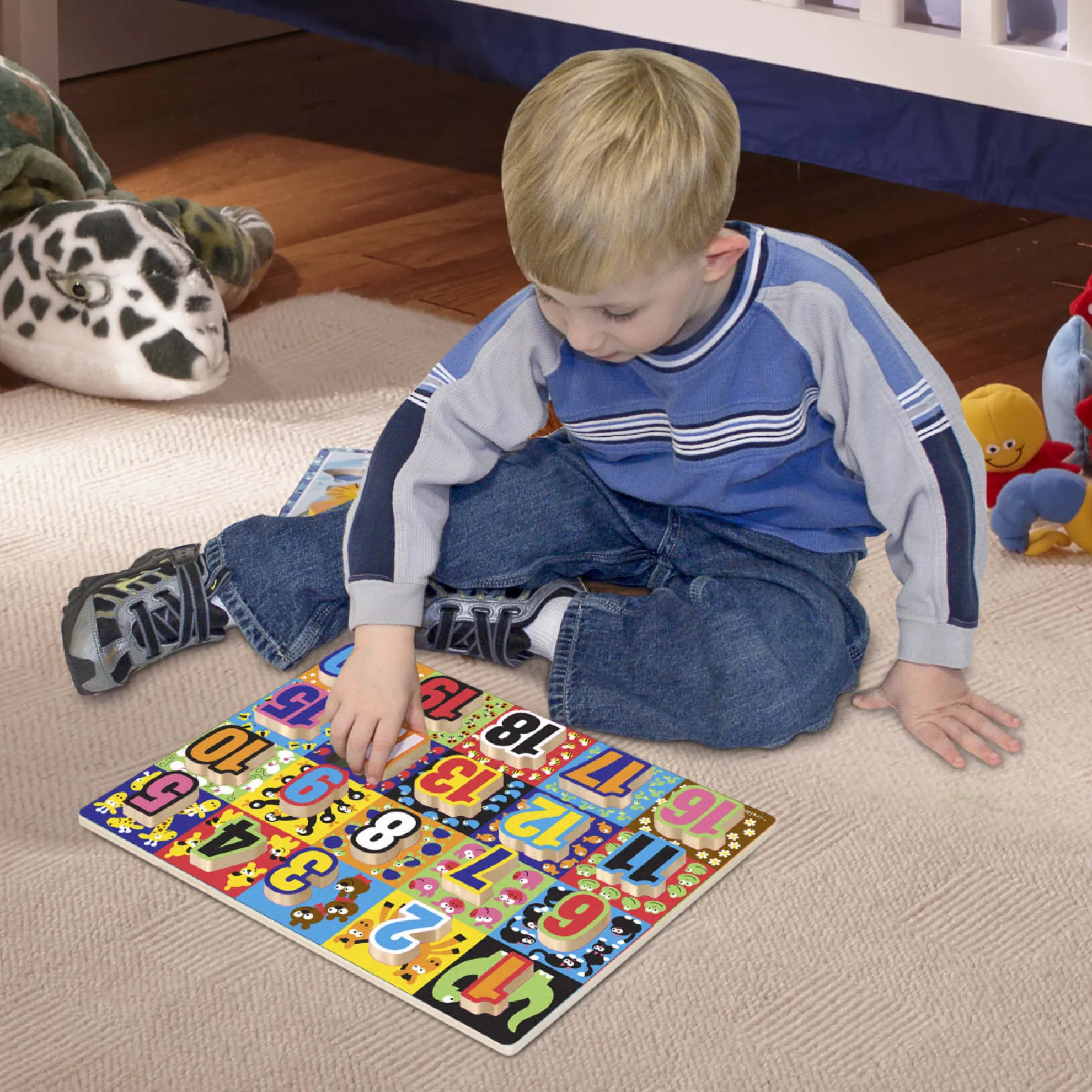 Counting fun begins with this extra thick wooden puzzle that includes 20 easy-grasp, chunky pieces (1-20). A full-color, matching number appears under each piece, and counting pictures equal to each numbered piece are shown on the puzzle board. Number pieces stand up. Encourages hand-eye, fine motor and early math skills.