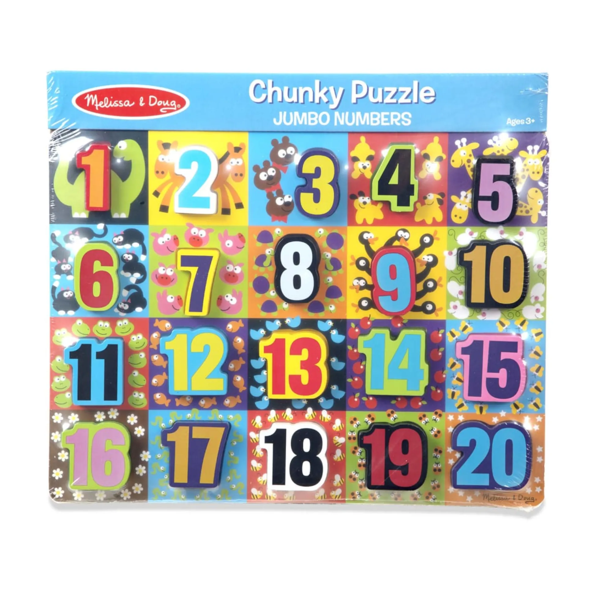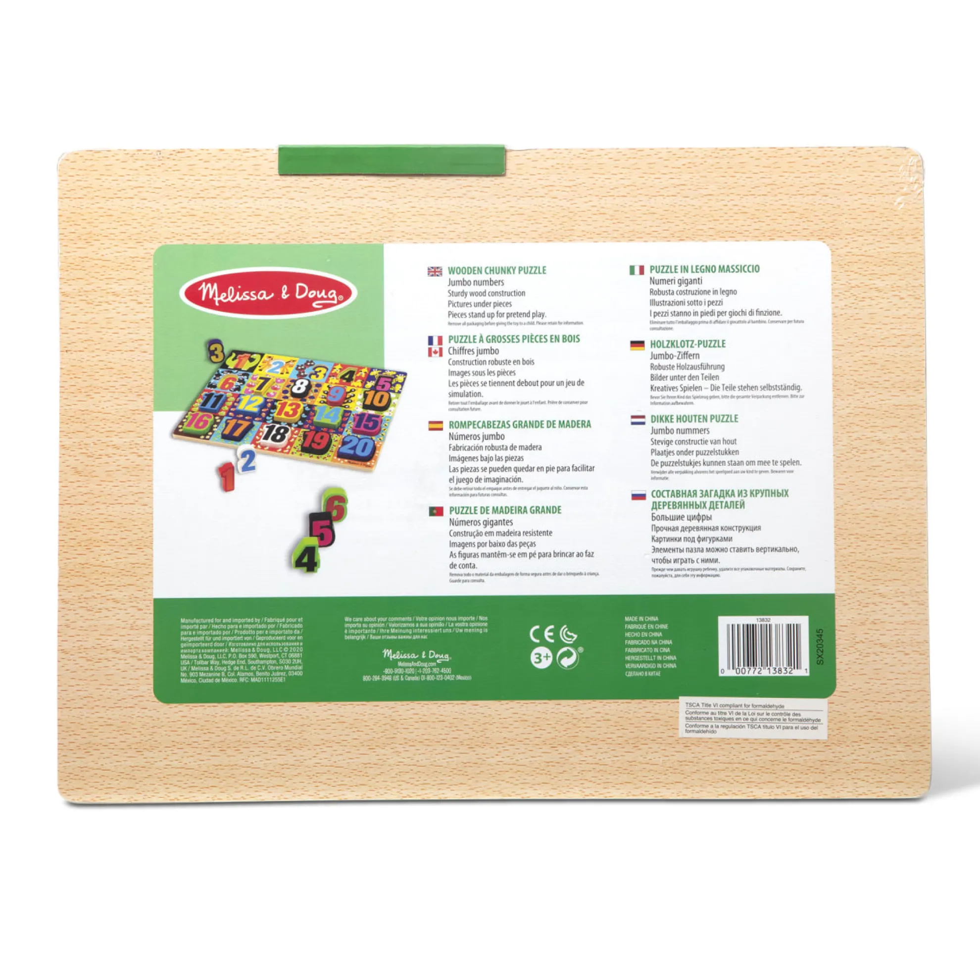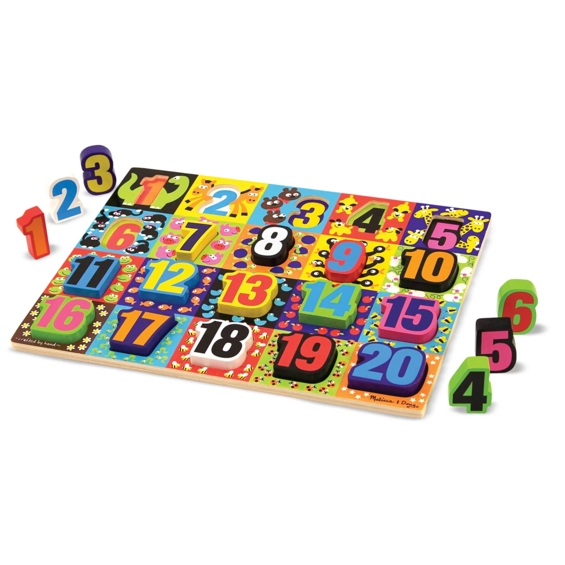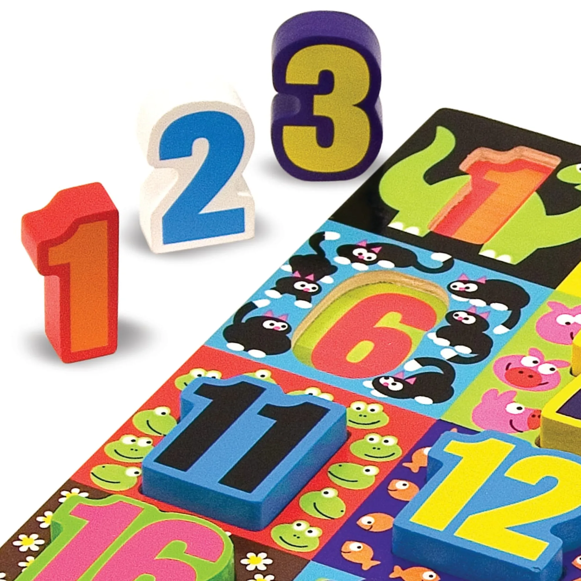 Counting fun begins with this extra thick wooden puzzle that includes 20 easy-grasp, chunky pieces (1-20). A full-color, matching number appears under each piece, and counting pictures equal to each numbered piece are shown on the puzzle board. Number pieces stand up. Encourages hand-eye, fine motor and early math skills.
