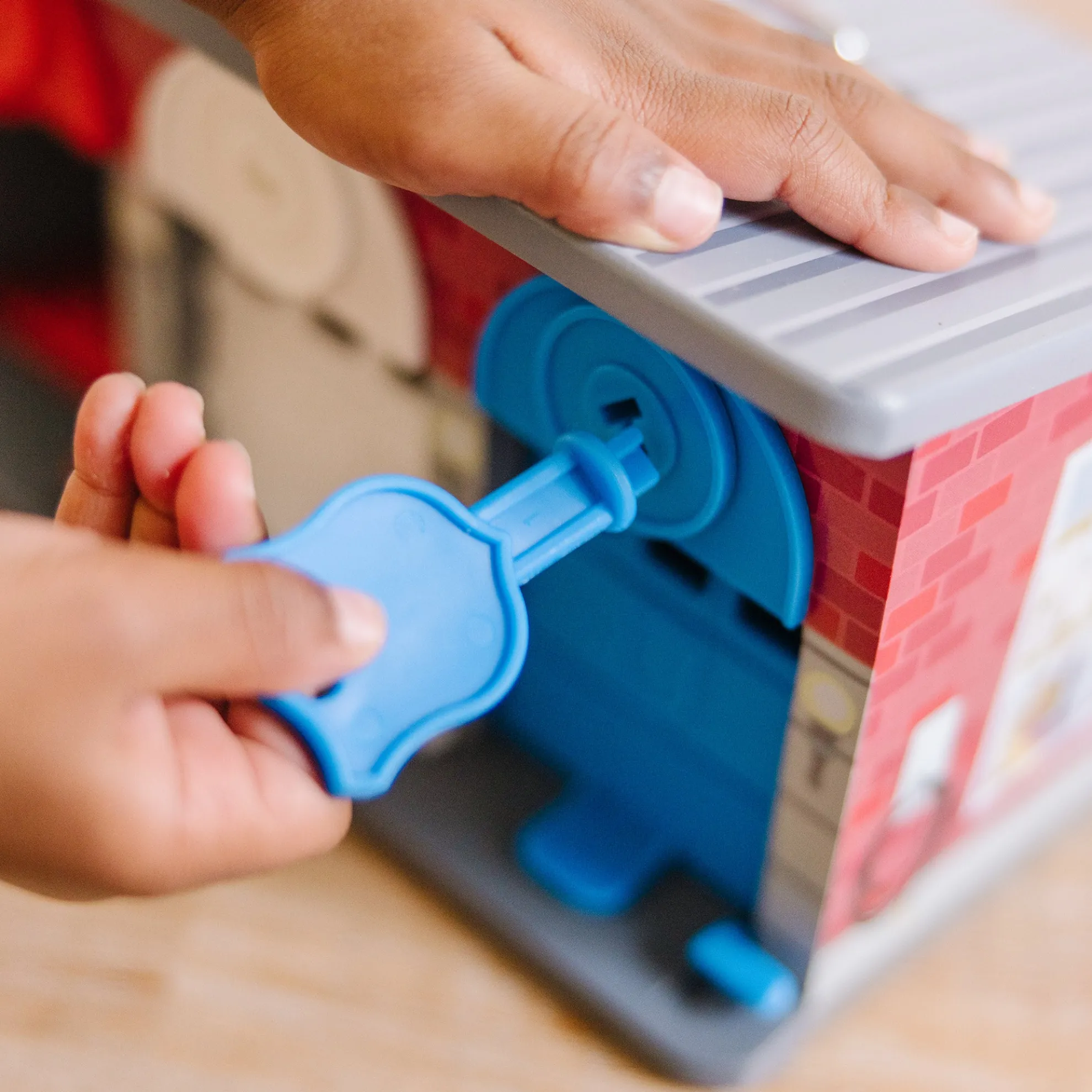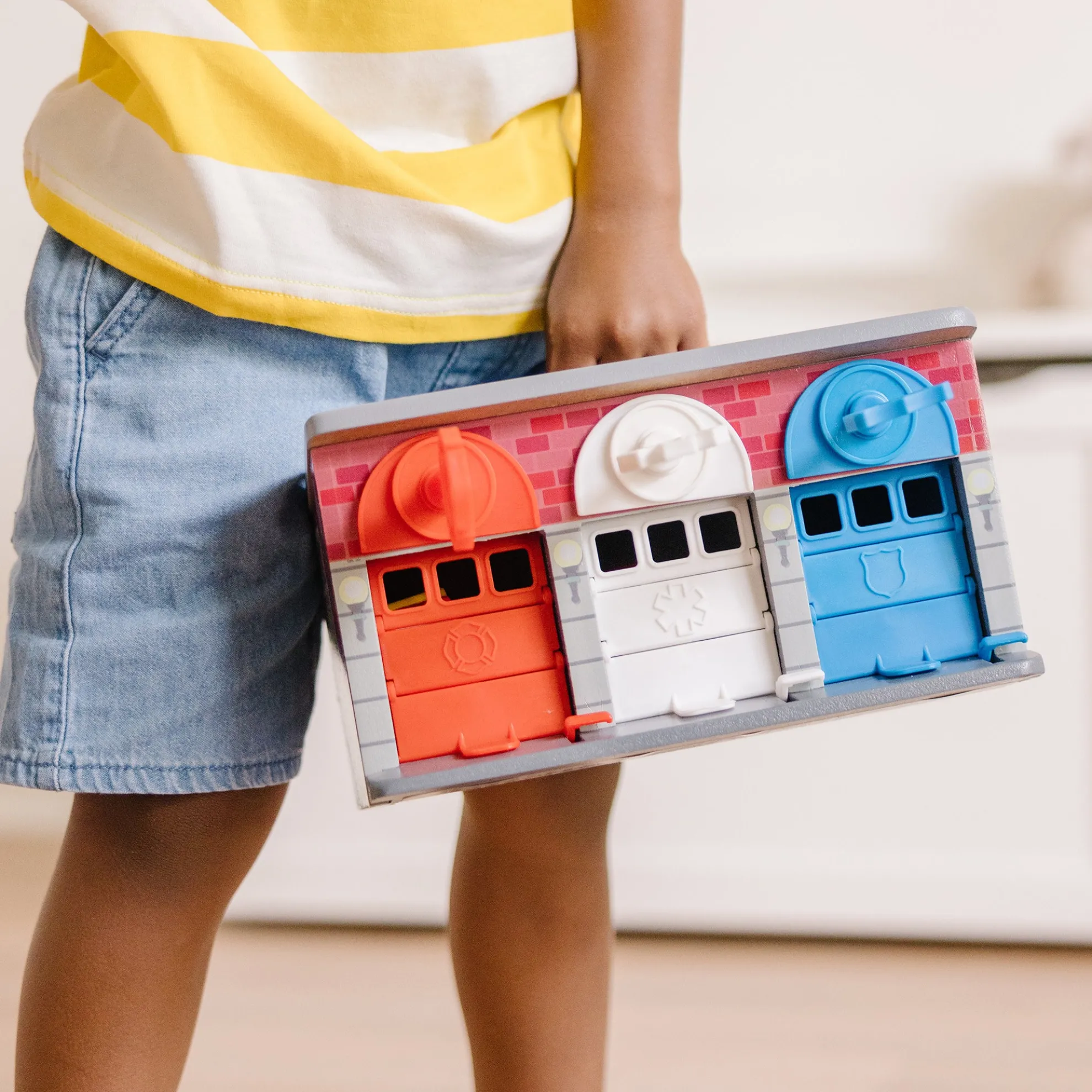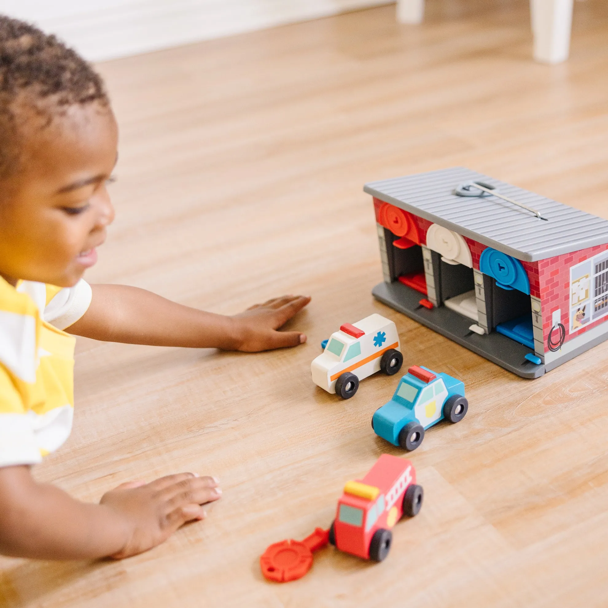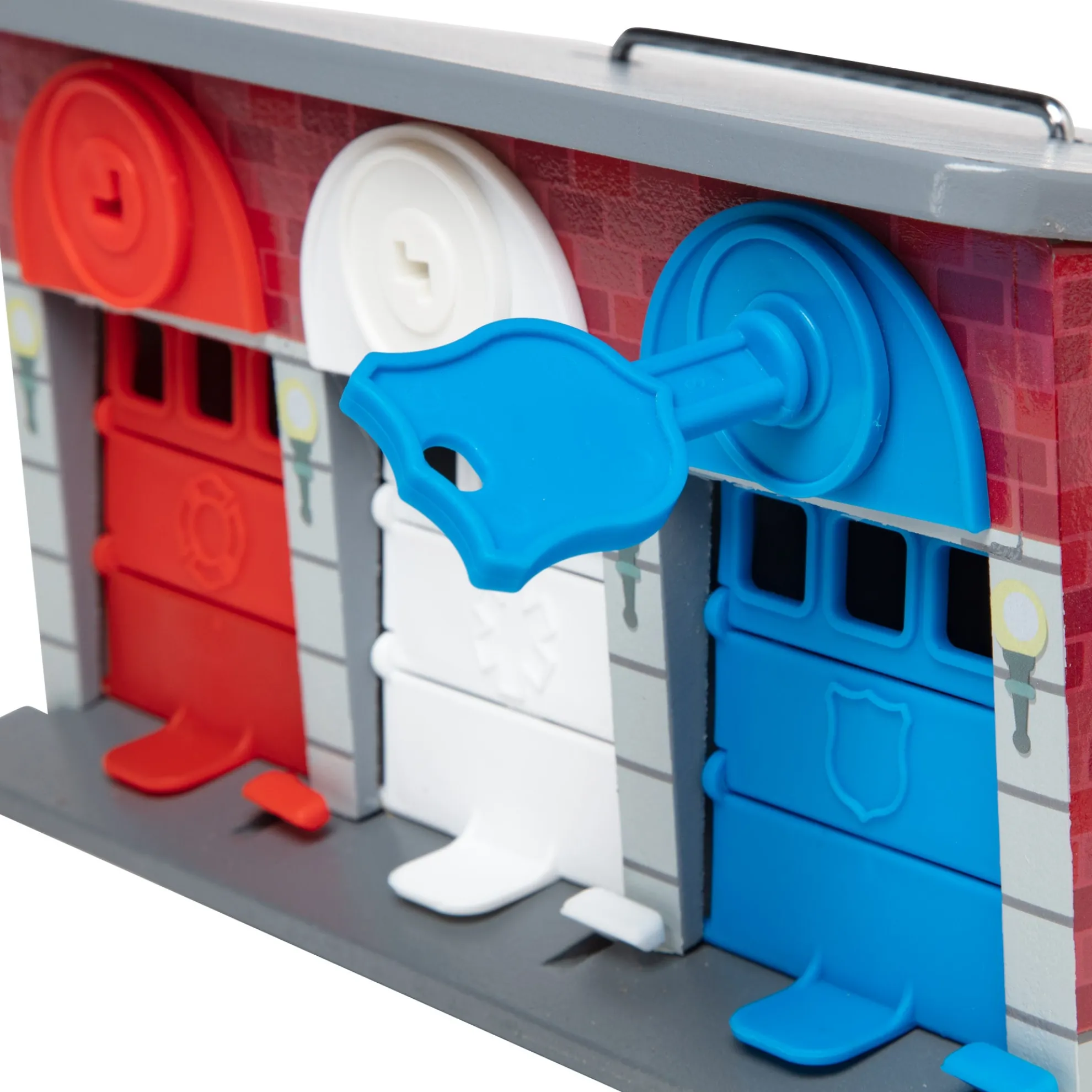 Behind the three doors of this take-along garage are three rescue vehicles ready to roll into action! Mach the colored keys to unlock the doors, slide the door to open the garage, press the buttons to release the ramp and send the vehicles racing to the rescue. Store the pieces away and carry off the whole set by its sturdy handle. The real heroes of this story? The dynamic duo of motor-skills practice and imaginative play!