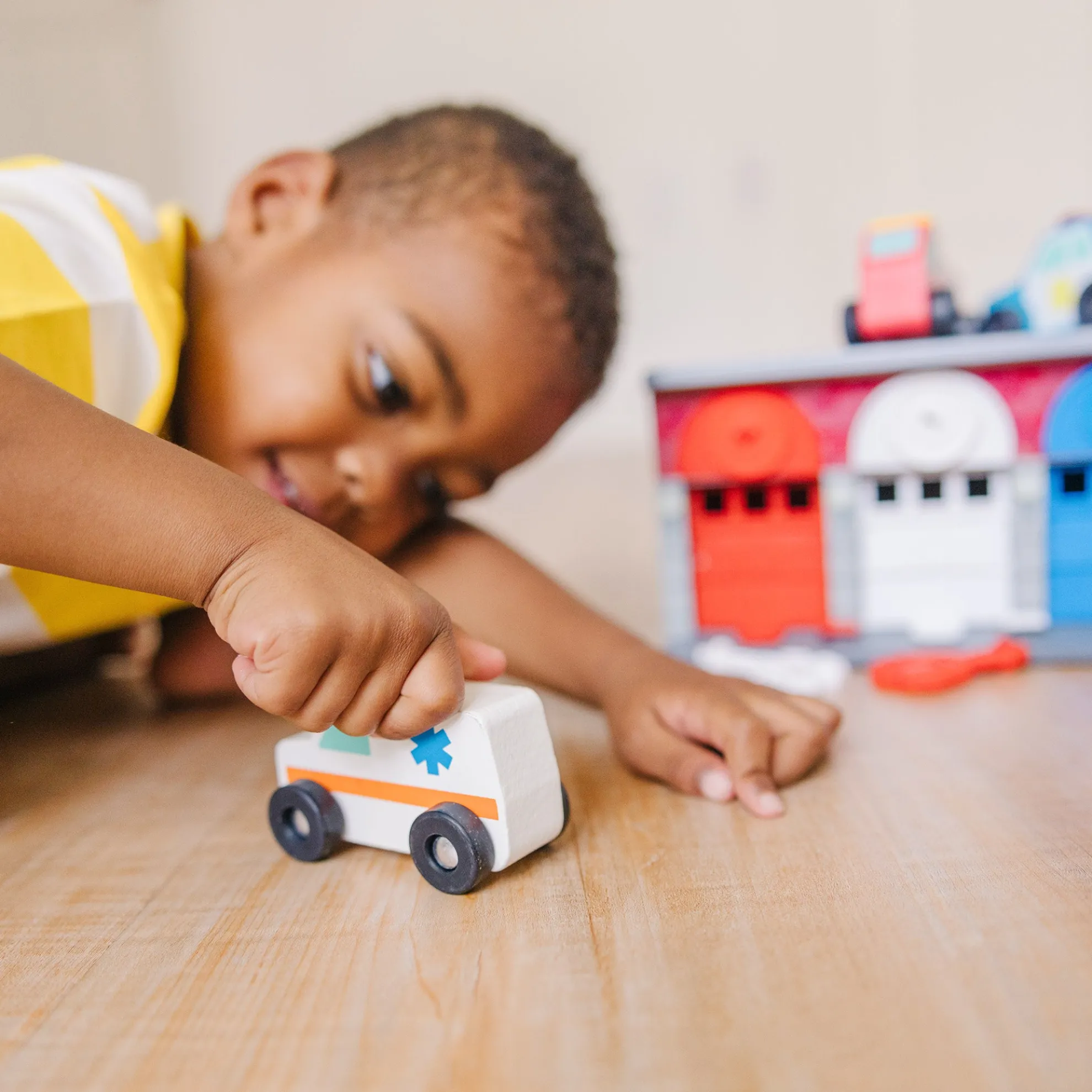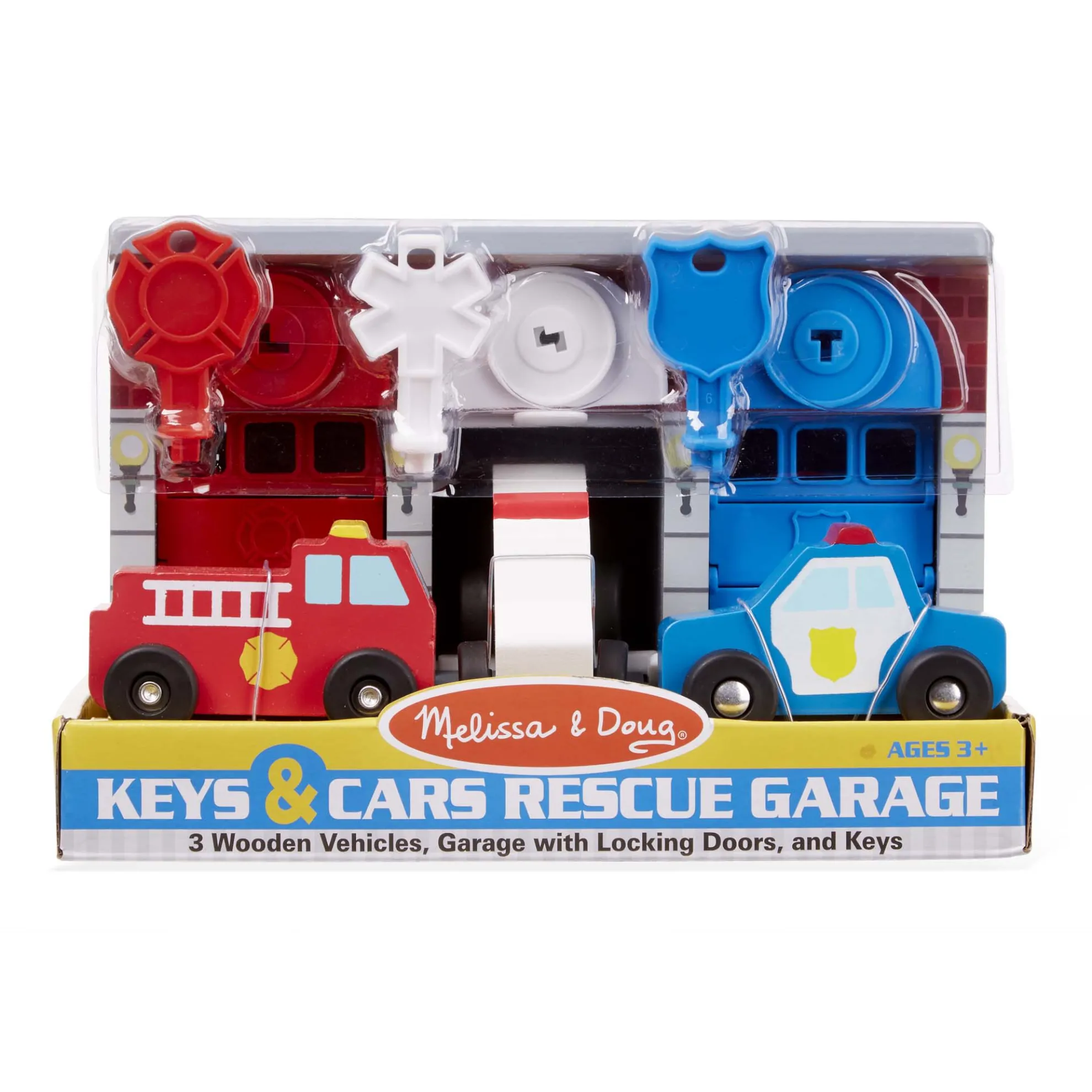 - Three-bay garage with locking doors, color-coded keys, and three wooden rescue vehicles