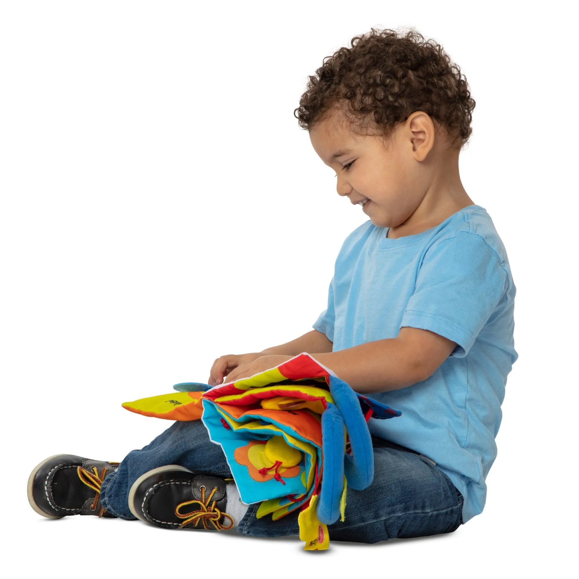 Turn the soft pages to discover fun first activities like buttoning, buckling, peek-a-boo, counting, matching, and telling time! This cloth book with built-in handles includes a removable hand puppet, two finger puppets, and a crinkling surprise! There’s a clock with movable hands and a shoe with self-stick tab buckles. This fun, interactive, multi-textured book helps promote sensory development, fine motor skills, color recognition, and other early learning skills. It’s durably constructed to last through story time, playtime, and the washing machine, too. The book comes in a clear tote with a handle.