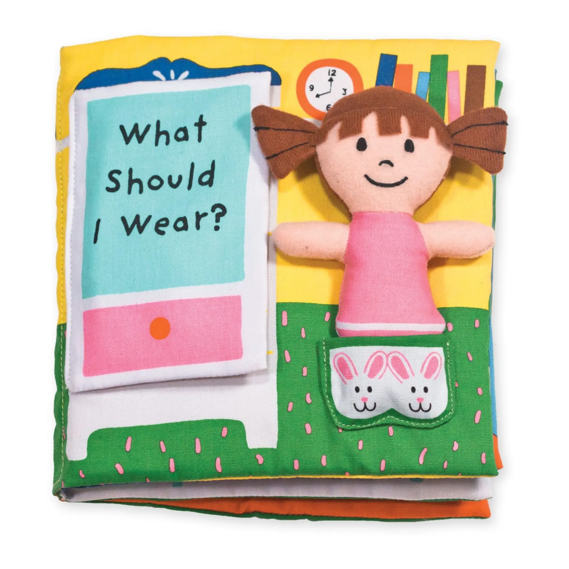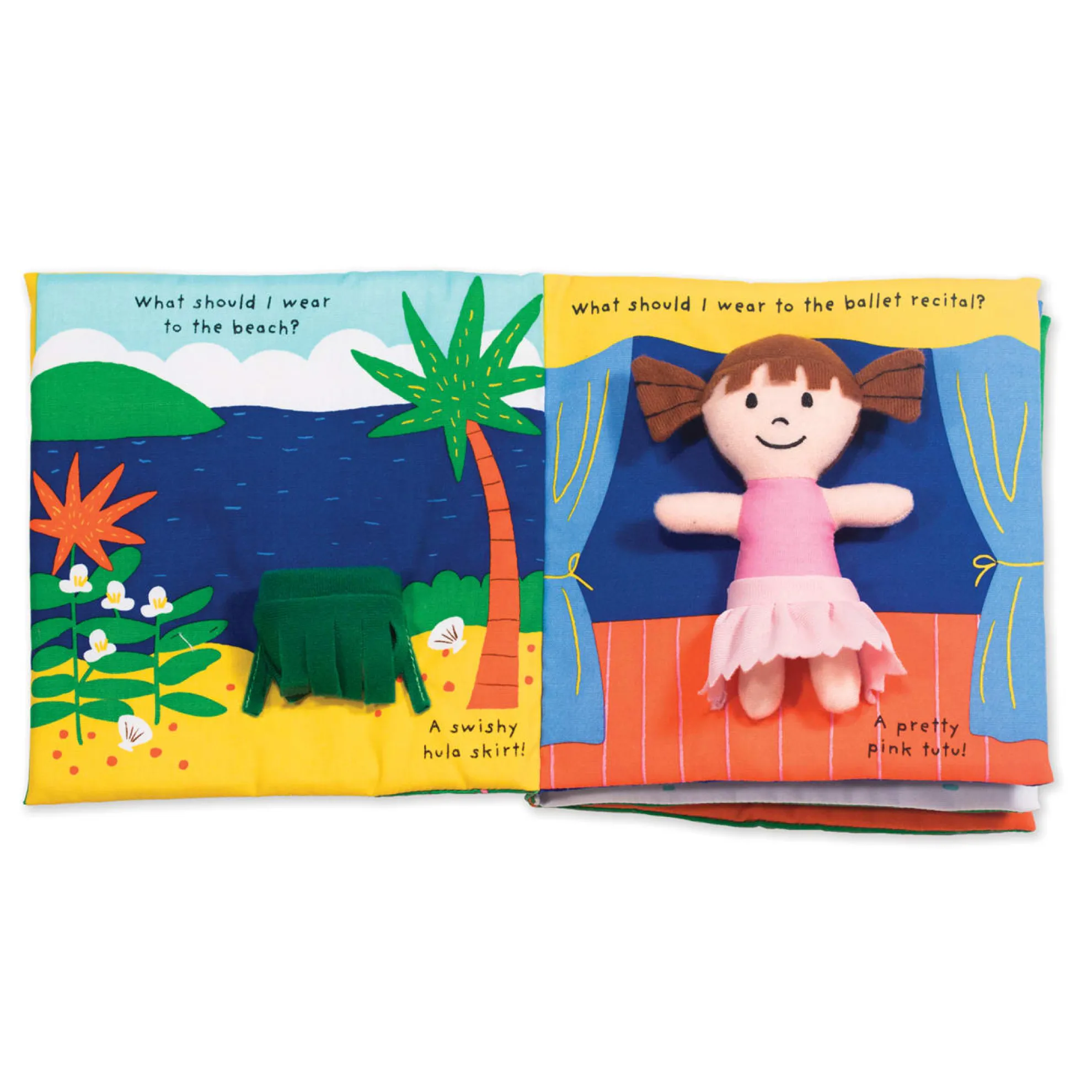 What should dolly wear for a beach trip, a dance recital, or a snowy day? Move her from page to page in this crinkling, lift-the-flap, dress-up activity book to find the perfect outfit for any occasion. Melissa & Doug K’s Kids cloth books are durably constructed to last through story time, playtime, and the washing machine, too.