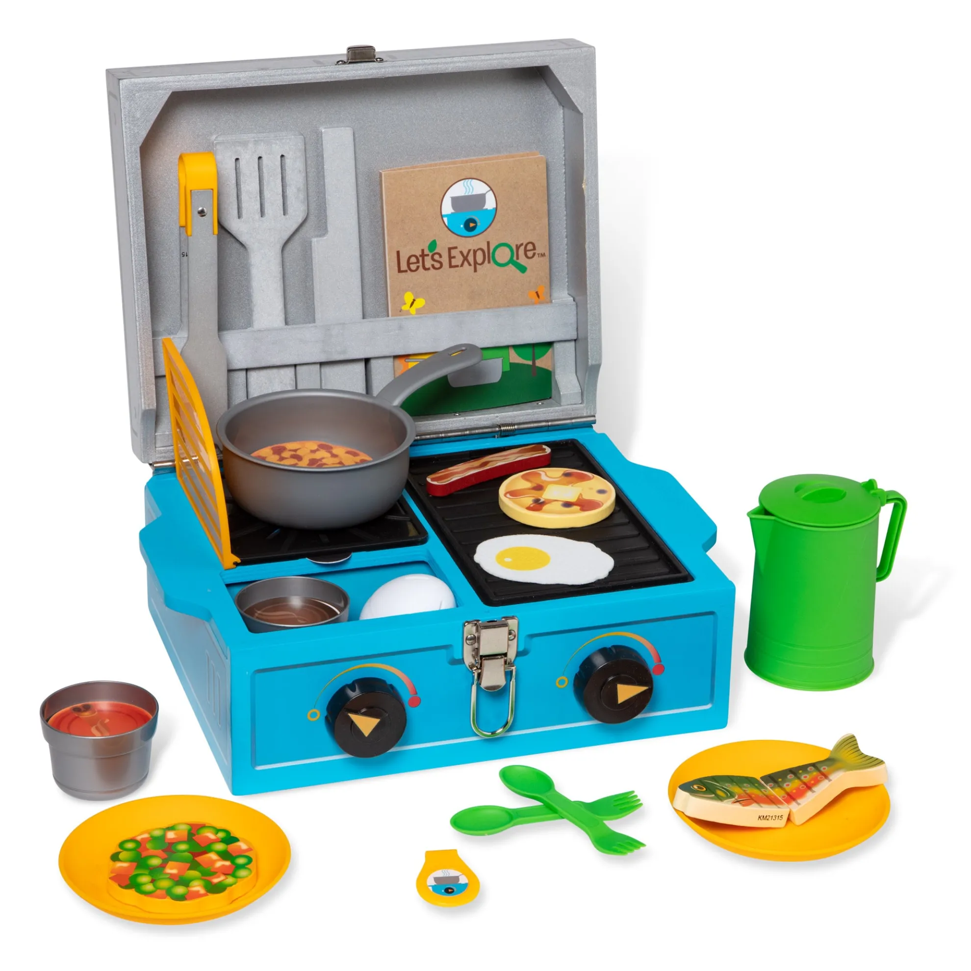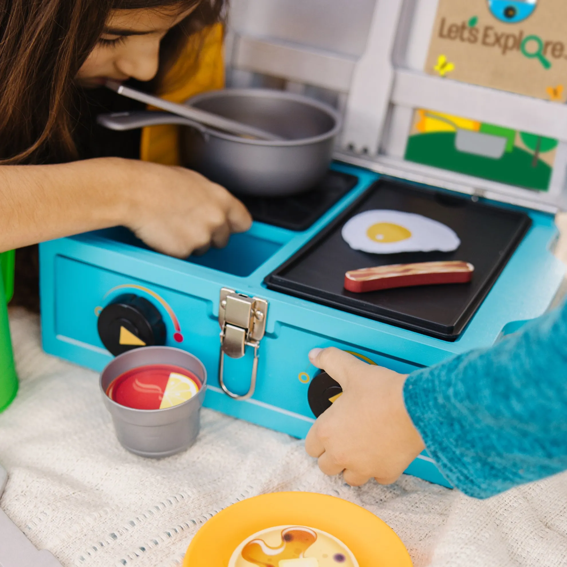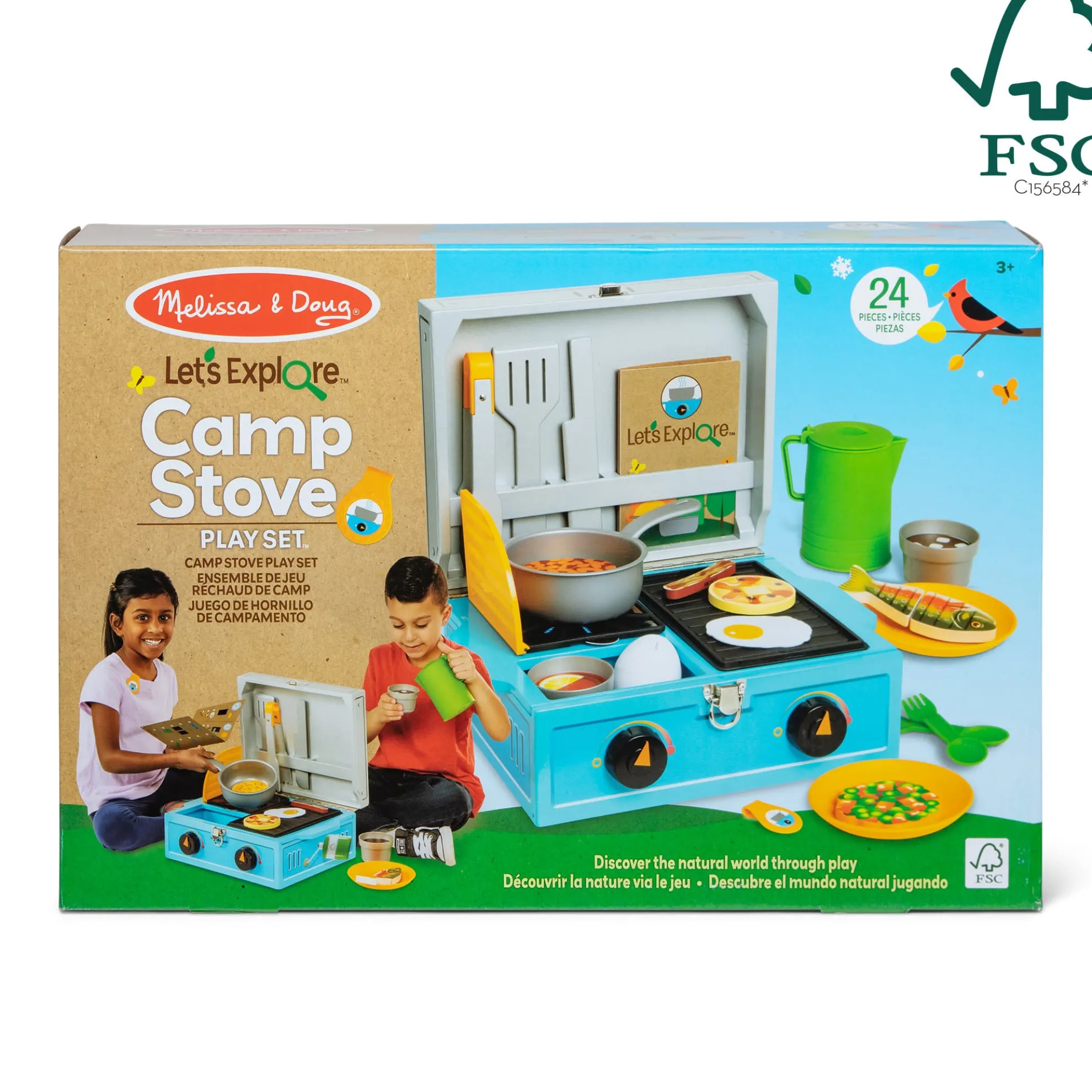 Explore the experience of outdoor camp cooking with the 24-piece Melissa & Doug Let’s Explore™ Camp Stove Play Set! The wooden play stove has knobs that turn, an adjustable “burner,” and a double-sided grill and griddle. Wooden utensils, felt and wooden play food, two durable plates and sporks, cups, kettle, collectible medallion, and a reusable activity book all store the stove for quick and easy cleanup! Let’s Explore™ encourages kids three and older to connect with the natural world through imaginative play! Discover the joy of outdoor adventures that instill curiosity and confidence while inspiring kids to say, “Let’s Explore™”! This product is certified by the Forest Stewardship Council. FSC certification ensures that products come from responsibly managed forests that provide environmental, social, and economic benefits, and that forests are protected for future generations. Please note that FSC certification applies to new inventory only (FSC C156584)