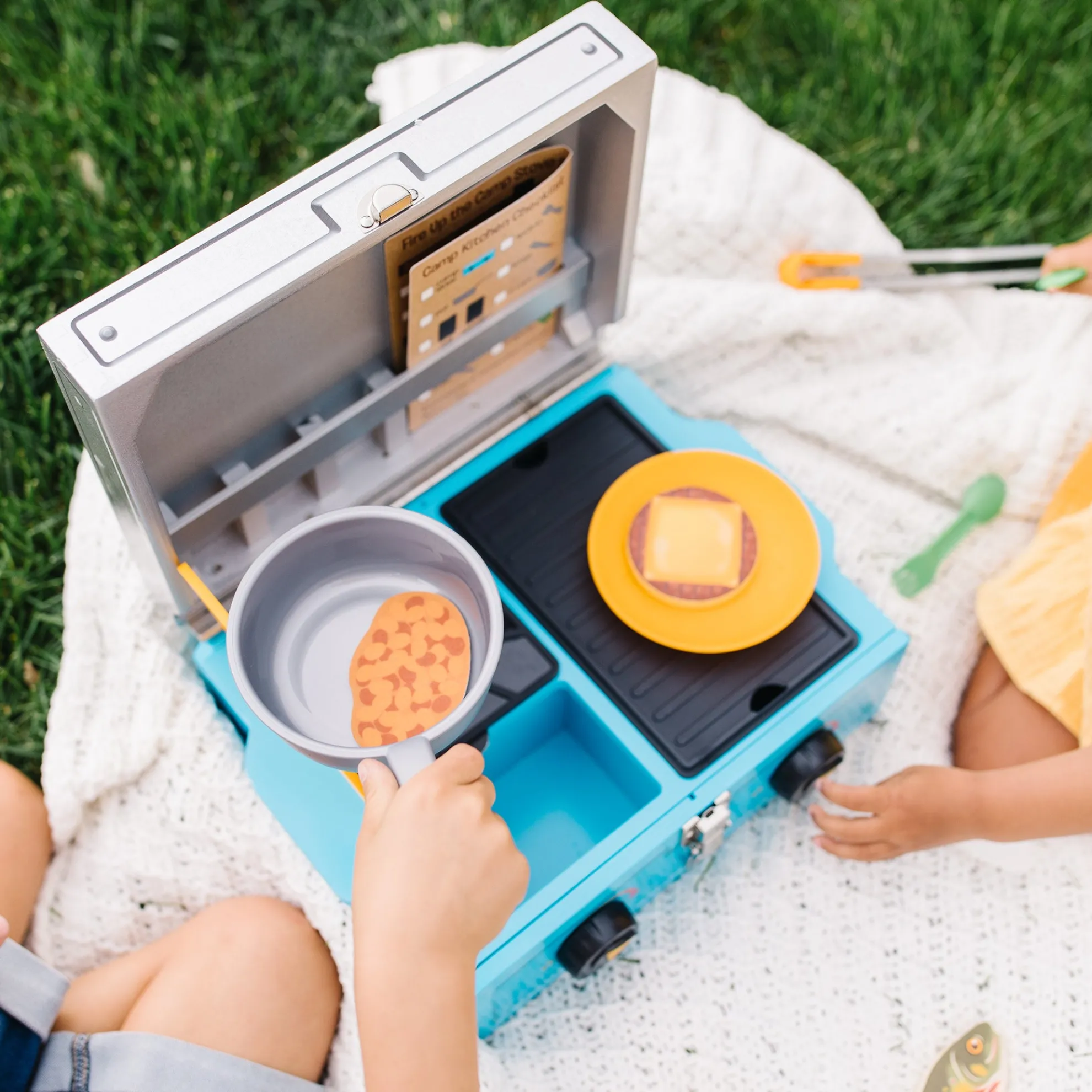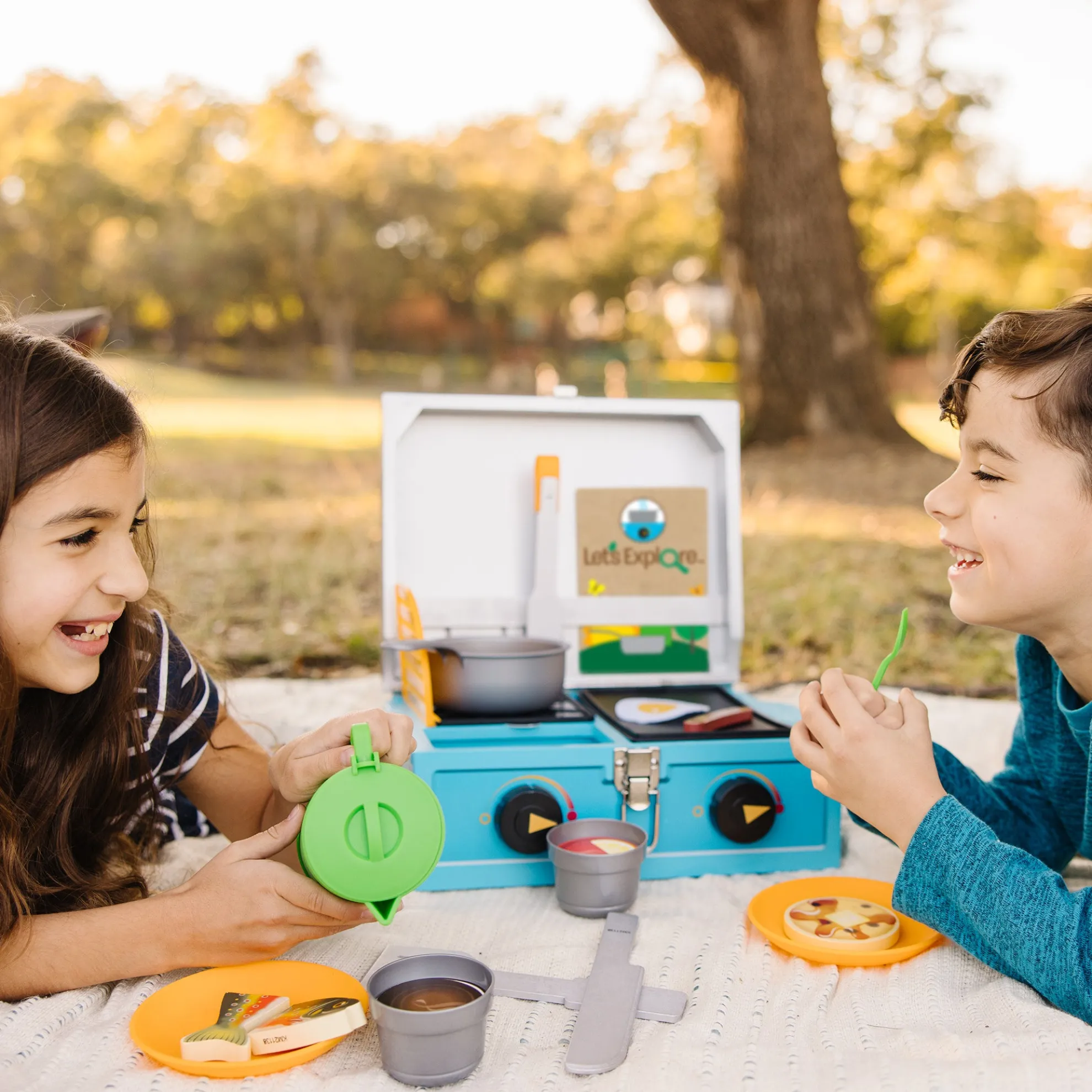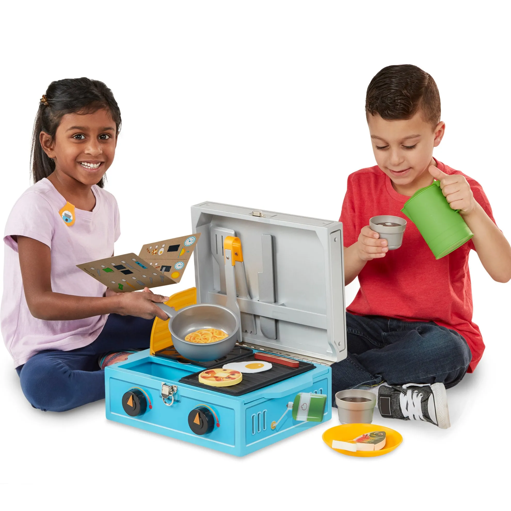 Explore the experience of outdoor camp cooking with the 24-piece Melissa & Doug Let’s Explore™ Camp Stove Play Set! The wooden play stove has knobs that turn, an adjustable “burner,” and a double-sided grill and griddle. Wooden utensils, felt and wooden play food, two durable plates and sporks, cups, kettle, collectible medallion, and a reusable activity book all store the stove for quick and easy cleanup! Let’s Explore™ encourages kids three and older to connect with the natural world through imaginative play! Discover the joy of outdoor adventures that instill curiosity and confidence while inspiring kids to say, “Let’s Explore™”! This product is certified by the Forest Stewardship Council. FSC certification ensures that products come from responsibly managed forests that provide environmental, social, and economic benefits, and that forests are protected for future generations. Please note that FSC certification applies to new inventory only (FSC C156584)