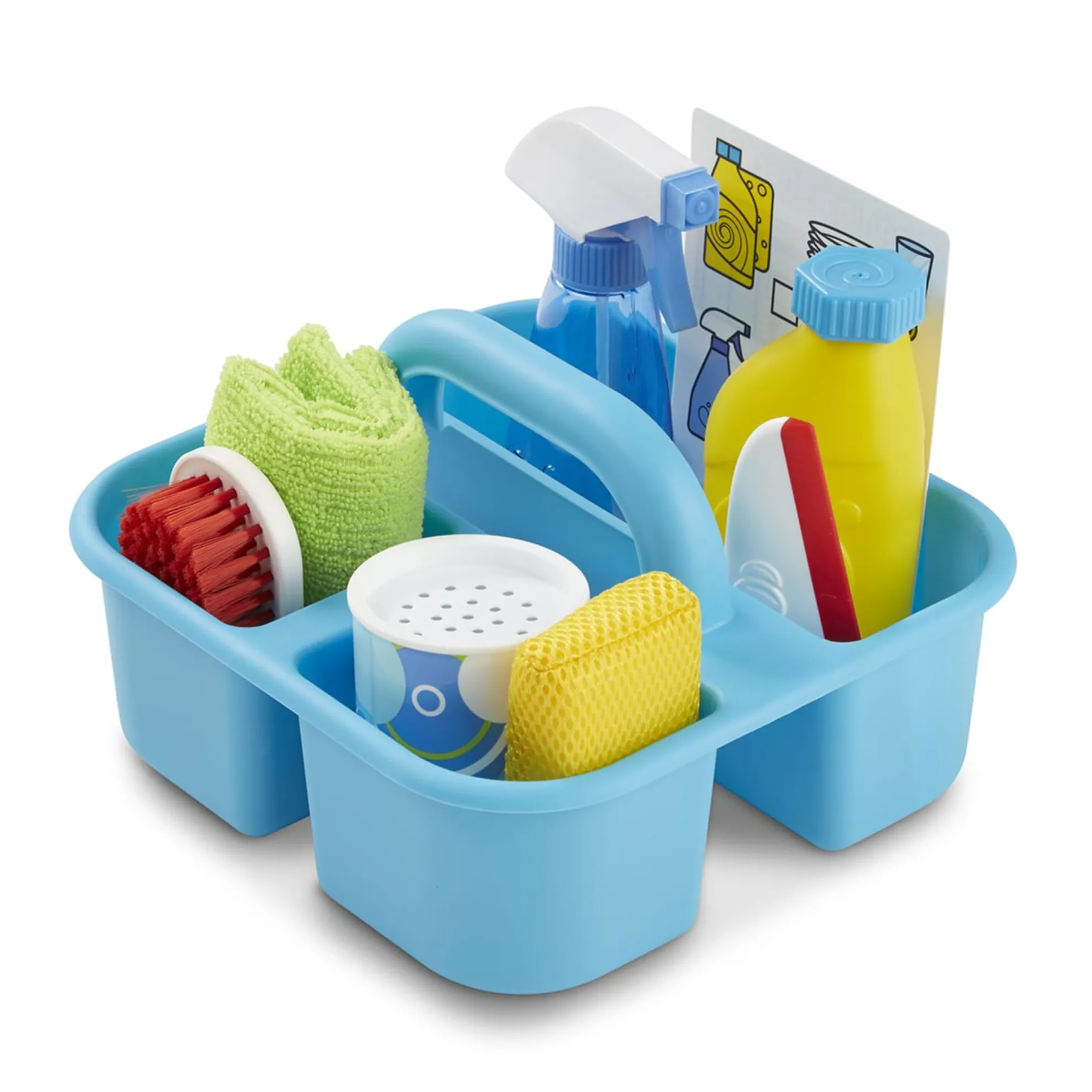 Part of playing house is keeping things sparkling clean! This pretend play cleaning set lets kids spray, squirt, squeegee, scour, and scrub using either real water or their imaginations. The spray bottle, scouring powder can, and soap bottle can be filled with water, making it perfect as a bath toy. The nine-piece set also includes supplies to keep things shining like a soft cloth, a scrub brush, a sponge, and a rubber-tipped squeegee! There’s even a reusable checklist that helps kids learn what items work best to clean different household objects and areas. All of the supplies store neatly in the durable caddy with a built-in handle for easy toting. Promotes fine and gross motor skills and encourages imaginative play. Not for use with real cleaning materials.