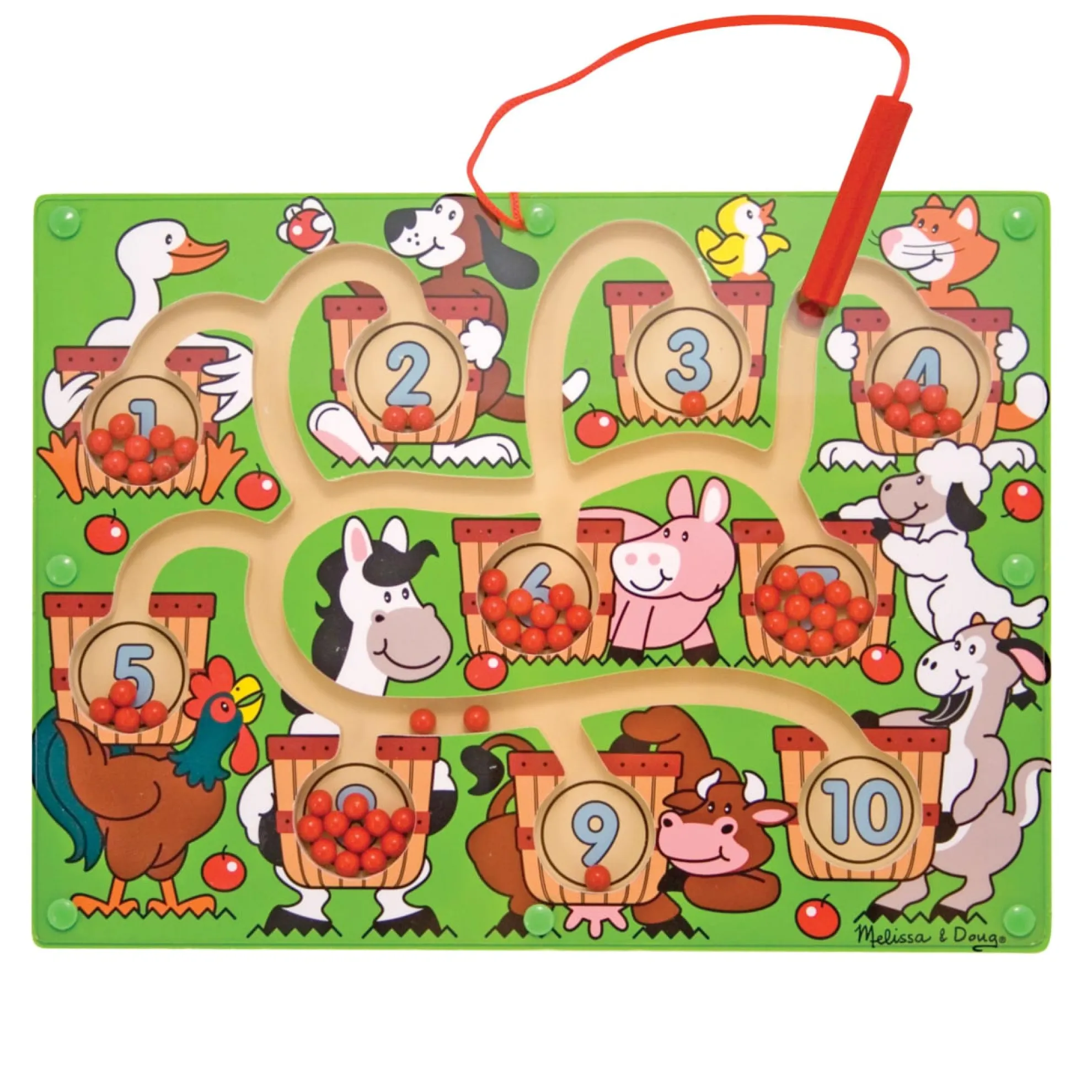 One for the goose and ten for the goat…in the Magnetic Wand Number Maze, the animals are counting on you! Fill each basket with the correct number of red “apples” by sliding the attached magnetic wand over the acrylic cover. Then move the apples to different areas of the maze game to add, subtract, and make child’s play out of math! The magnetic wand is attached so it won’t get lost; all other pieces are enclosed inside the maze, beneath the sturdy cover. Great for travel!