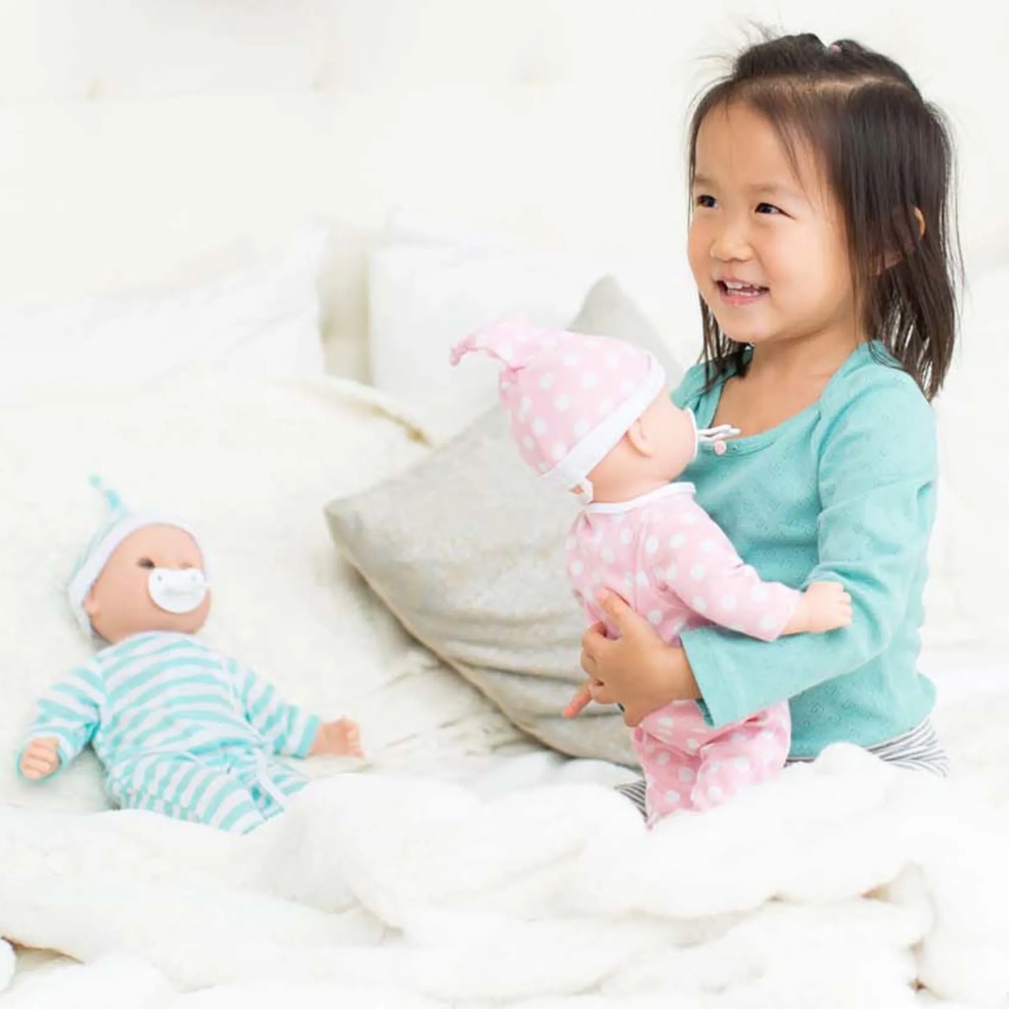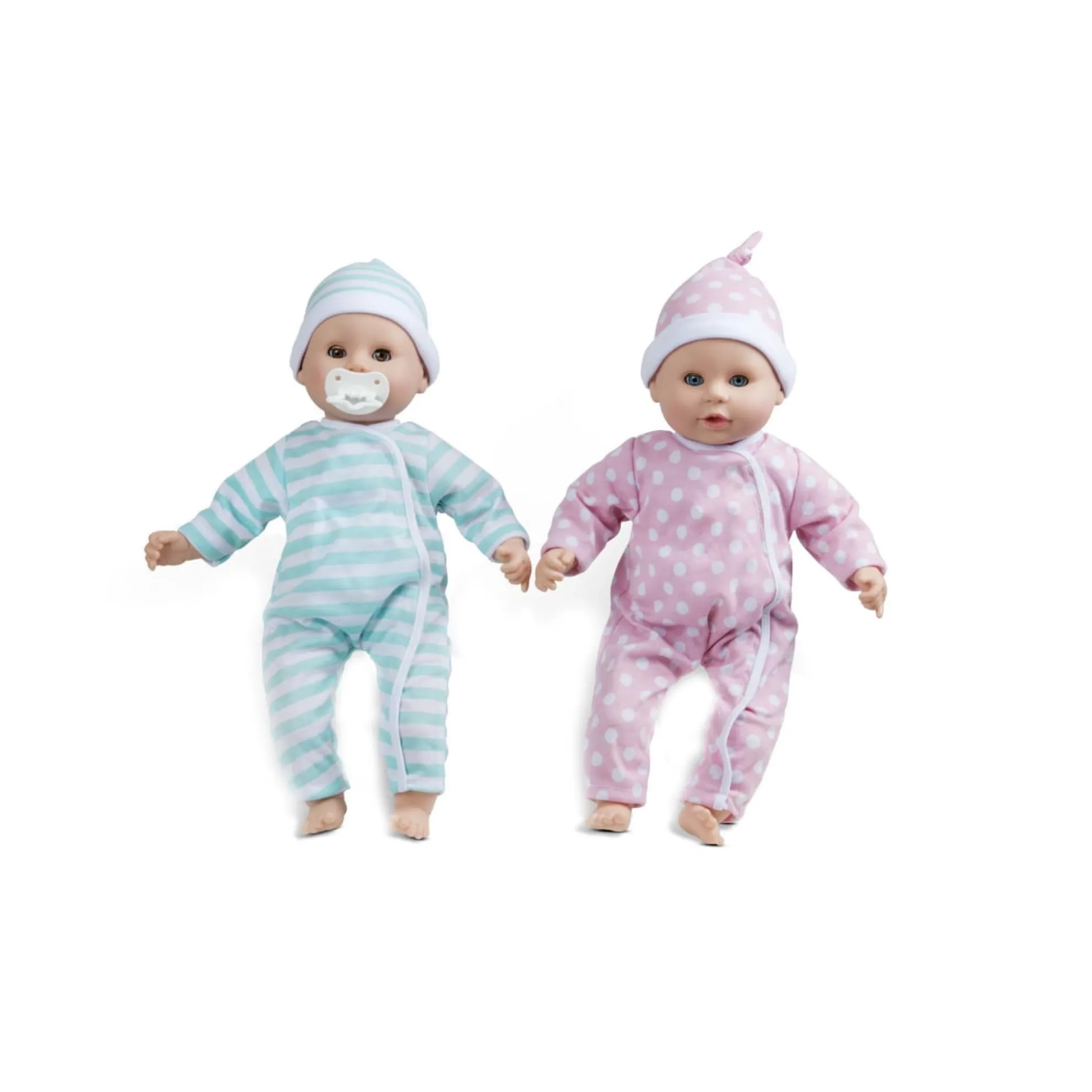 - Two 15-inch clothed boy and girl baby dolls with light skin tone that can suck their thumbs or pacifiers