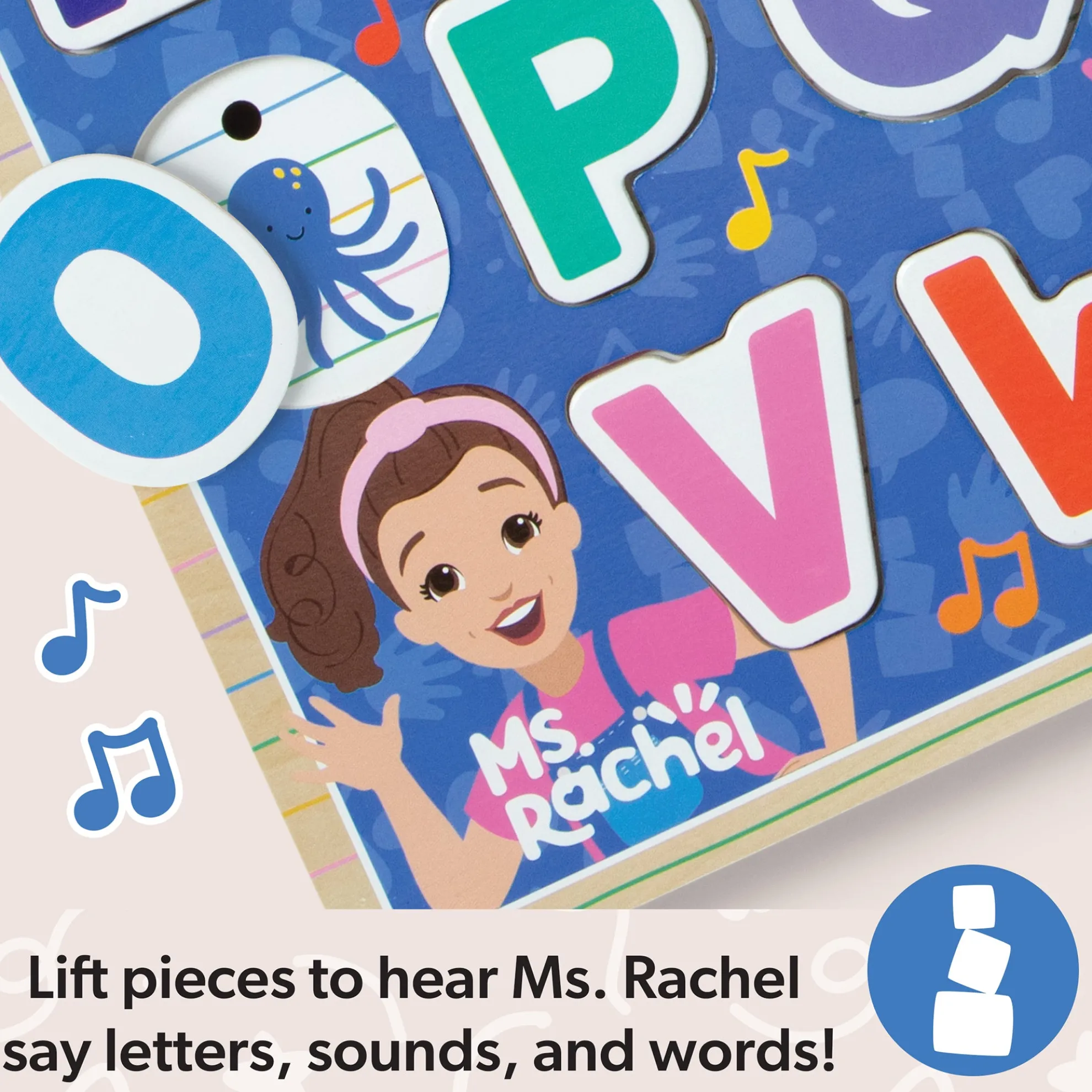 - OFFICIAL MS. RACHEL TOYS: Lift 26 wooden letter-shaped pieces to hear Ms. Rachel say the letter, it’s sound and a word beginning with that letter (on/off switch for quiet play; 2 AAA batteries required, not included; sounds are light-activated – for best results, use in bright, direct light)