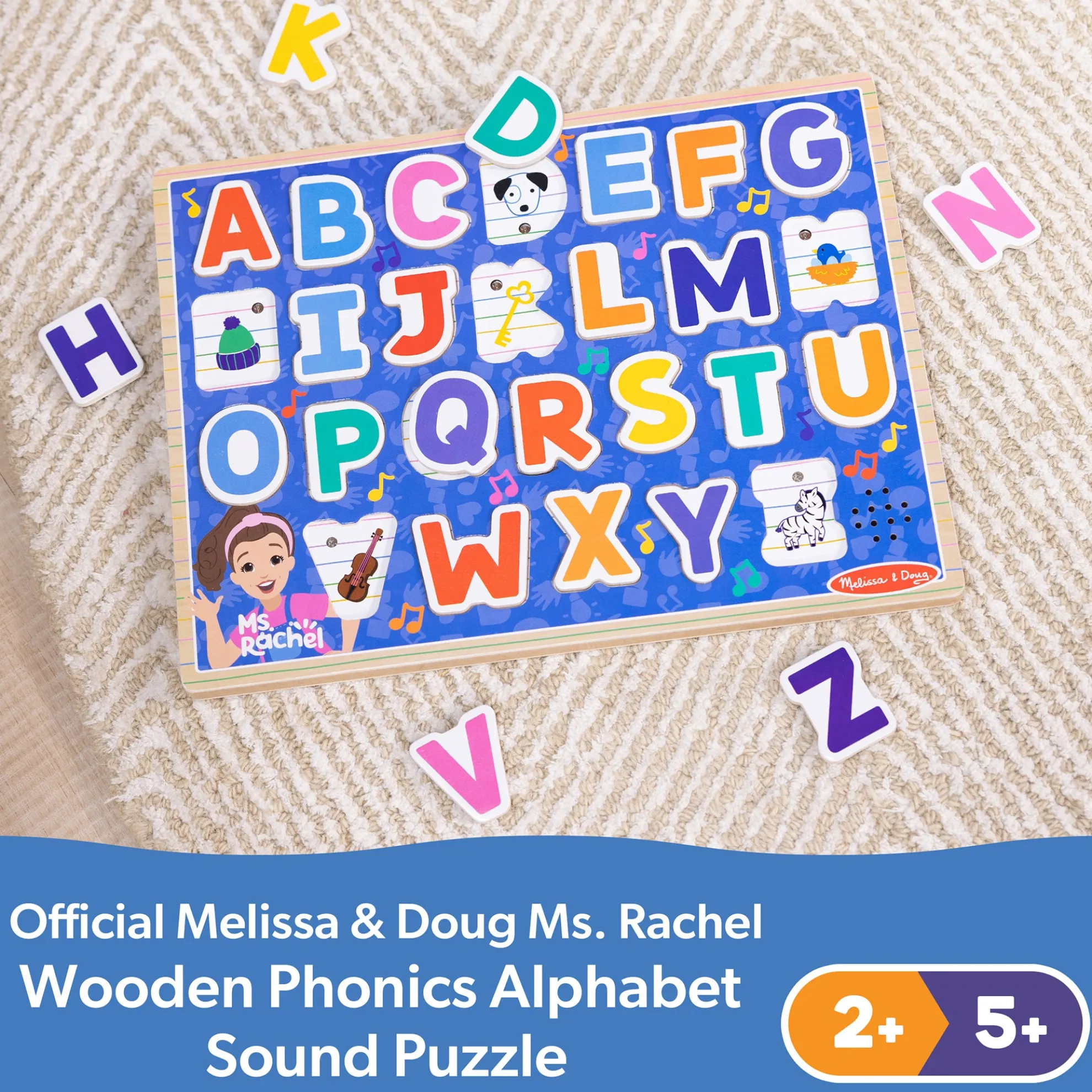 Kids will love hearing and learning to say the alphabet with their favorite educator, Ms. Rachel! The 26-piece Melissa & Doug® Ms. Rachel™ Wooden Phonics Alphabet Sound Puzzle includes favorites from Ms. Rachel’s popular baby and toddler videos. Lift the pieces to hear Ms. Rachel pronounce letter sounds and words that begin with each. An on/off switch allows for quiet play (2 AAA batteries required, not included; sounds are light-activated – for best results, use in bright, direct light). Pictures under pieces help with matching and boost self-esteem. Encourage language, memory, spatial awareness, problem-solving skills and more with this Melissa & Doug puzzle and Melissa & Doug toys. These Melissa and Doug toys are toddler learning toys, designed by Ms. Rachel and developmental experts, to support all children, through their ages and stages, from 2-5+ years. Ms. Rachel toys are ideal newborn toys, toddler toys, preschool toys, and wooden toys. From baby shower gifts to baby essentials, these products help babies and families learn, bond, and thrive. Ms. Rachel is a real teacher and passionate educator, with two master’s degrees in education, who creates research-based videos and products to support learning for littles.