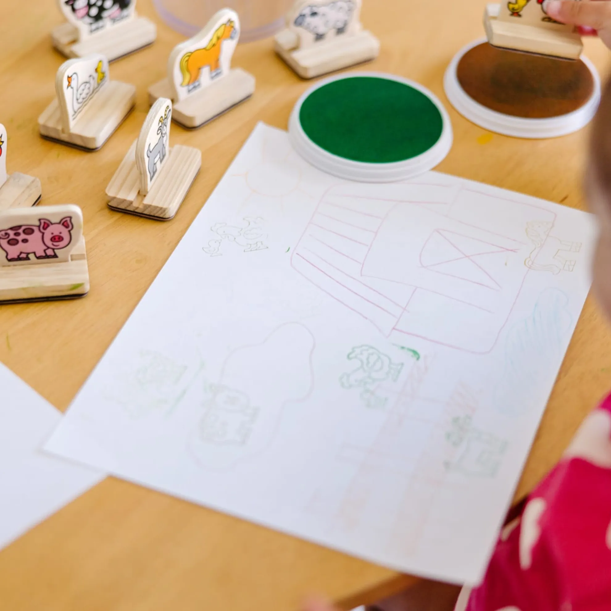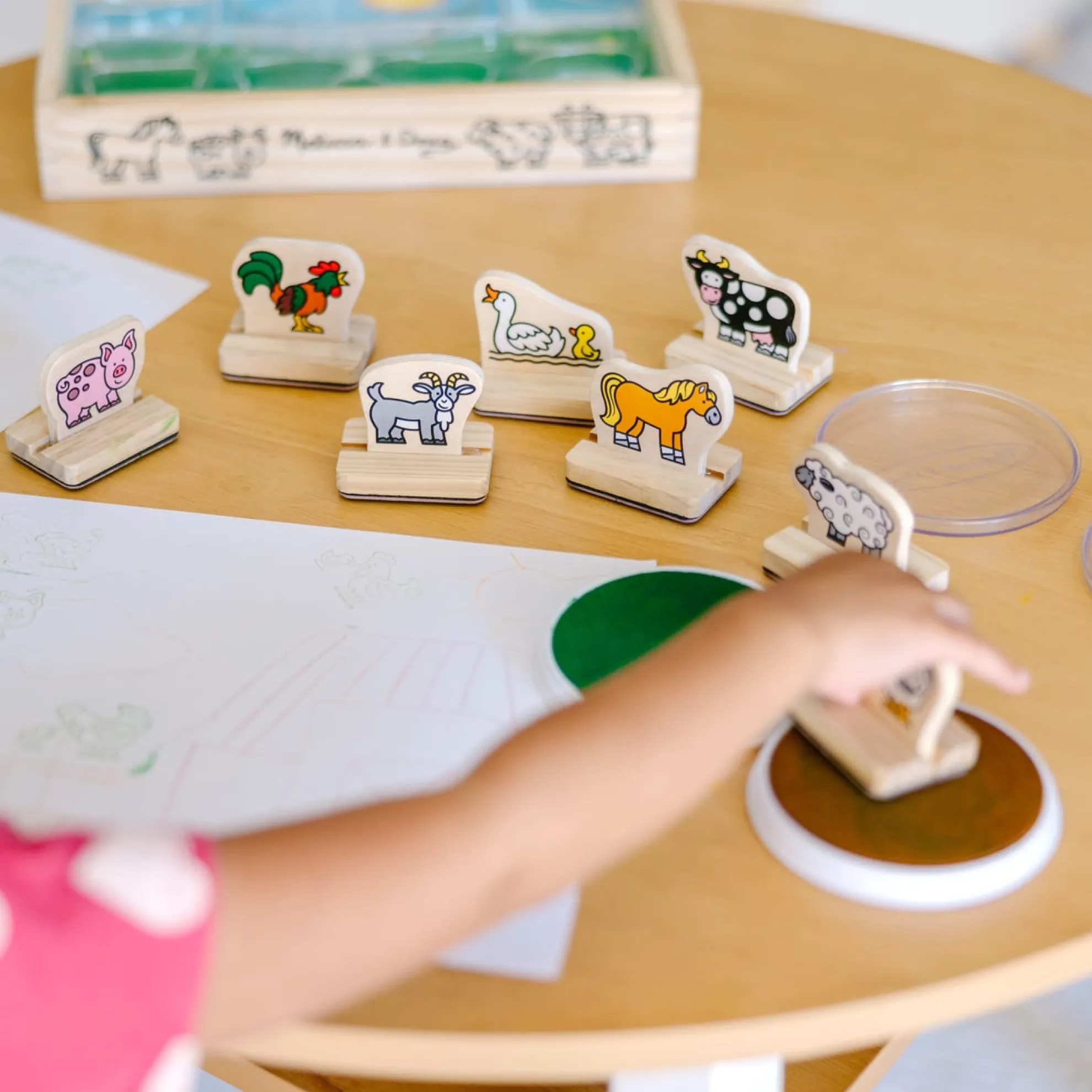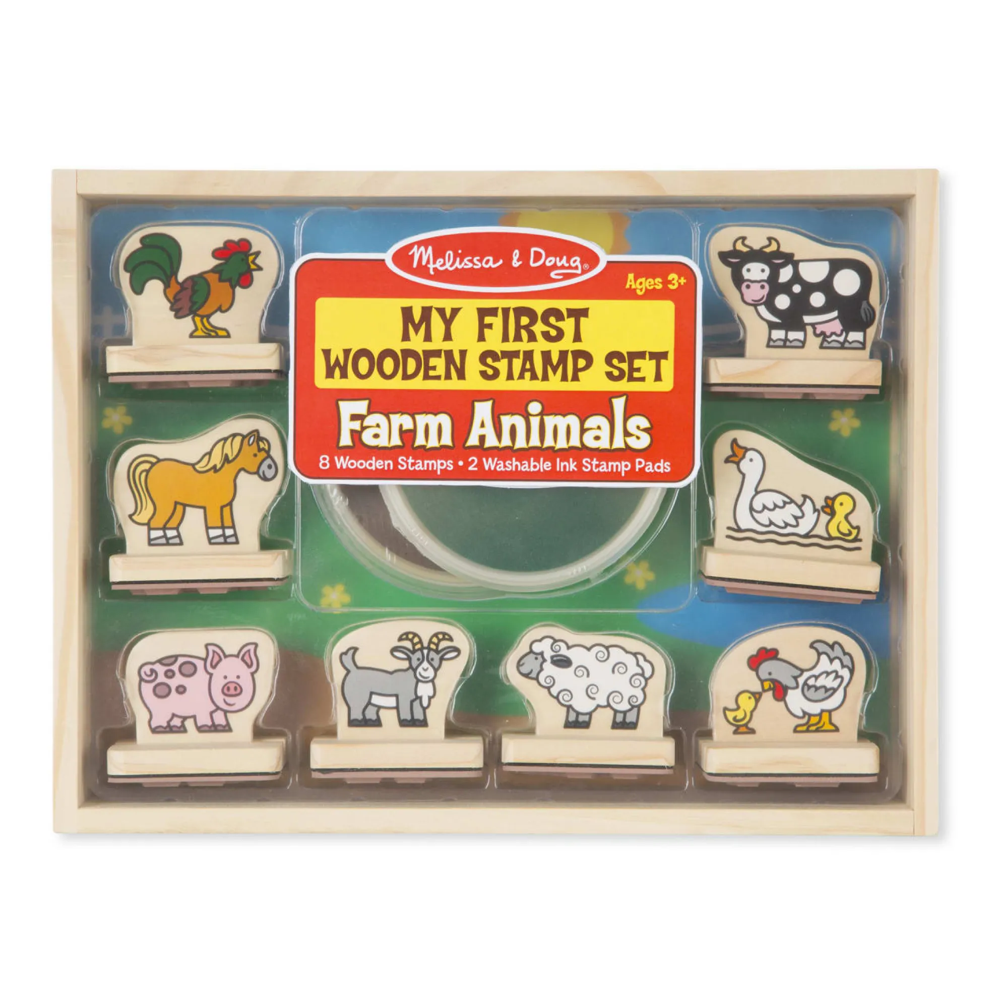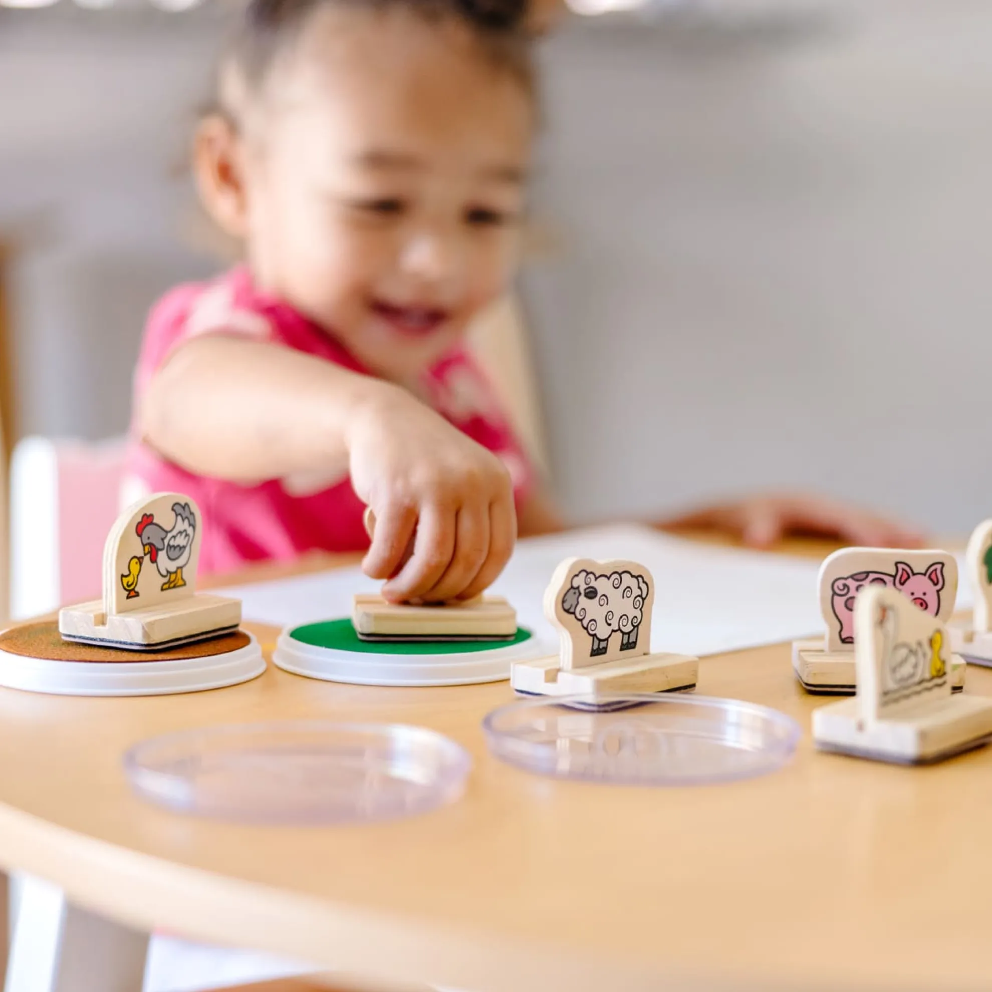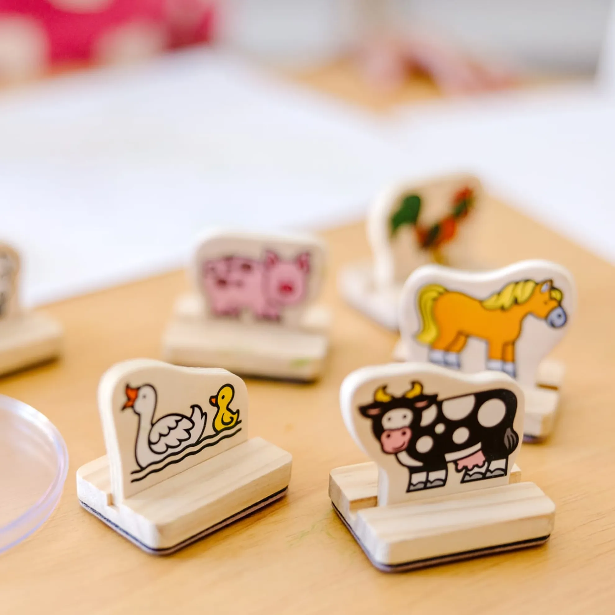 - Includes 8 wooden stamps featuring farm animals (rooster, cow, horse, sheep, pig, goat, chickens, ducks)