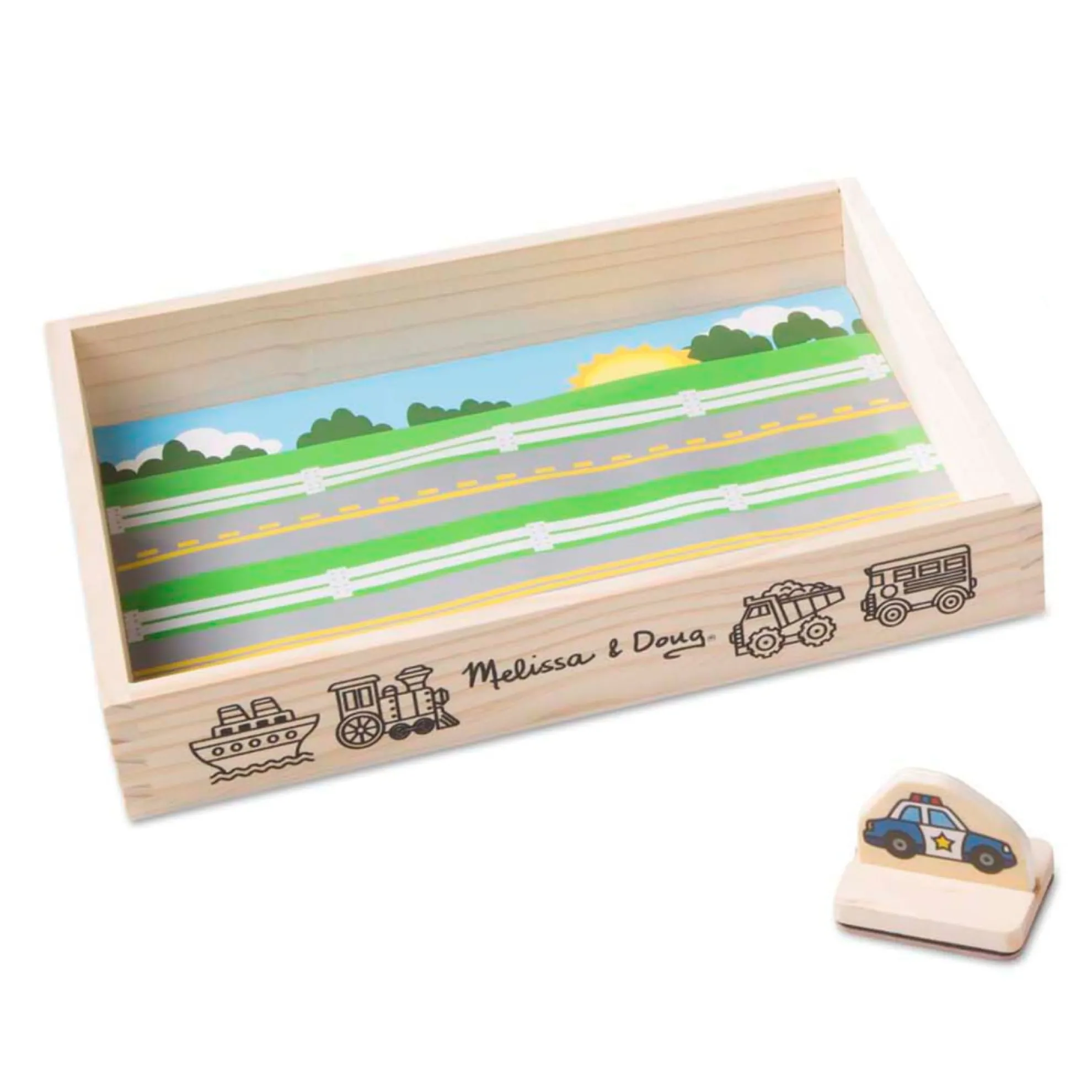 - Includes 8 wooden stamps featuring favorite vehicles (train, fire engine, dump truck, police car, airplane, tractor, ship, school bus)