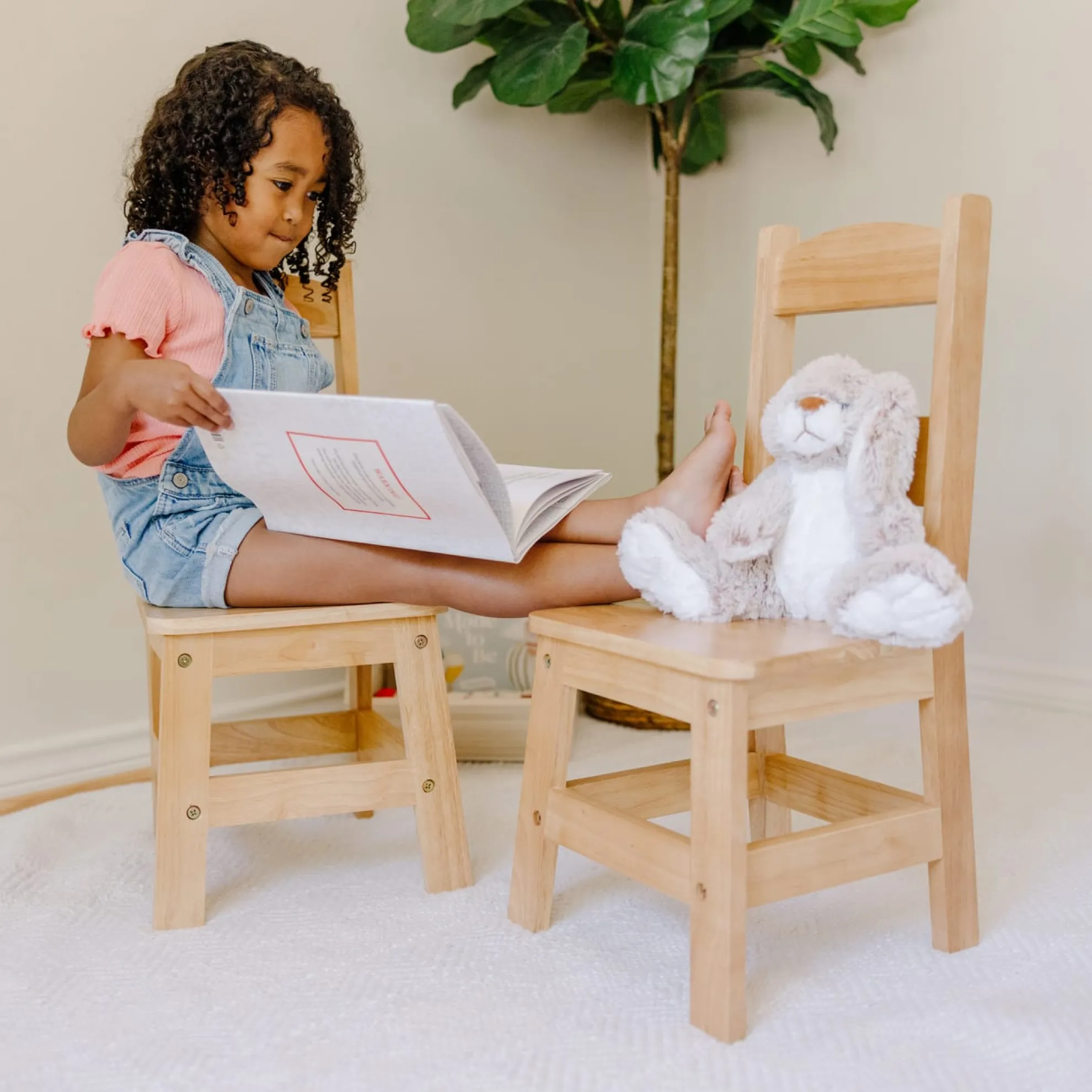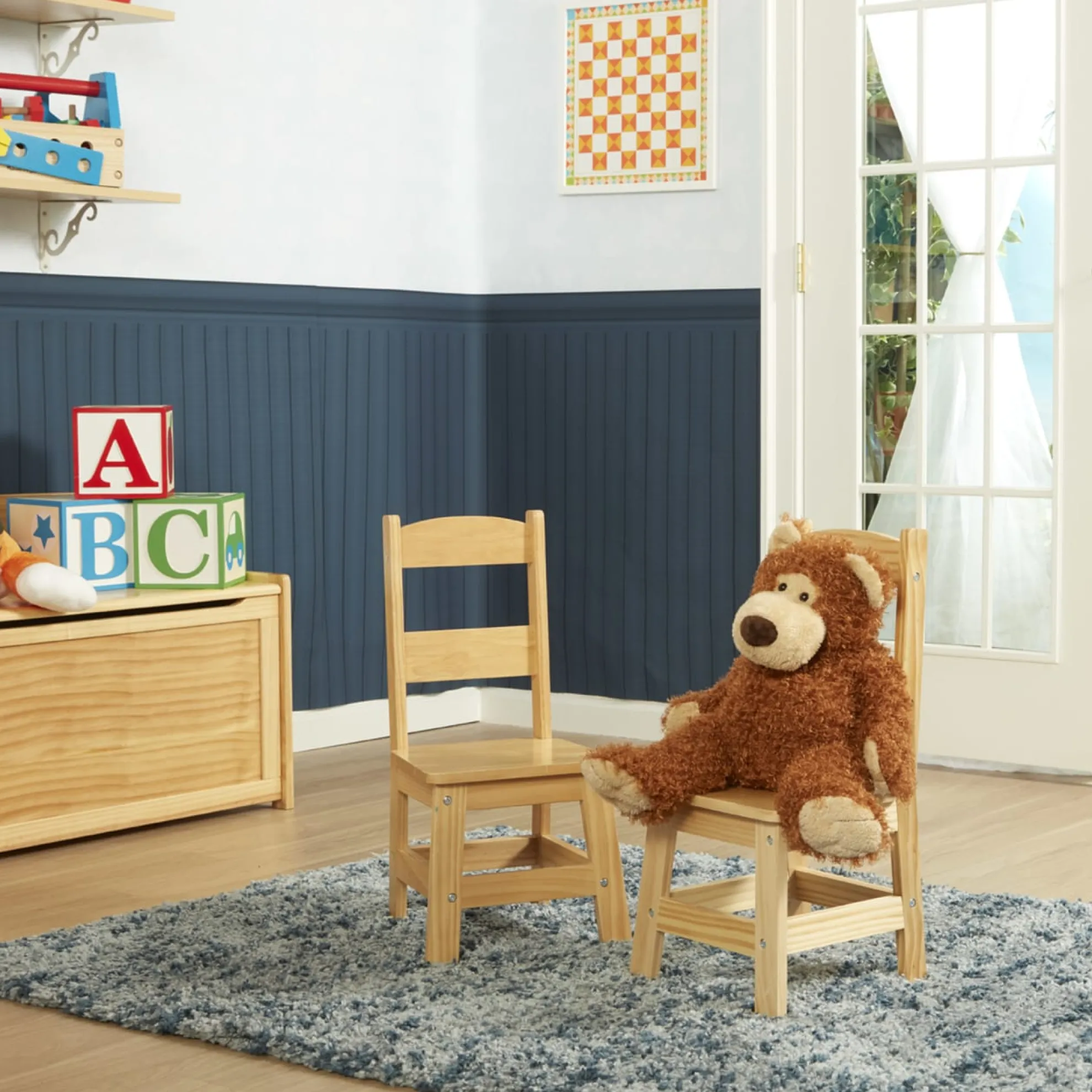 These two easy-to-assemble hardwood chairs have an 11-inch seat height that’s comfy for kids–plus durable solid-wood pieces and a reinforced, tip-resistant design that grown-ups can feel confident about, too. Add them to our Table & 2 Chairs Set to make room for a foursome, or use them on their own to create a child-friendly seating nook for two! Assemble with a Phillips-head screwdriver.