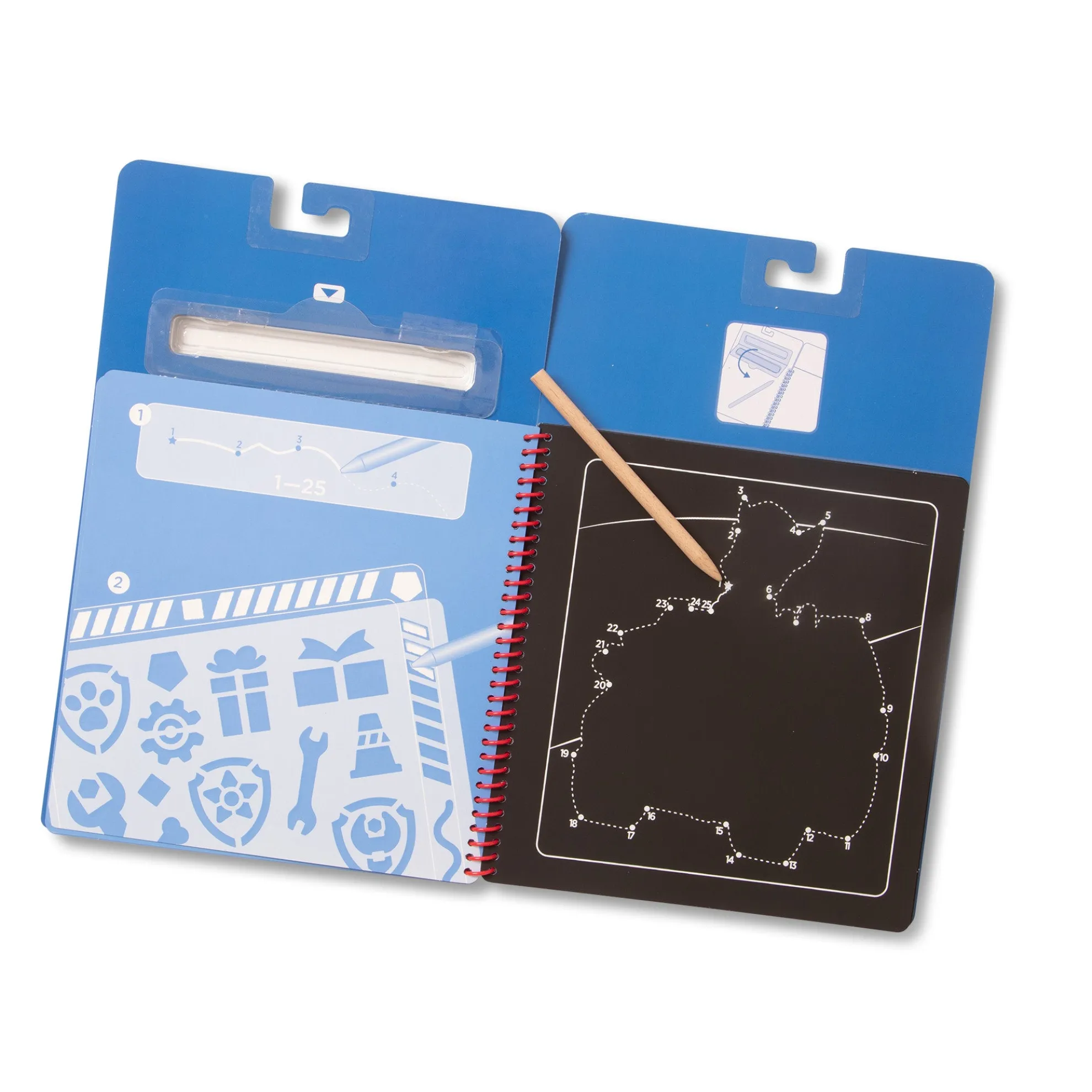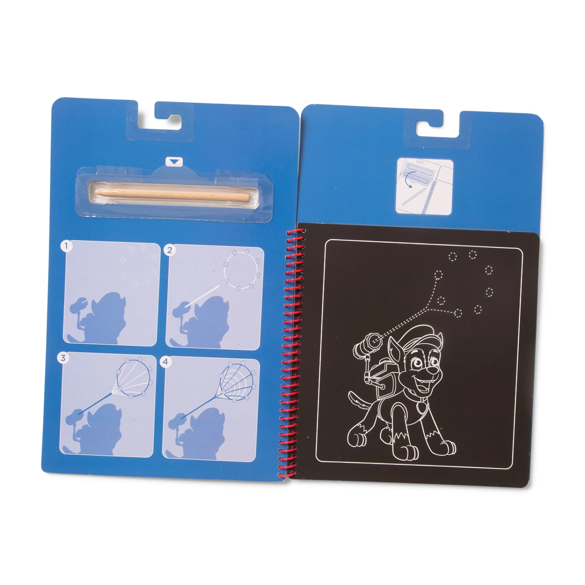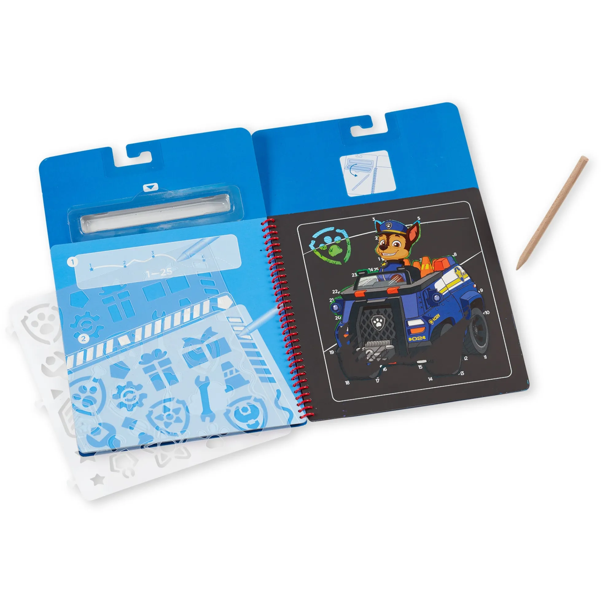 - 10 Scratch Art scenes featuring PAW Patrol pup Chase and friends with dot-to-dot or stencil activities on each page