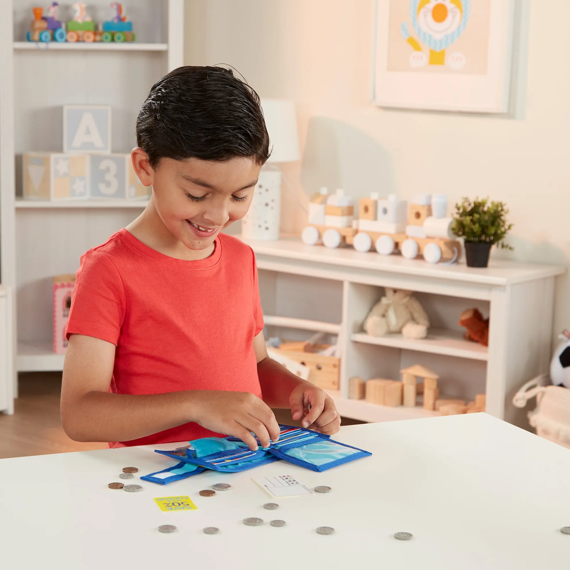 Make playful purchasing exciting with this 45-piece pretend play wallet, filled with everything kids need to run errands and go on make-believe shopping sprees! The folding nylon wallet with a self-stick tab closure has a long pocket to tuck away 14 play money bills, a see-through pouch for the 19 play coins, and handy slots for organizing 11 write-on cards, including bank cards, drivers license, library card, bus pass, and more! There are even “coupons” so young shoppers always get the best deals! This product is certified by the Forest Stewardship Council. FSC certification ensures that products come from responsibly managed forests that provide environmental, social, and economic benefits, and that forests are protected for future generations. Please note that FSC certification applies to new inventory only (FSC C156584).