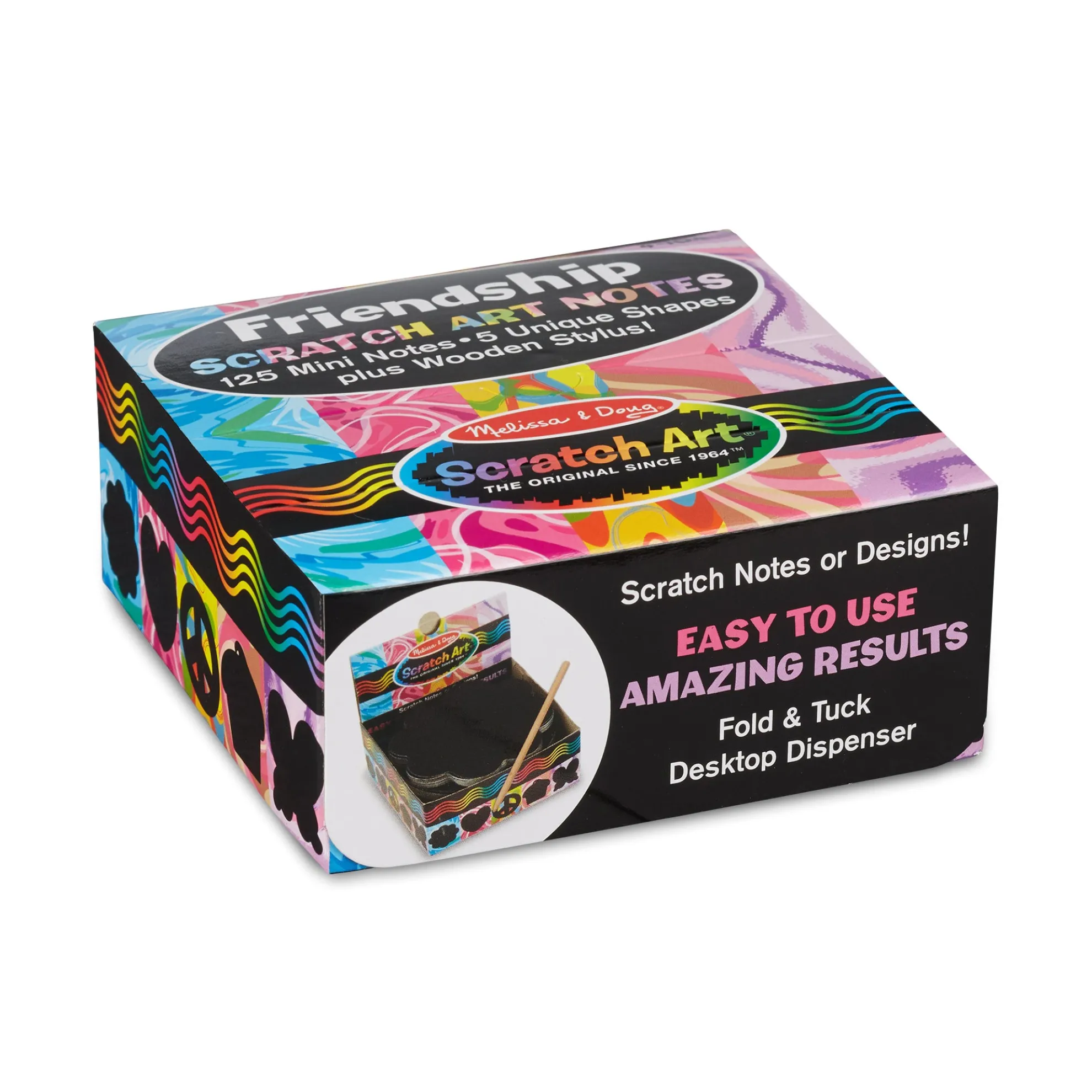 Simple to use, amazing results, and surprises revealed with every scratch, Scratch Art® Nature Notes are a unique way to create messages, designs, gift tags, and more! Scratch away at the black coating to reveal five different colorful patterns. Each box contains 125 notes (approximately 3.5 inches by 3.5 inches) in five friendship/favorite things-themed shapes (flower, heart, peace sign, cupcake, and butterfly). Kids four and older can use the wooden stylus to add designs, doodles, patterns, words, pictures and more to create truly one-of-a-kind works of art! Notes and stylus store in a handy desktop dispenser box.