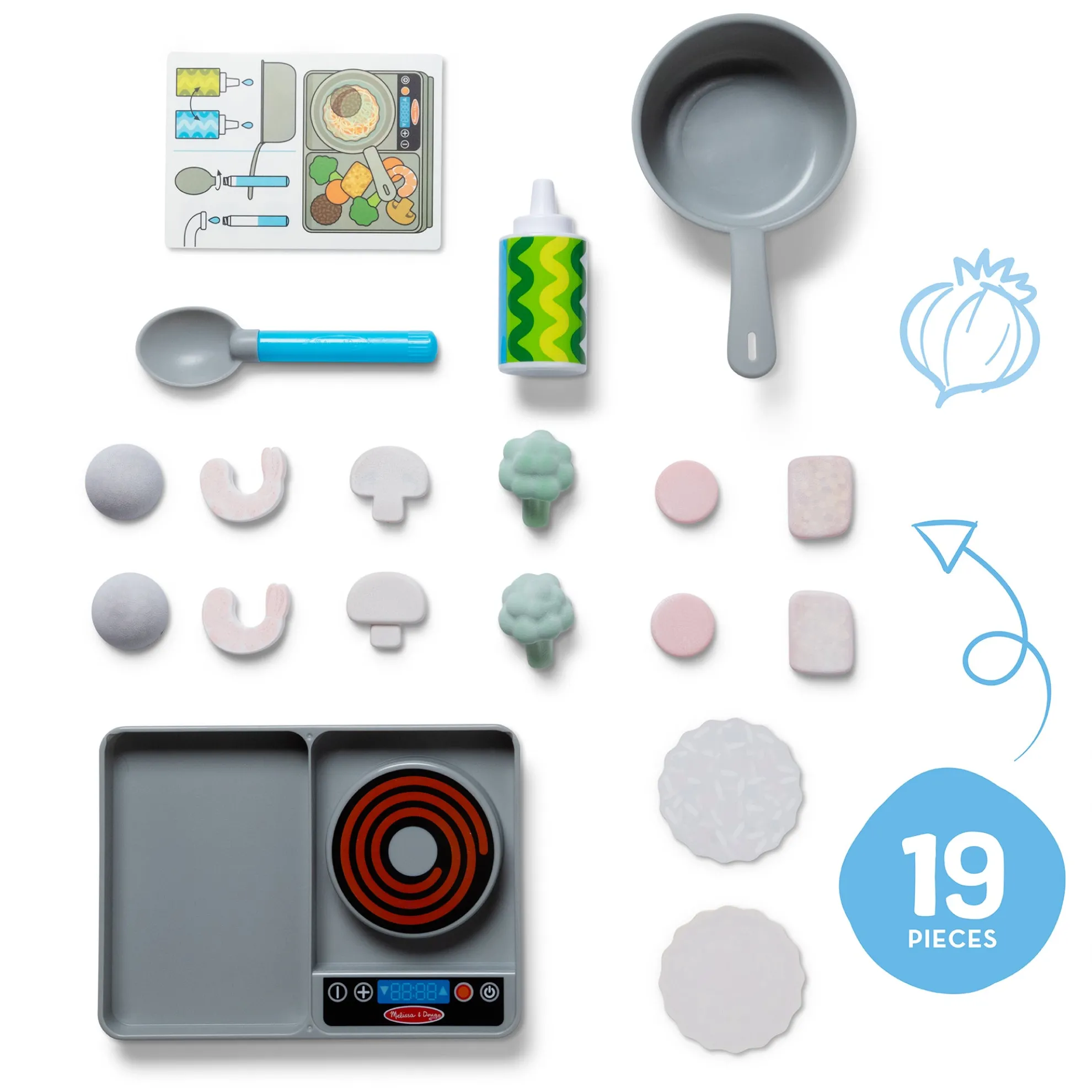 - Includes durable stovetop, water-dispensing spoon and squeeze bottle, cooking pot, 6 color-changing vegetables, 6 color-changing proteins, 2 color-changing meal disks, and double-sided reusable activity card