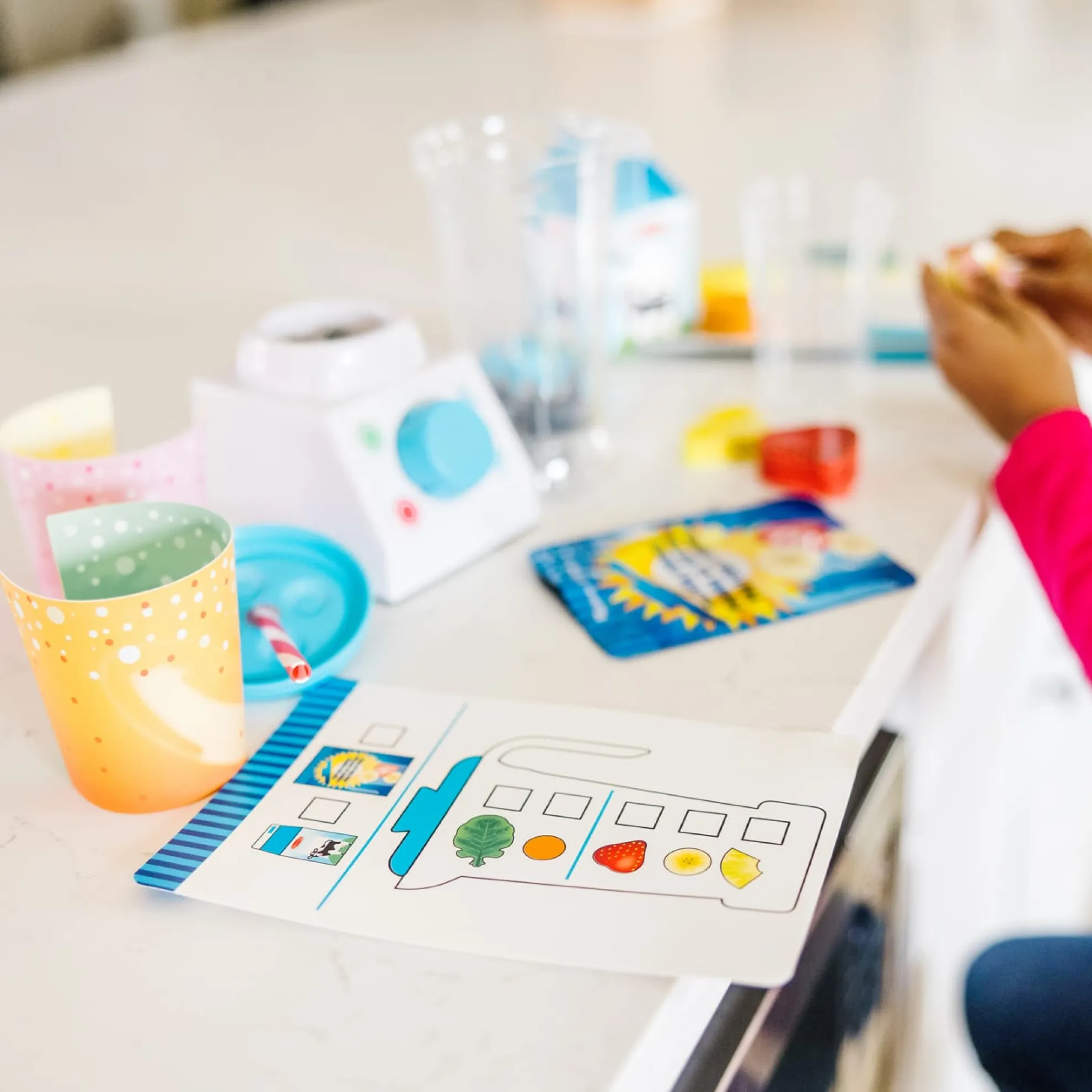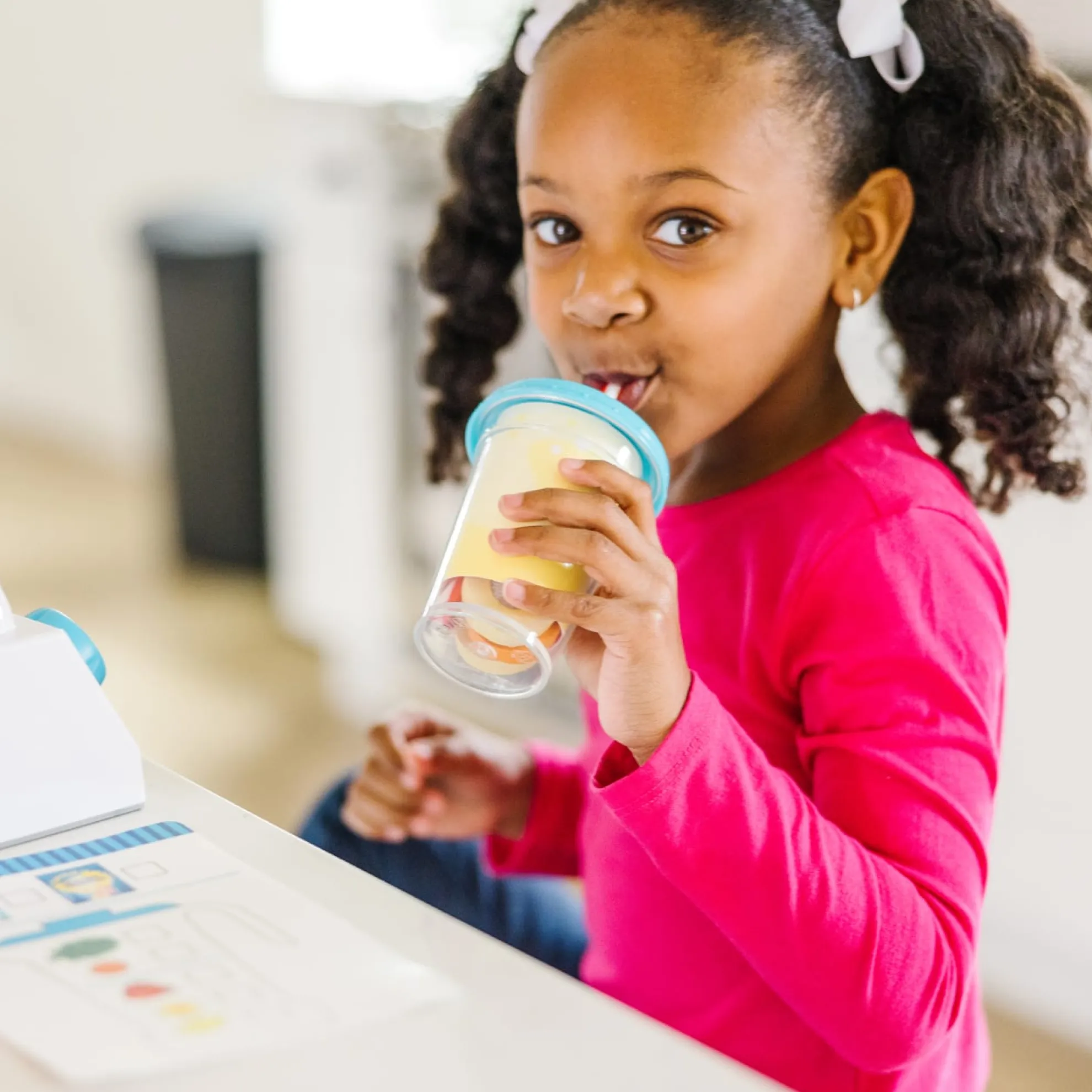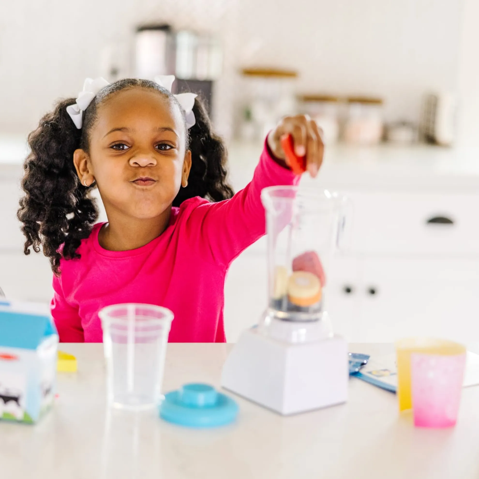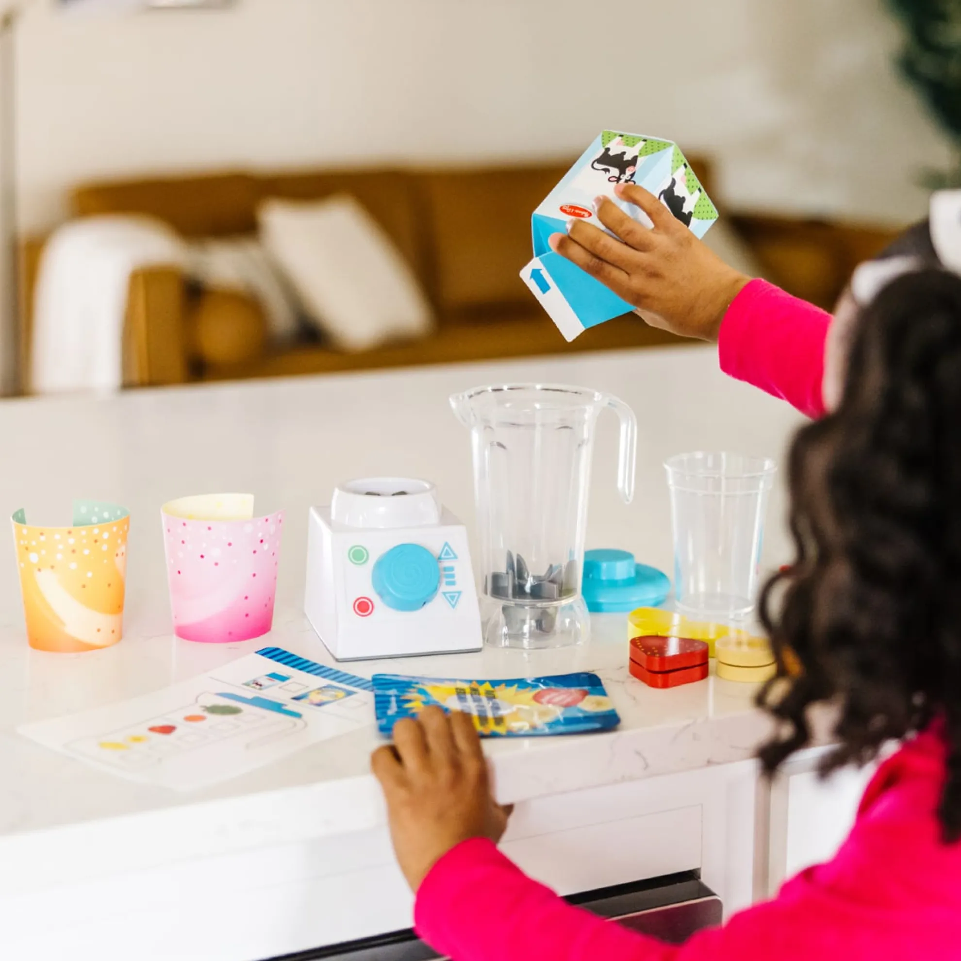 Whip up delicious playtime smoothies with this pretend play blender! Use the wooden knife to slice and wooden fruits and vegetables, choose other healthful ingredients, like kale or protein powder, and pop them in the blender. Add a dash of pretend milk, spin the dial to blend, pour into a cup with lid and straw, and serve! There’s a double-sided reusable menu card for taking orders, and cup inserts to add realistic color to smoothies. Any time is a good time for a smoothie!