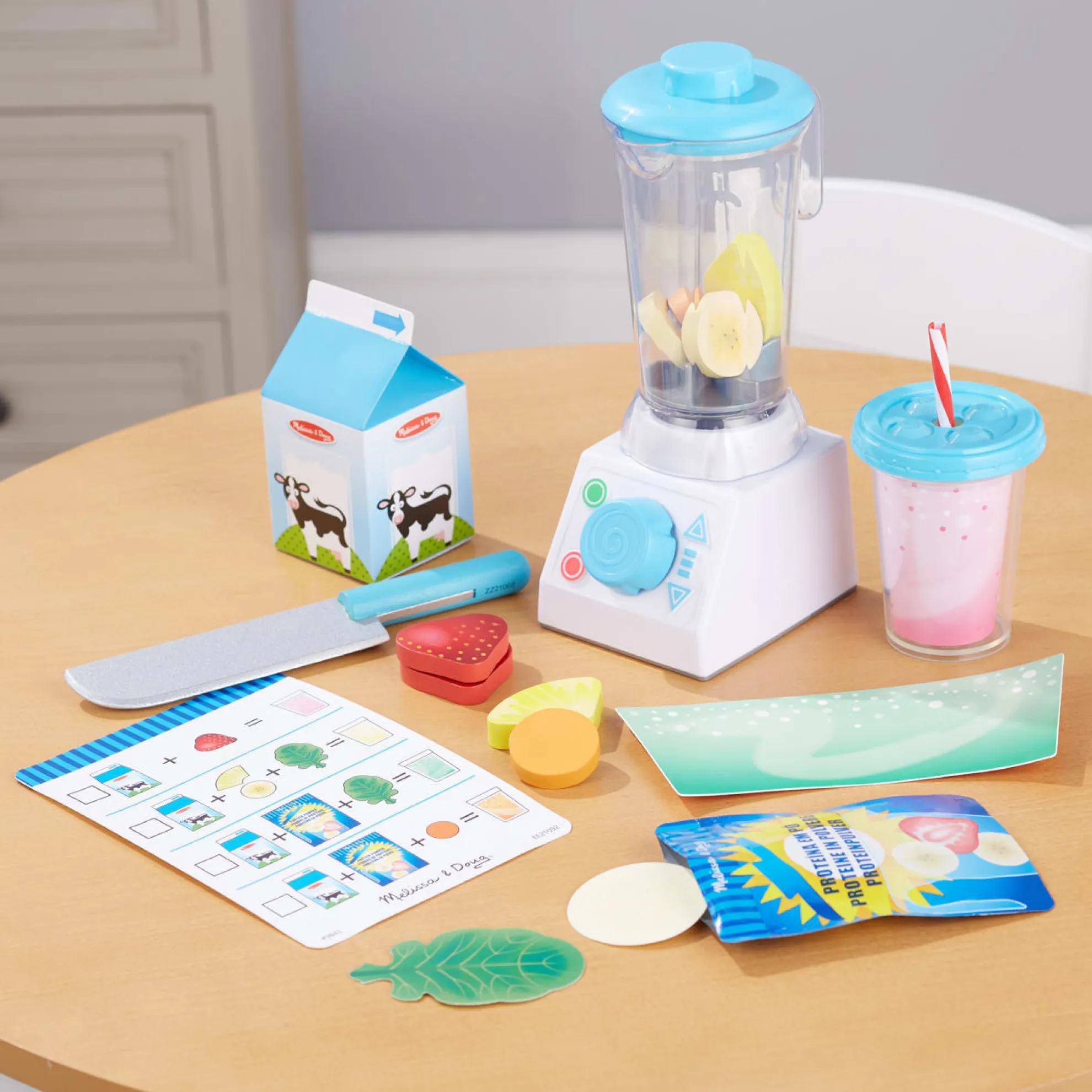 - Includes wooden fruit and vegetables to slice, kale leaf, protein powder disc in a pouch, milk carton, 2 double-sided cup inserts