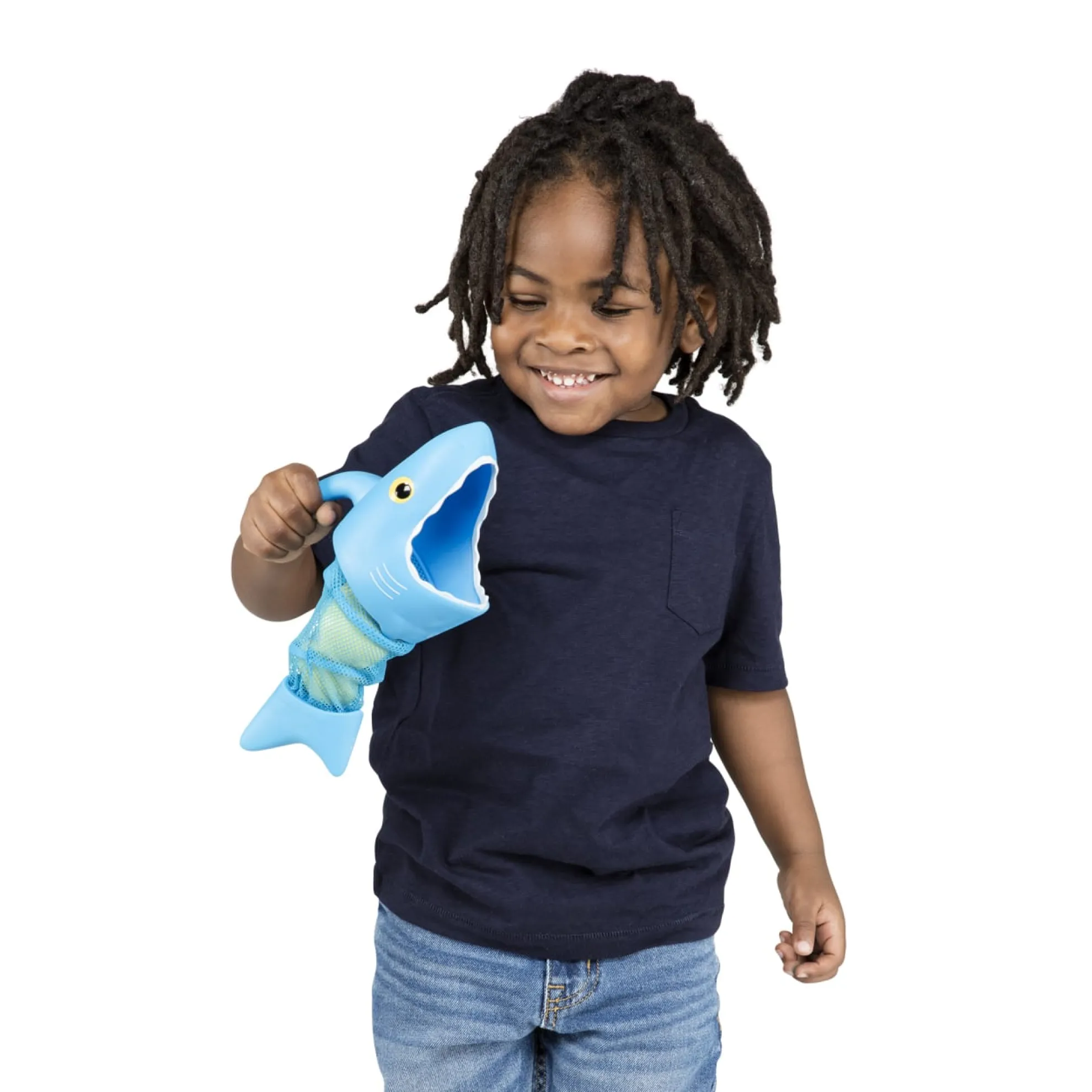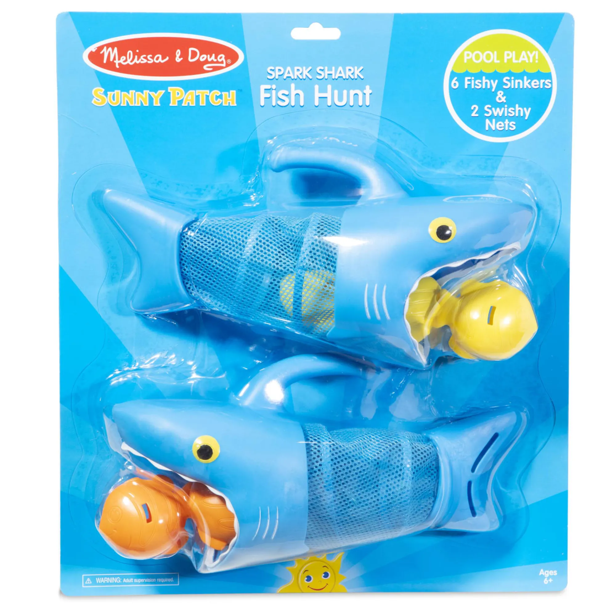 Speed like a hungry shark to gobble up tasty fish! Just grab onto the handle of a Spark Shark net and swim through the pool to scoop up the fishy sinkers. The set comes with two shark nets, six colorful sinkers and lots of play ideas for races, games and more!