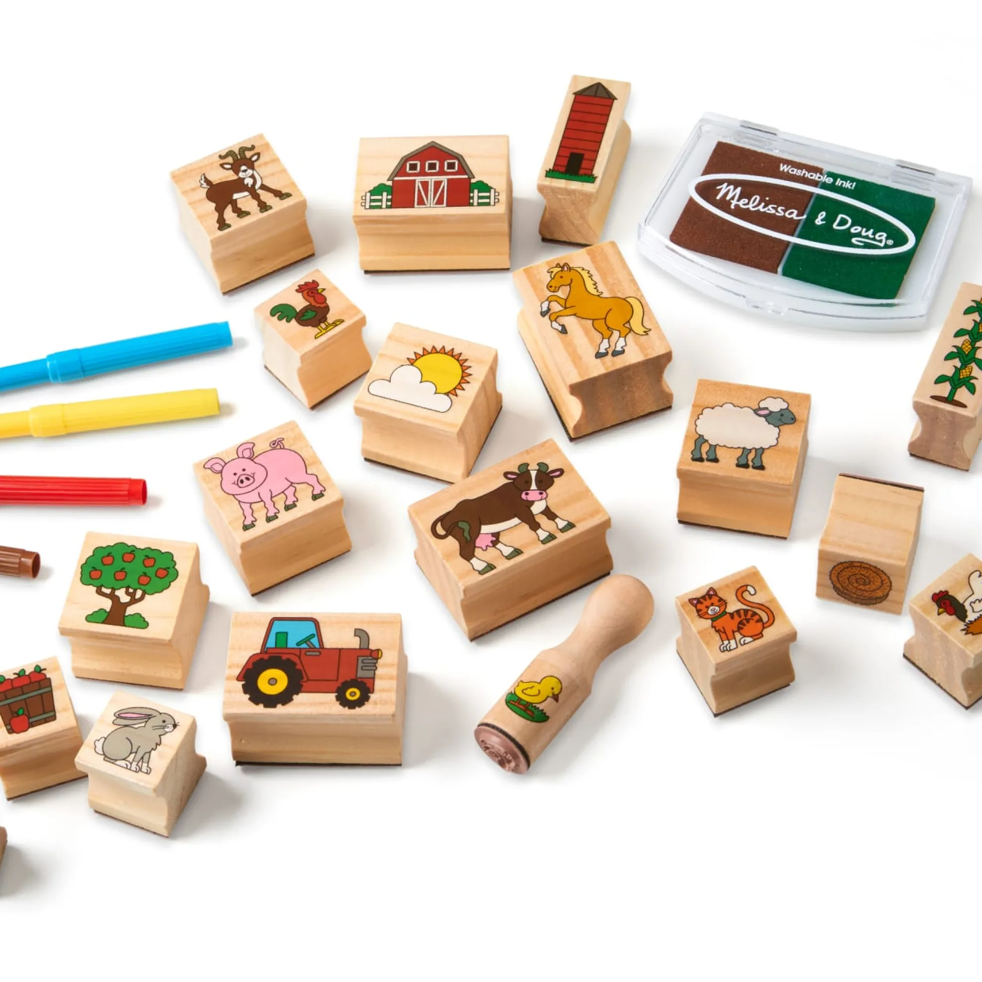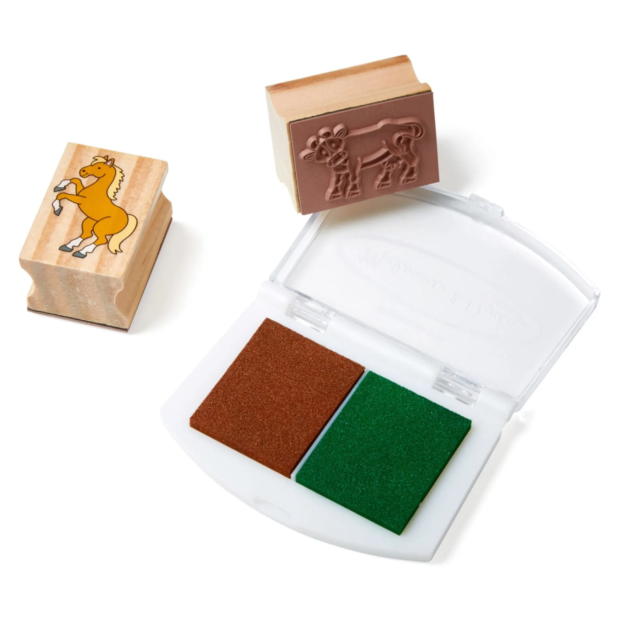 A barn, tractor, sheep, bunny, pig, and a barn’s worth of animals and crops come in this color-in stamp set for kids! This extra-large set of wooden stamps makes it easy to create an exciting storyline or a color-in scene: It includes 20 rubber-faced, wooden-handled outline stamps and a two-color stamp pad with brown and green washable ink. Five colored pencils coordinate with the farm theme to add details and color in the barnyard scene. It’s a complete arts & crafts activity and storytelling kit in one!